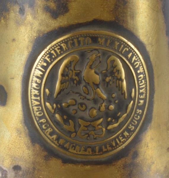 Mexican Revolution era bugle marked “EJERCITO MEXICANA” and includes mouthpiece. Rare Mexican Revolution era bugle.
