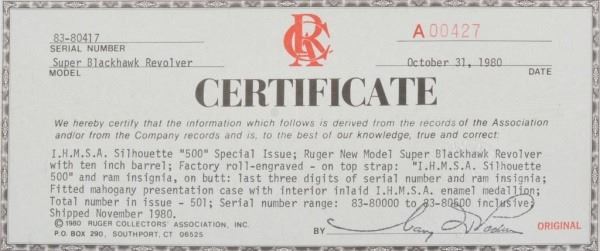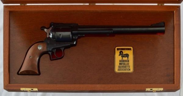 * Revolver. 10.5". S-410N. Walnut. Fitted Ruger Wood Case w/ISHMA Logo . 'ISHMA Silhouette 500' w/ISHMA Logo. Blued Steel. With RCA Certificate.