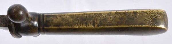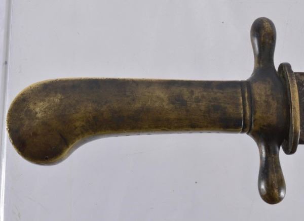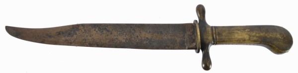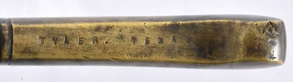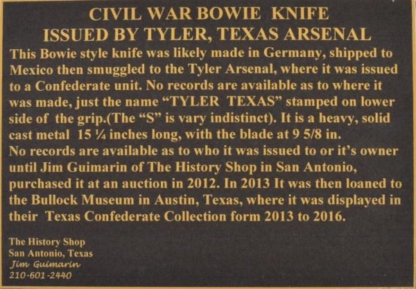 This Bowie style knife was likely made in Germany, shipped to Mexico then smuggled to the Tyler Arsenal where it was issued to a Confederate unit. No records are available as to where it was made, just the name "TYLER TEXAS" stamped on lower side of the grip. (The "S" is very indistinct). It is a heavy, solid cast metal 15-1/4" long, with the blade at 9-5/8". No records are available as to who it was issued to or it's owner until Jim Guimerin of San Antonio, Texas purchased it at an auction in 2012. In 2013 it was then loaned to the Bullock Museum in Austin, Texas, where it was displayed in their Texas Confederate Collection from 2013 to 2016.
