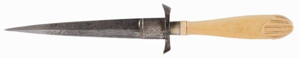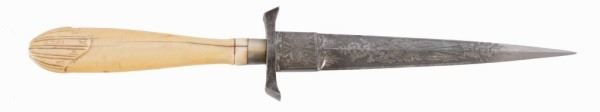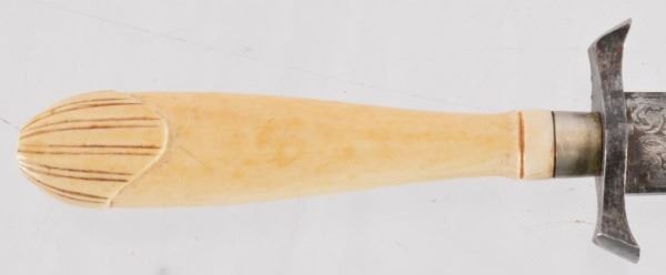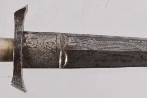 Spain. Butt of grip engraved with TEXAS and 1852. Scalloped engraving with double incised lines (12 pairs of lines). Blade engraved with floral type design. Good condition with crack down grip.