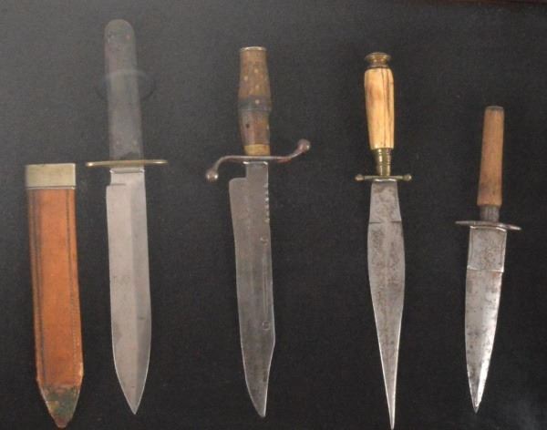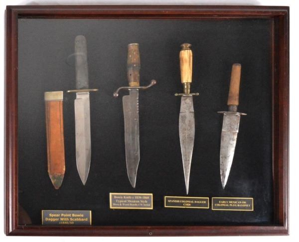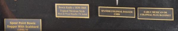 Spear Point Bowie Dagger with Scabbard, circa 1840/50; Bowie Knife Typical Mexican Style with Horn and Wood Handle CW Initial, circa 1830-1860; Spanish Colonial Dagger, circa 1820; and Early Mexican or Colonial Plug Bayonet.