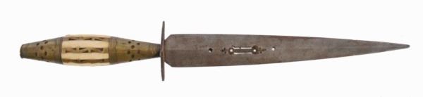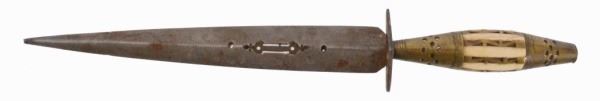 Good condition. 7-3/4" blade with poison, wall diamond blade with scrollwork ivory grip with brass inlay, which could have been used as a bayonet.