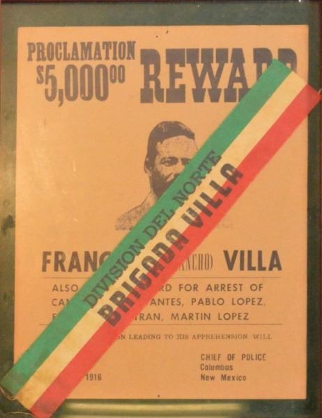 original Pancho Villa Wanted poster circa 1916. With Brigada Villa silk Arm Band. Due to lack of uniforms, members of Villas army would wear the silk arm bands.
