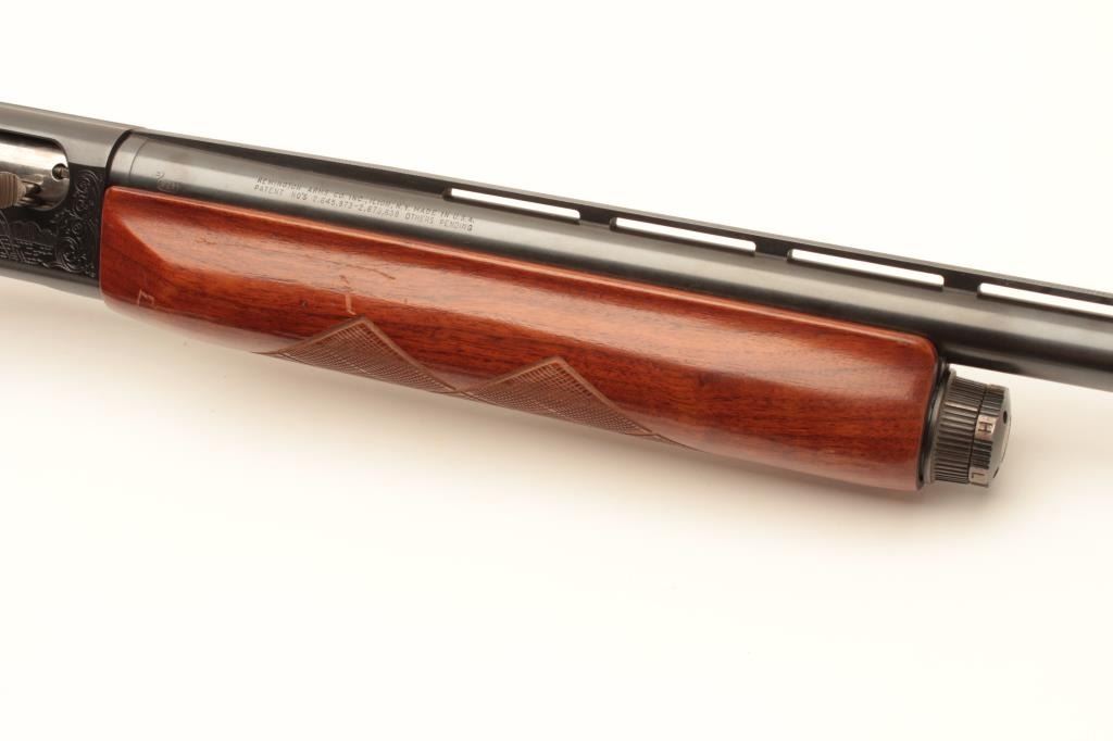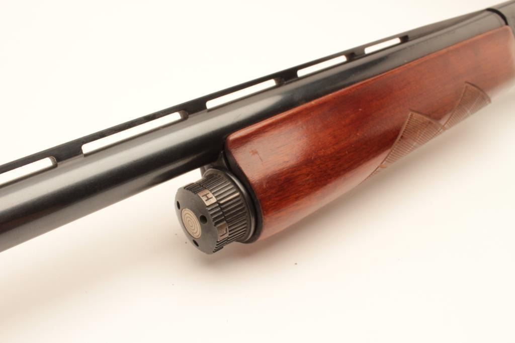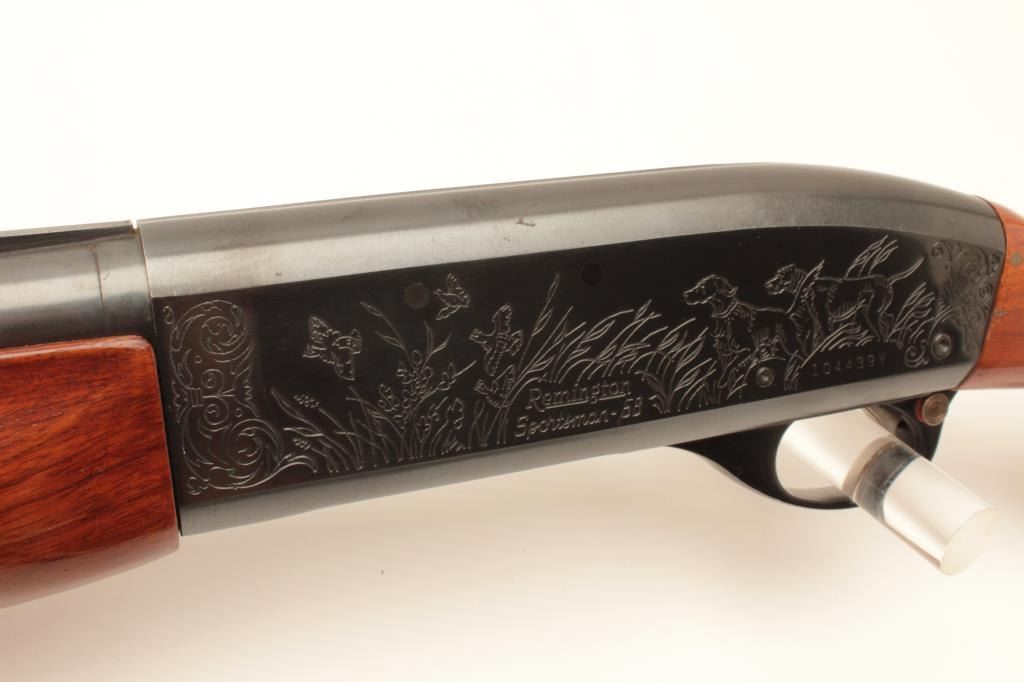Remington Sportsman Model 58 semi-automatic shotgun, 12 gauge, Serial #104439V. The shotgun is in very good overall condition with a 30” barrel with a steel bead front sight and full-length ventilated rib. The Lot Title barrel and receiver retain the majority of their blue finish with only light handling marks noted. The checkered wood stocks are in good condition with small mars and some paint spots at the wrist. The butt ends with Lot Title a plastic Remington marked butt plate providing a 14” LOP. The lot includes an additional 26” Remington barrel. The bore is good, the markings are sharp and the action is crisp. Est.: $300-$600. (Modern).
