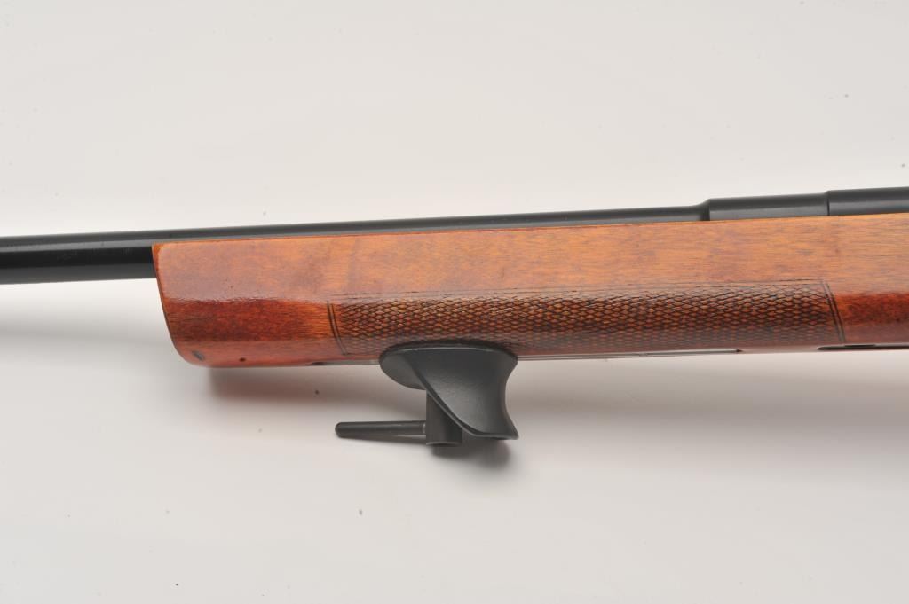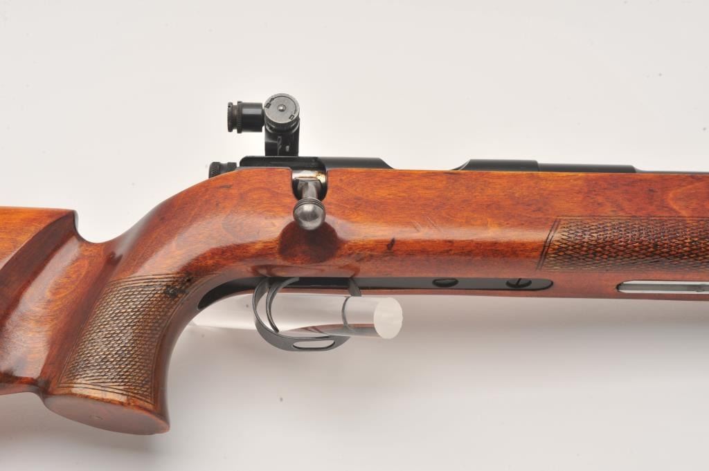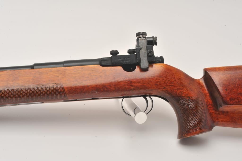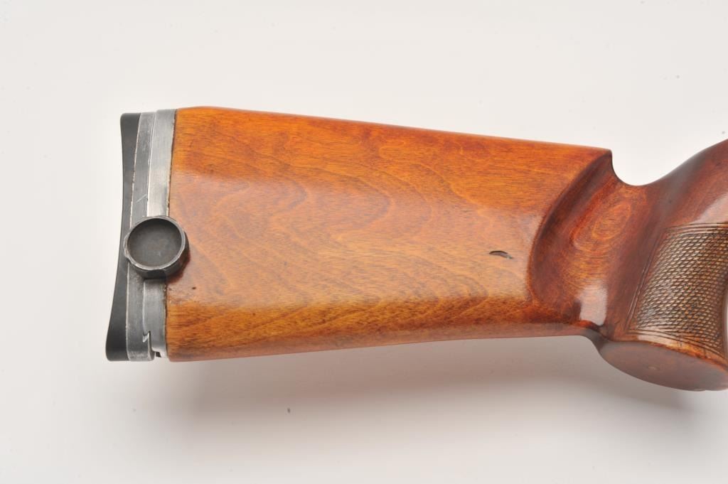 Russian Vostok bolt action single shot target rifle, .22 caliber, Serial #M11158. The rifle is in very good overall condition with a 26 ½” heavy target barrel with match hooded globe front sight and rear aperture sight Lot Title added at the tang. The barrel is import marked on the underside. The metal surfaces retain the majority of their blue finish with just storage marks. The checkered wood target stock is in very good condition with Lot Title light handling marks. The butt ends with an adjustable rubber butt plate. The bore is dirty but should clean to good, the action crisp and markings are sharp. Est.: $500-$1,000. (Modern).