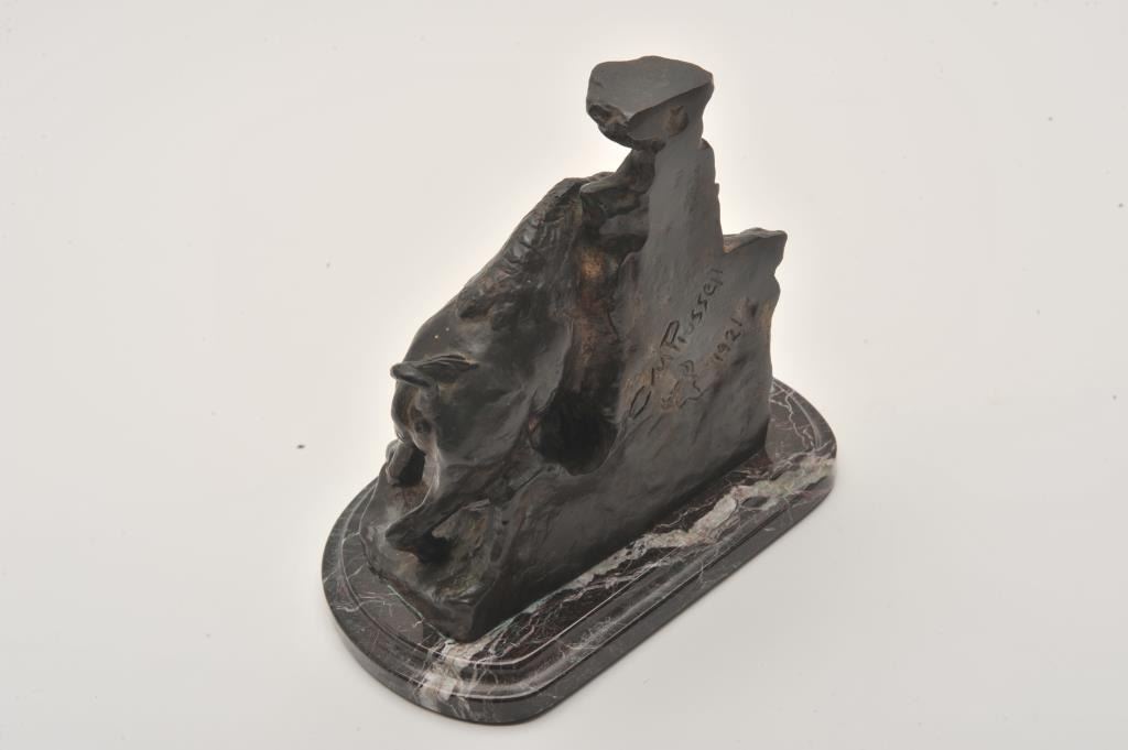 Recast of a 1921 C.M. Russel Buffalo bronze. The recast is beautifully displayed on a marble base; approximately 7 ½” in height and 8” in length. The bronze features outstanding detail with a great patina. The Lot Title back is marked, C.M. Russel 1921, with a buffalo skull. A really nice decorator piece based on a classic work. Est.: $300-$600.