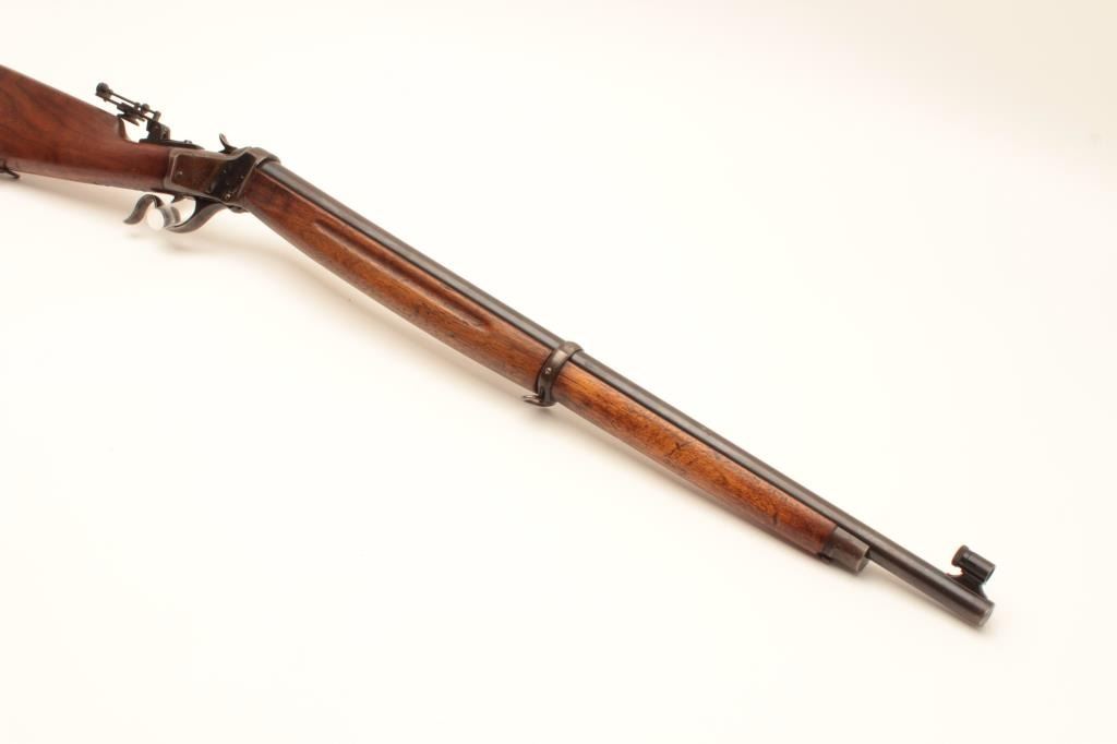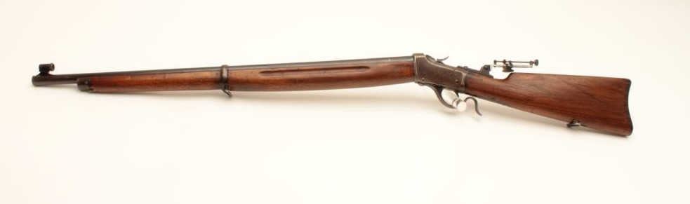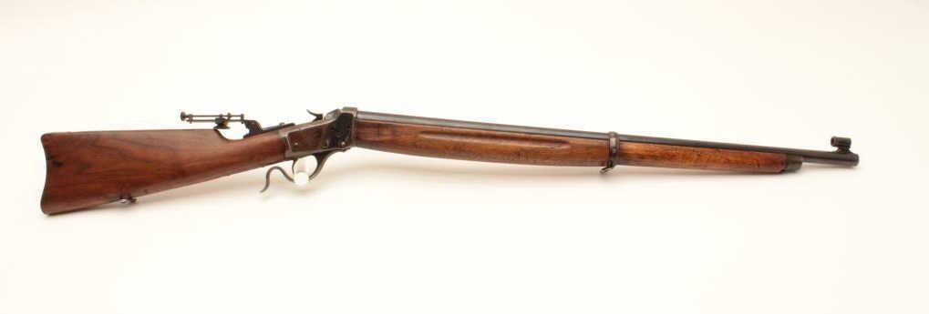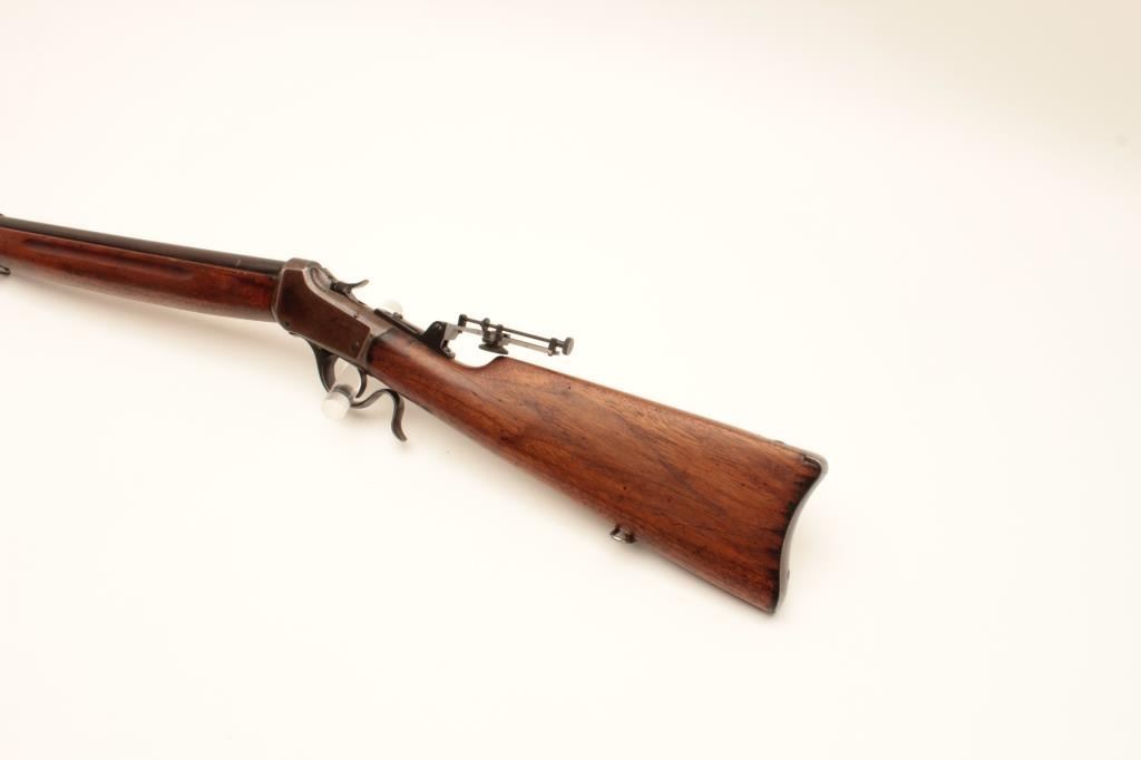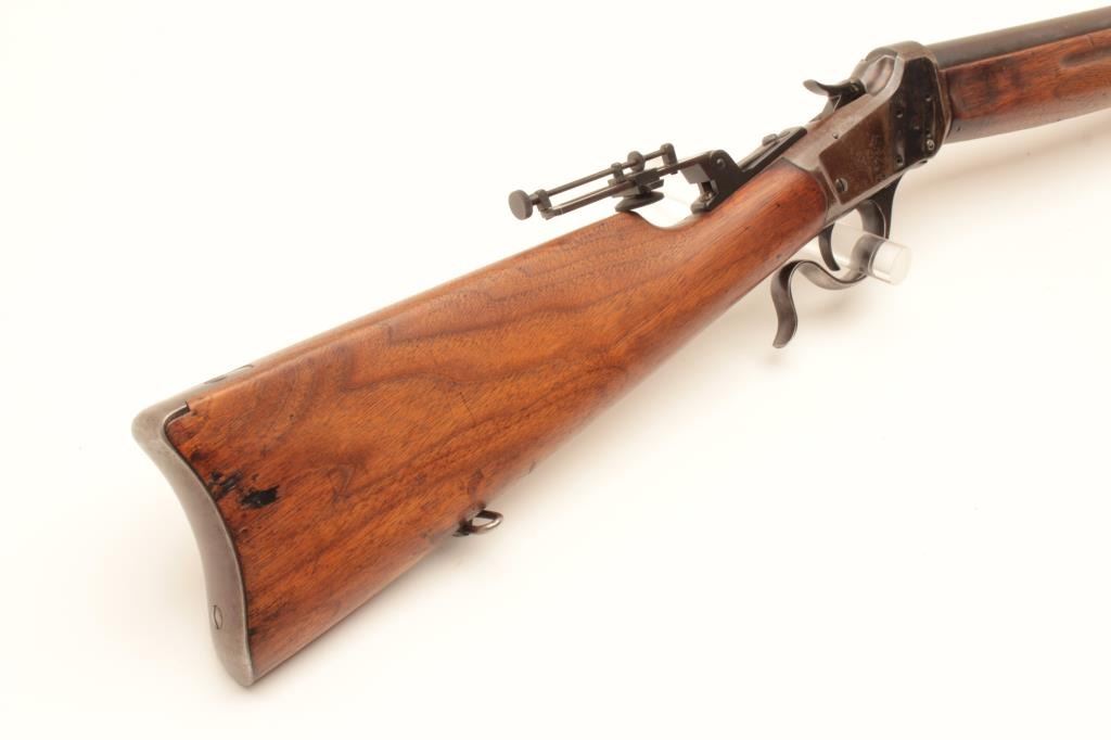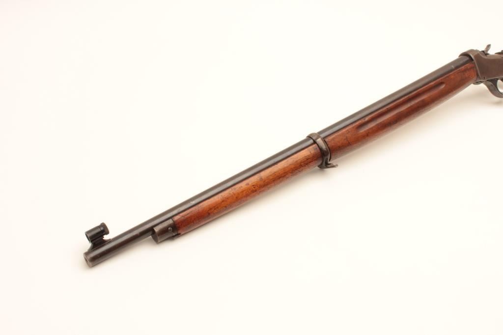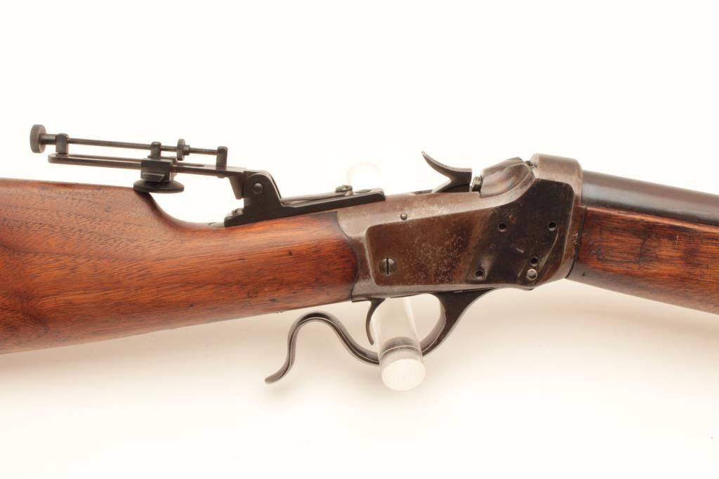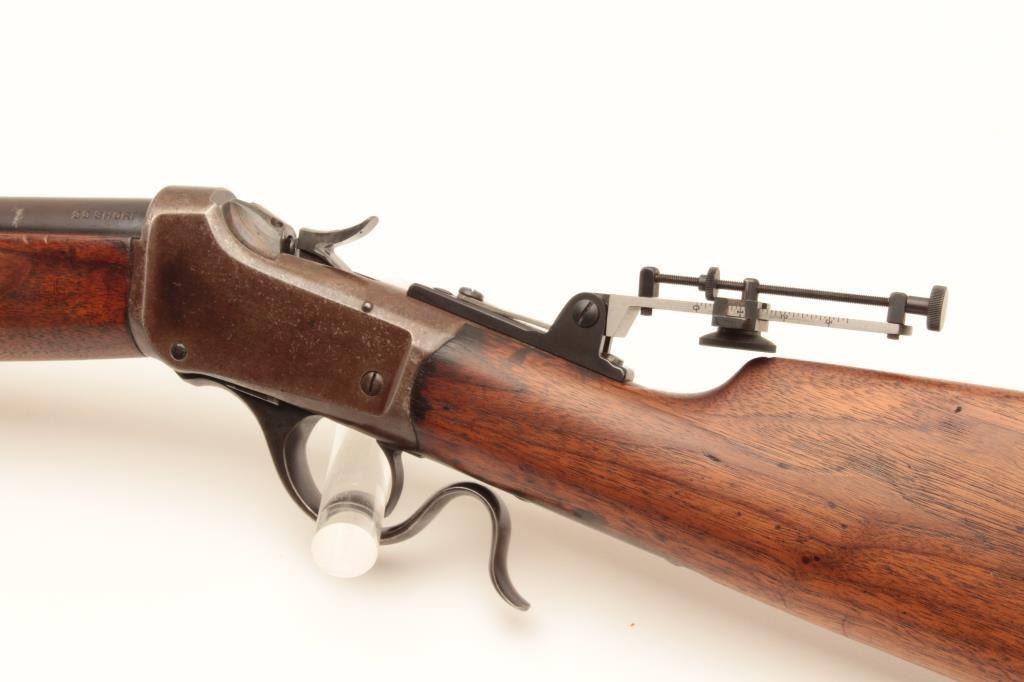 Winchester Low-Wall Winder single shot musket, .22 caliber, Serial #124264. The rifle is in good overall condition with a 28” barrel. The barrel retains a significant amount of its muted blue finish with a Lot Title replacement globe target front sight. The receiver has gone primarily brown patina with some old flaking blue still present wear at side mount sight was removed, leaving four open holes on the right side and is martially Lot Title marked, US at the tang. A Vernier style tang sight has been added during the period of use. The smooth wood stock is in good condition showing heavy use with mars and compressions. The butt ends with a smooth, Lot Title steel crescent butt. The bore is fair, the markings are legible and the action is crisp. Est.: $400-$800. (C+R).