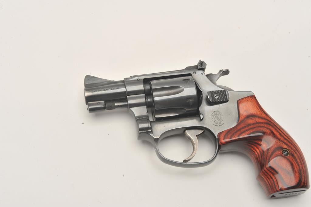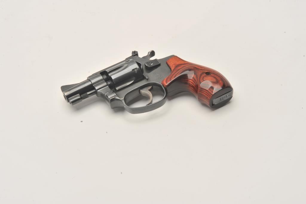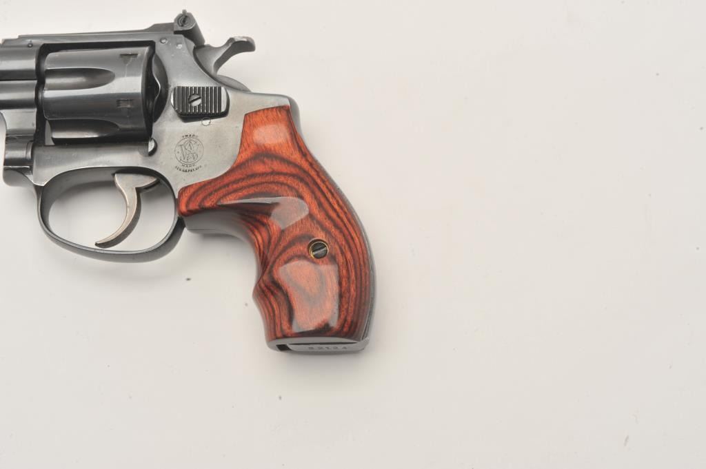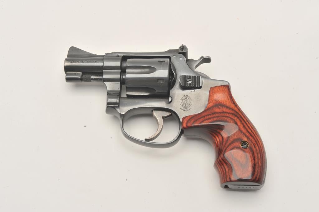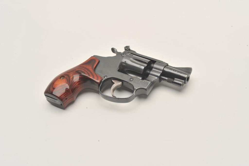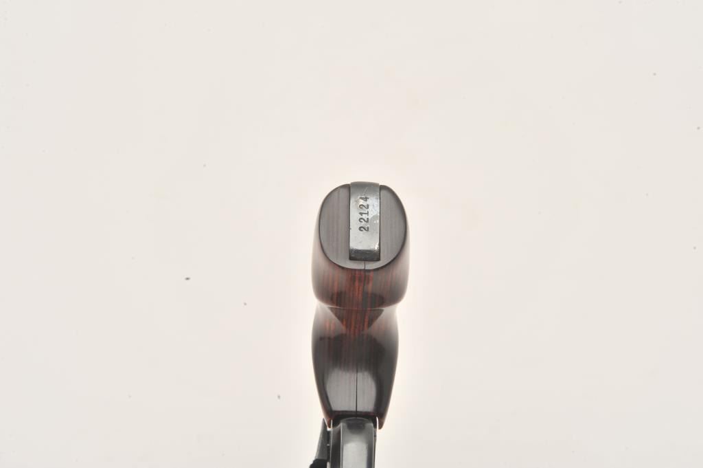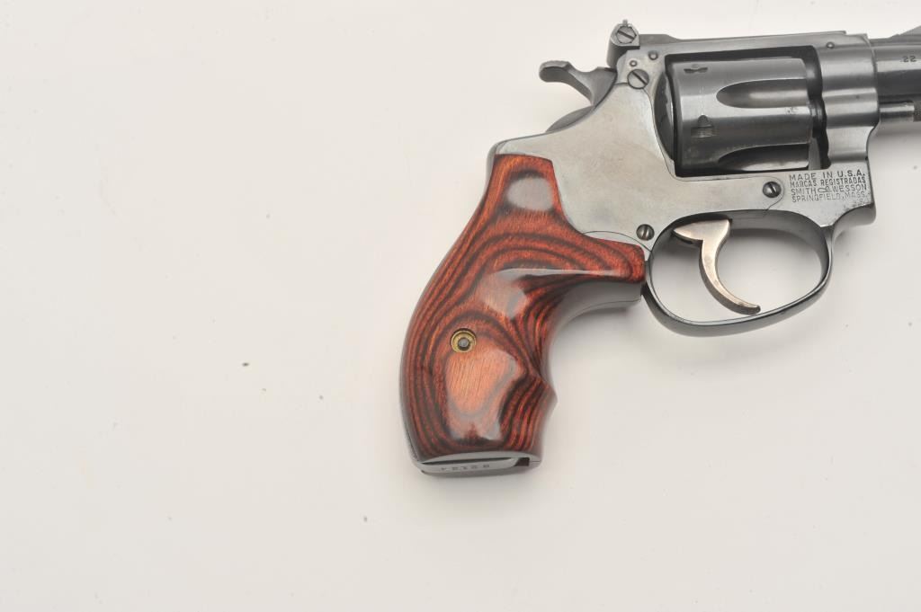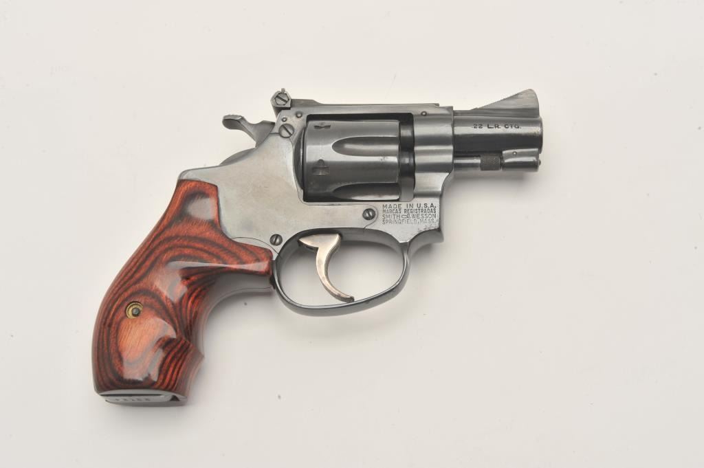 Smith & Wesson 22/32 revolver, .22 LR caliber, Serial #22124. The pistol is in very good overall condition with a 2” barrel. The pistol retains the majority of its blue finish with wear at the muzzle and light Lot Title handling marks associated with carry and use. The custom laminate wood grips are in very good condition. The bore is good, the action crisp and markings are sharp on this nice S&W kit gun. Est.: $600-$1,200. (Modern).