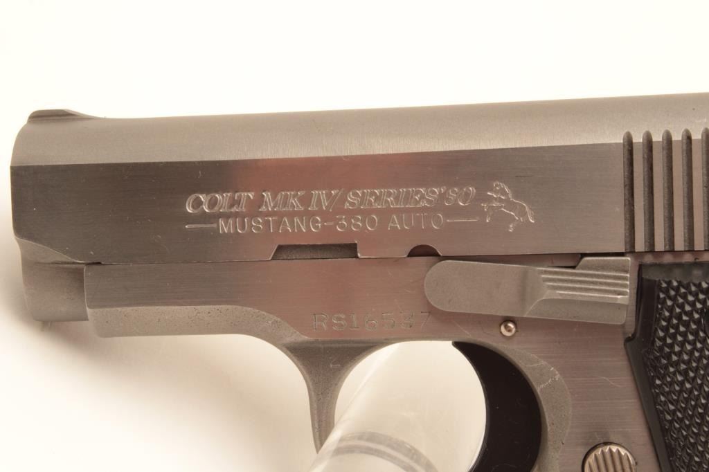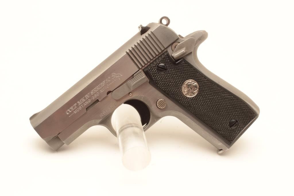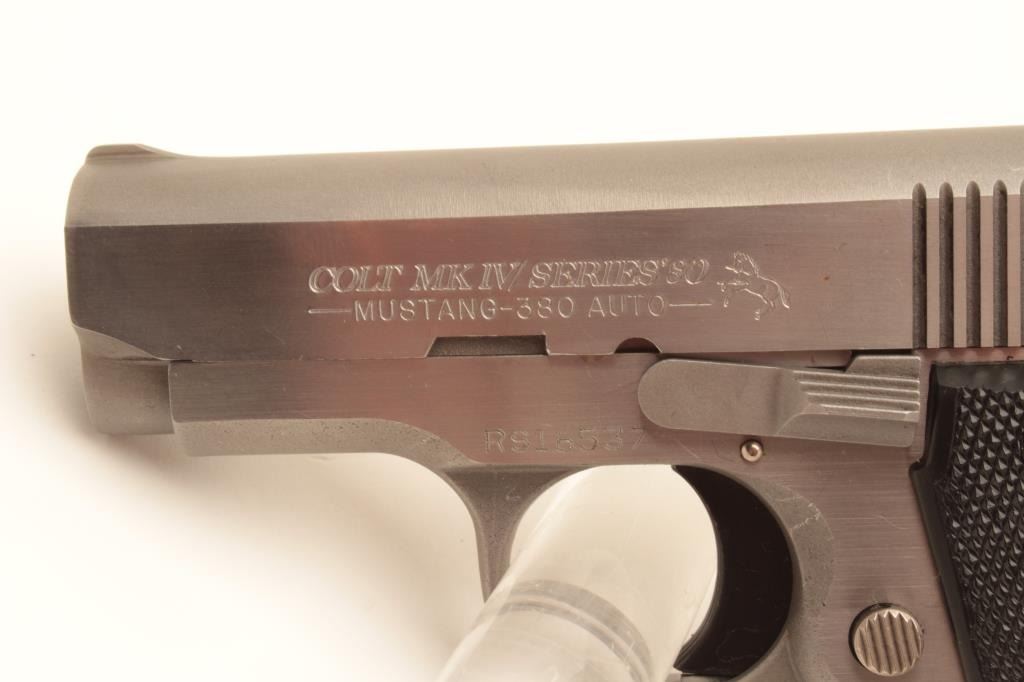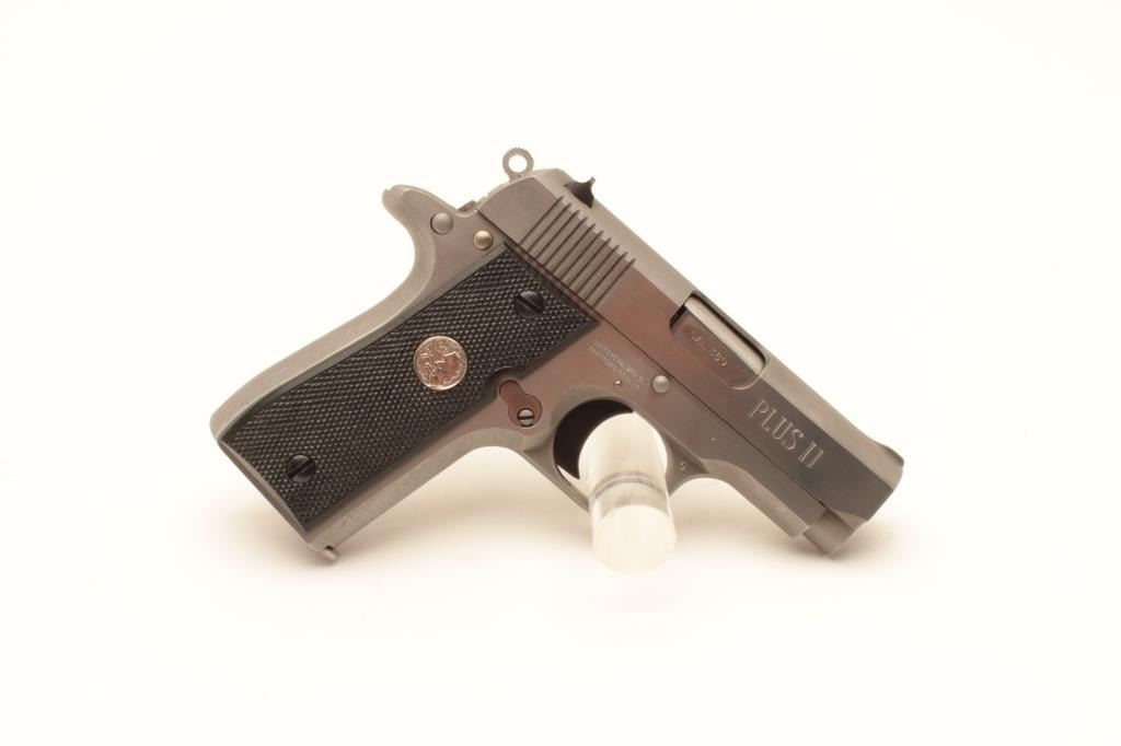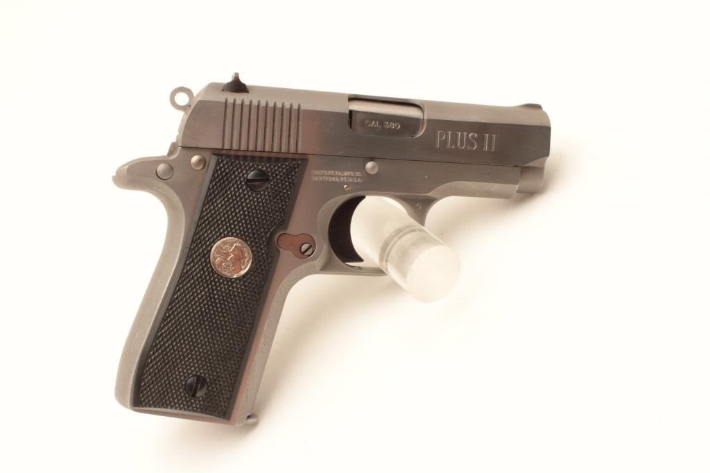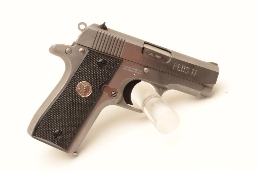 Colt MK IV Series 80 Mustang Plus II semi-automatic pistol, .380 caliber, Serial #RS16537. The pistol is in fine overall condition with 2 ¾” barrel. The pistol retains nearly all of its stainless finish Lot Title with only light handling marks noted. The checkered plastic silver medallion grips are in very good condition showing only light marks from storage. The bore is good, the action is crisp and markings are sharp on Lot Title this desirable little Colt. The lot includes three correct Colt marked magazines. Est.: $500-$1,000. (Modern).