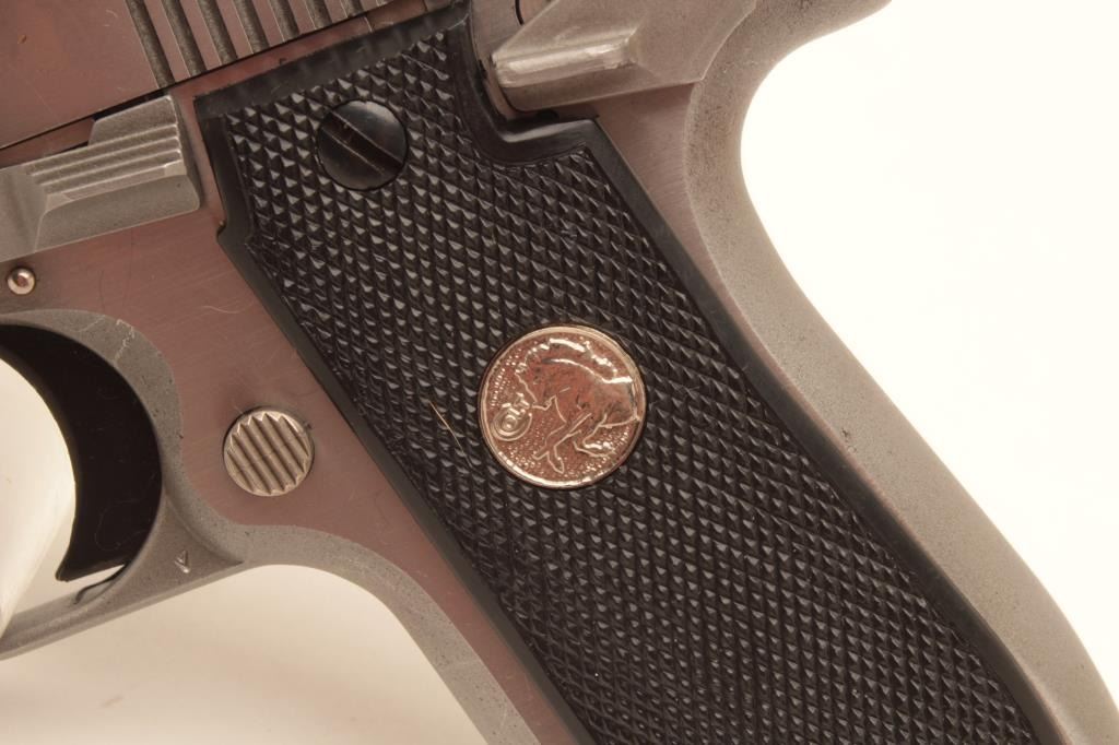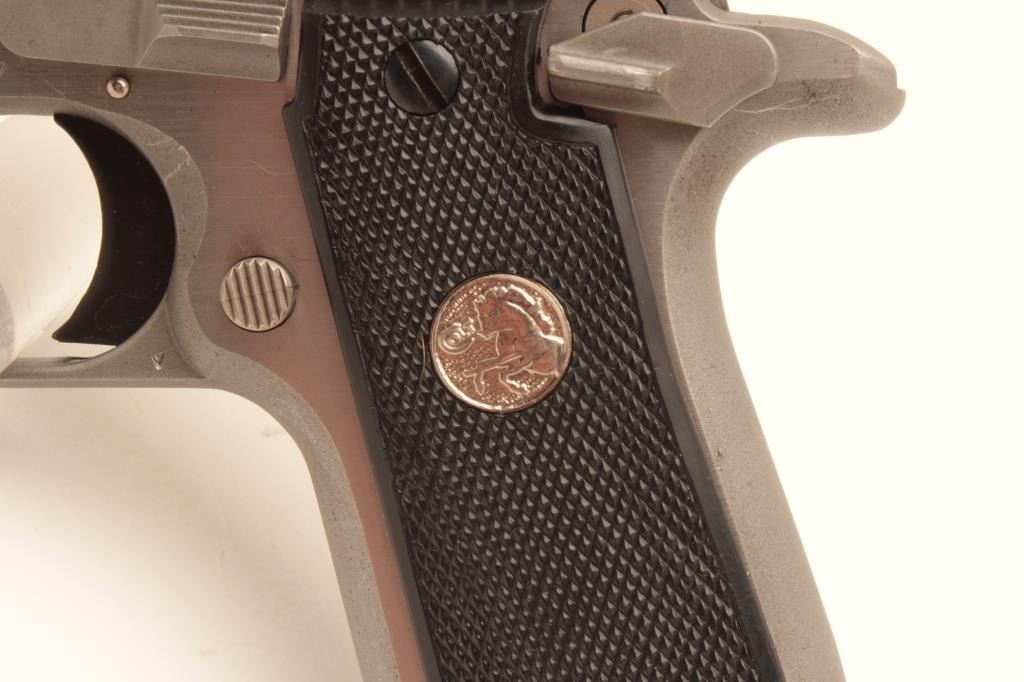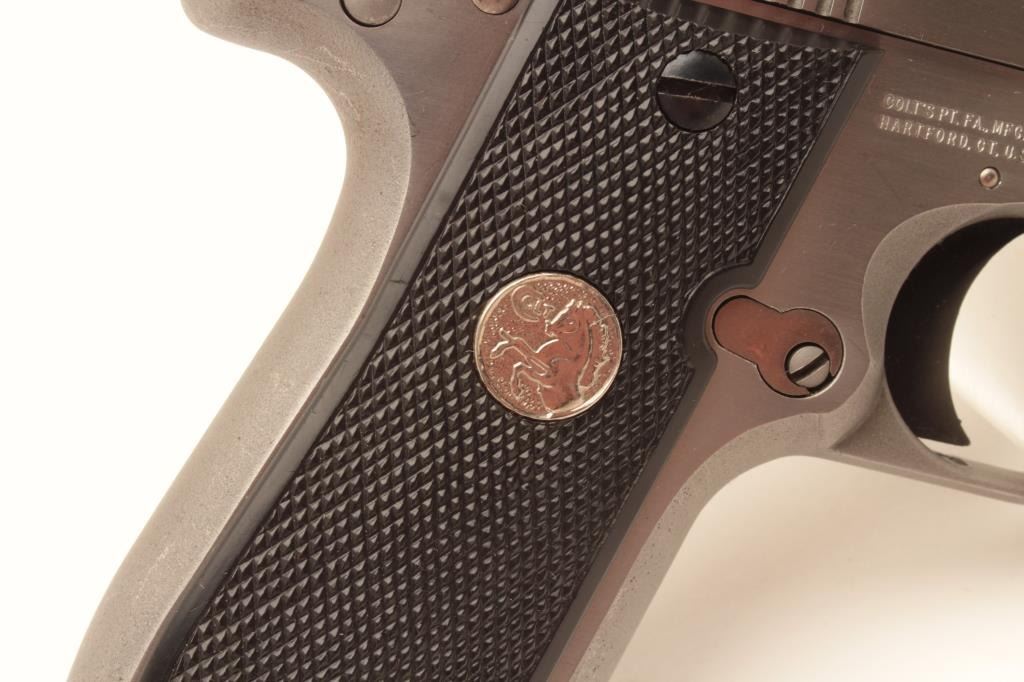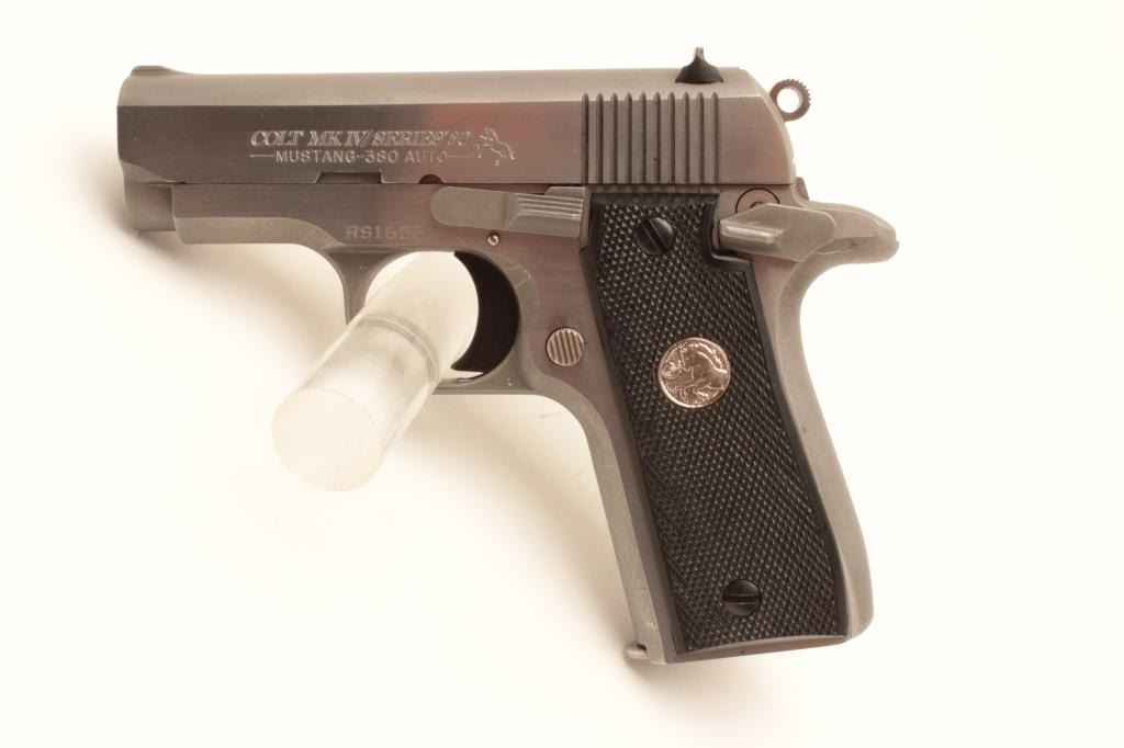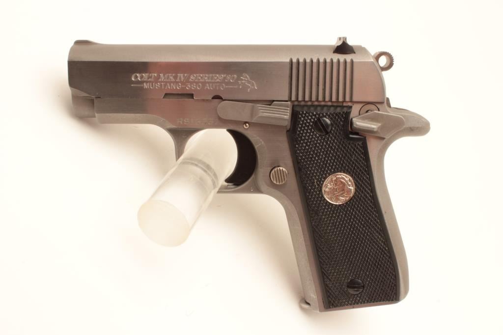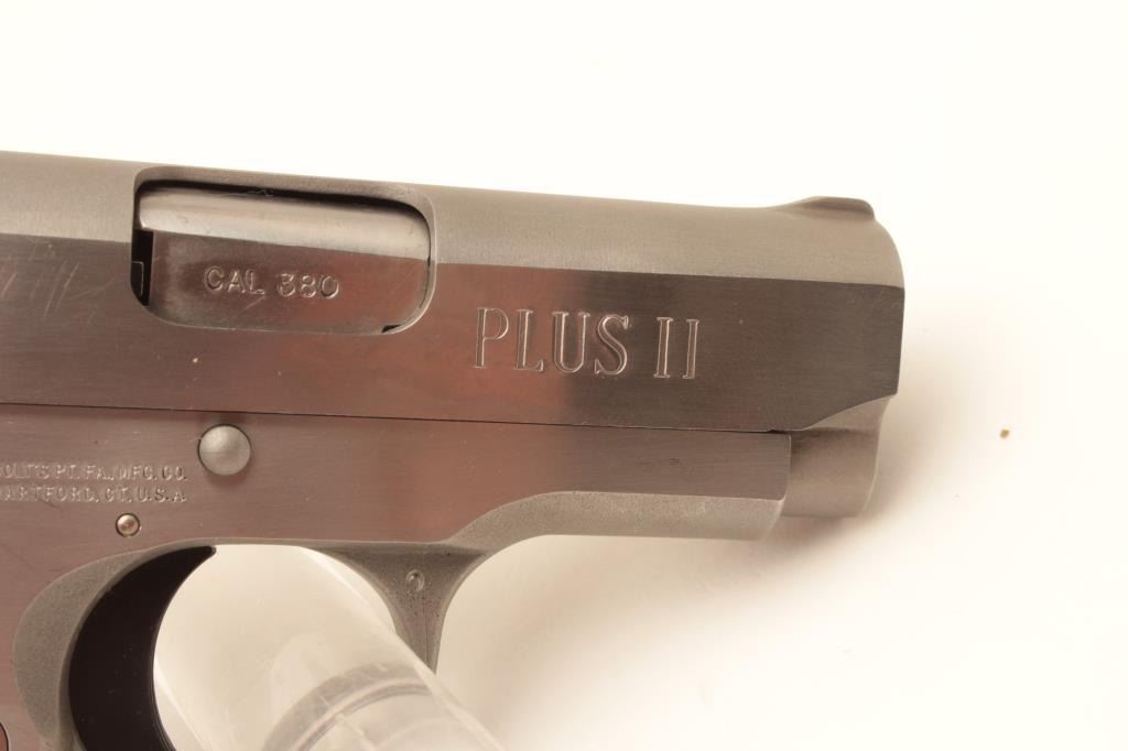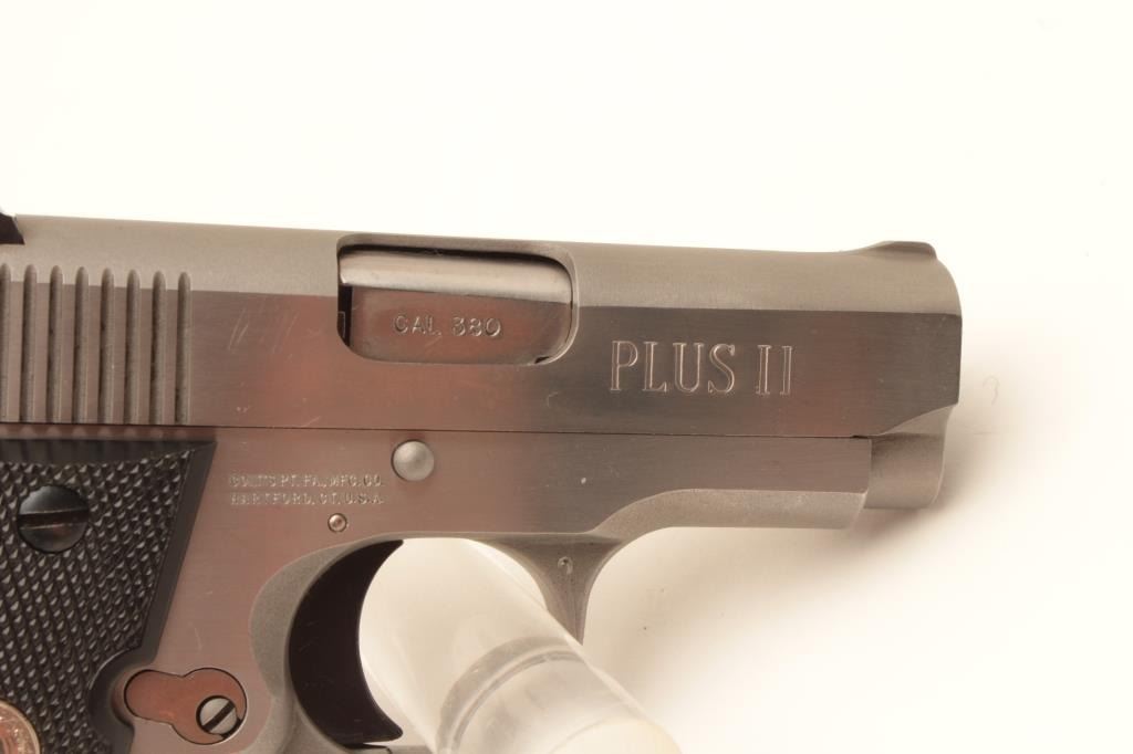 Colt MK IV Series 80 Mustang Plus II semi-automatic pistol, .380 caliber, Serial #RS16537. The pistol is in fine overall condition with 2 ¾” barrel. The pistol retains nearly all of its stainless finish Lot Title with only light handling marks noted. The checkered plastic silver medallion grips are in very good condition showing only light marks from storage. The bore is good, the action is crisp and markings are sharp on Lot Title this desirable little Colt. The lot includes three correct Colt marked magazines. Est.: $500-$1,000. (Modern).