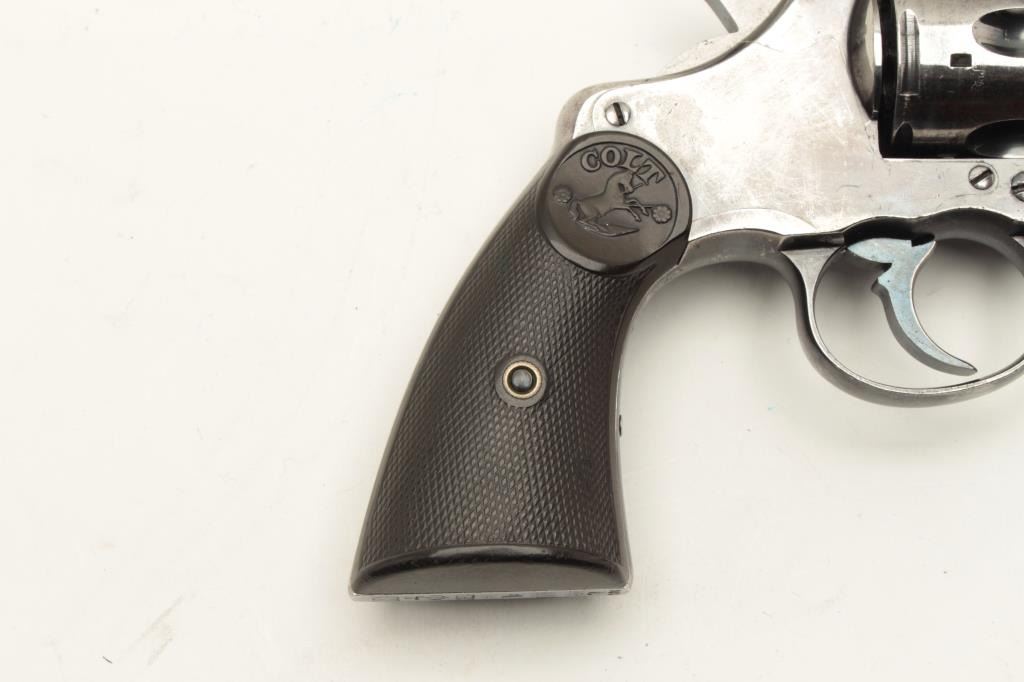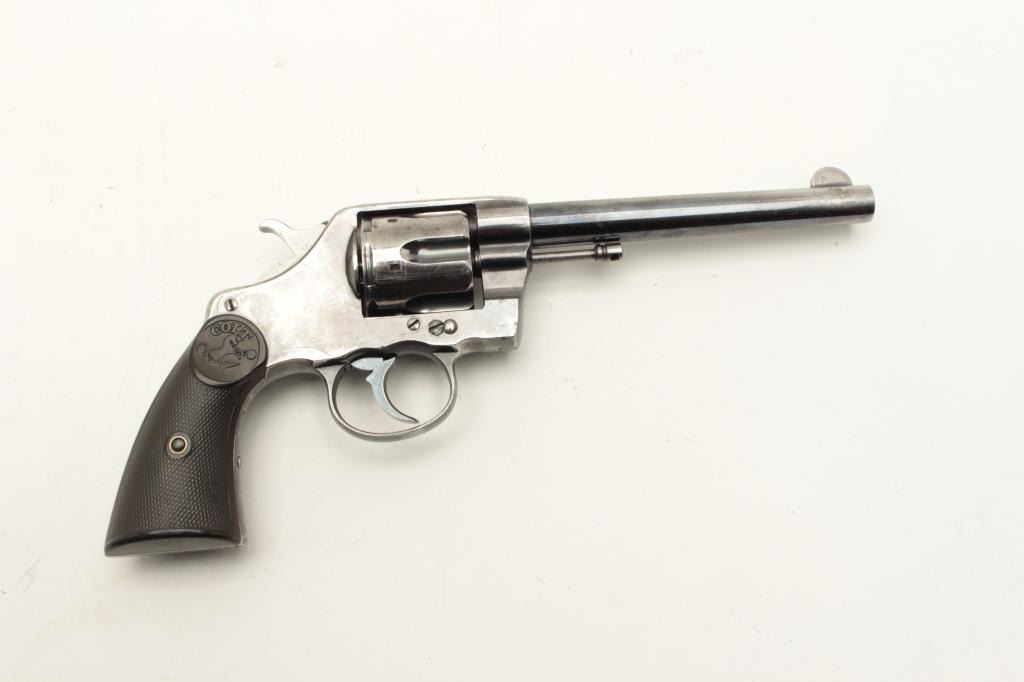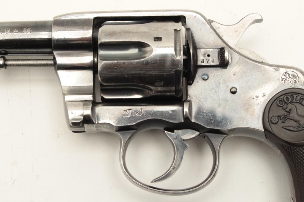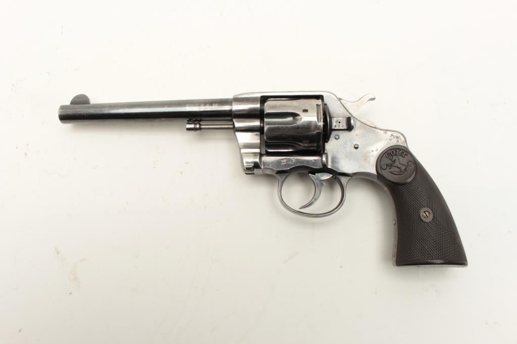 Colt Model 1896 DA revolver, U.S.N. marked and “N.J.” (New Jersey) stamped on left lower side of frame, .38 caliber, 6” barrel, high polish blued finish, checkered hard rubber grips, Lot Title S/N 70880 plus naval markings on butt strap and “N.O.T.” inspection. Gun is in overall very good condition with considerable original finish remaining, good bore, crisp action, good markings and good grips. Lot Title (Antique). Est.: $1,500-$3,000.