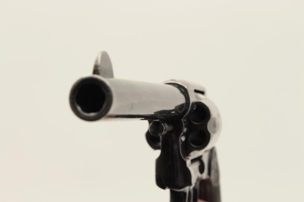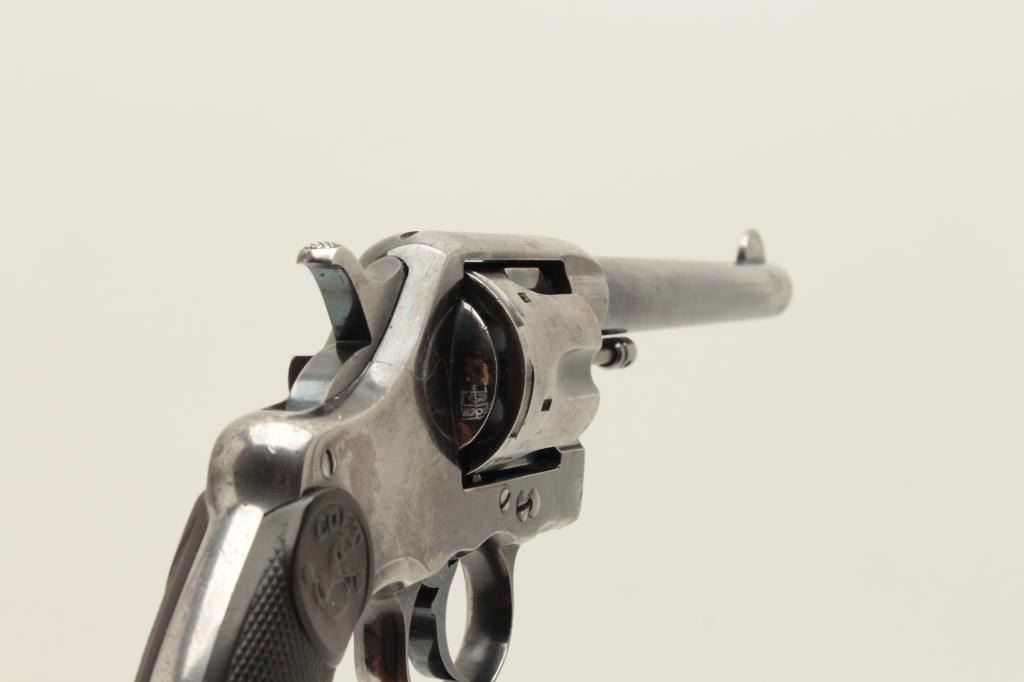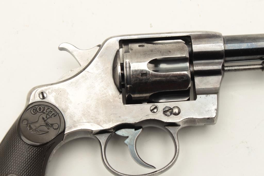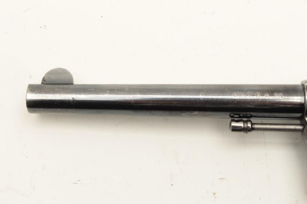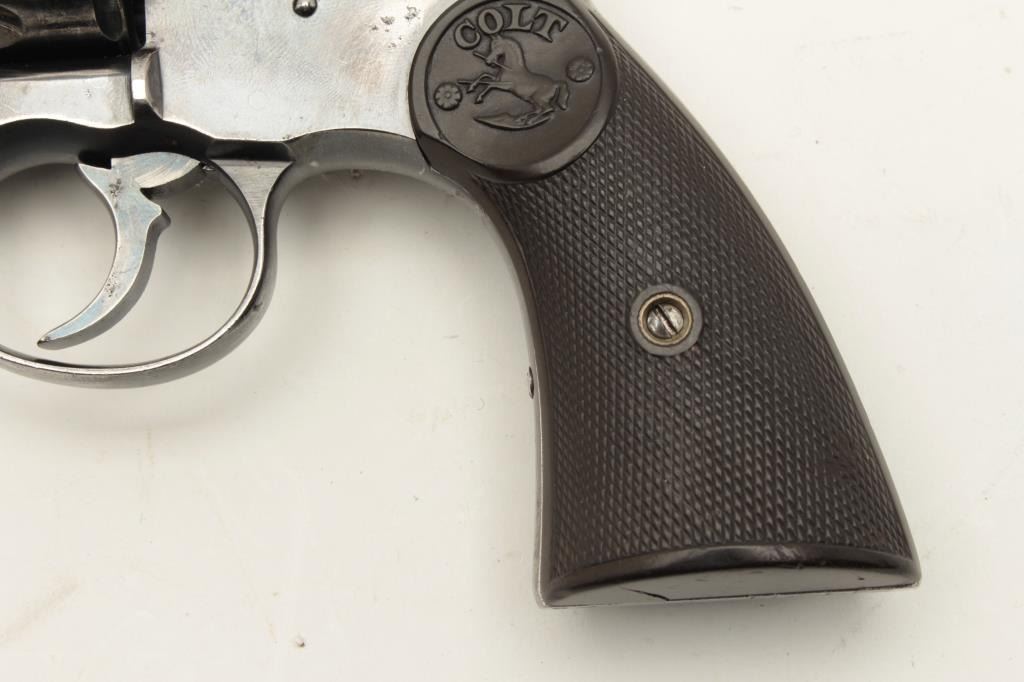 Colt Model 1896 DA revolver, U.S.N. marked and “N.J.” (New Jersey) stamped on left lower side of frame, .38 caliber, 6” barrel, high polish blued finish, checkered hard rubber grips, Lot Title S/N 70880 plus naval markings on butt strap and “N.O.T.” inspection. Gun is in overall very good condition with considerable original finish remaining, good bore, crisp action, good markings and good grips. Lot Title (Antique). Est.: $1,500-$3,000.