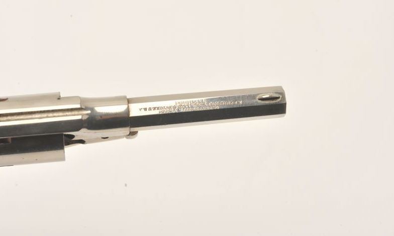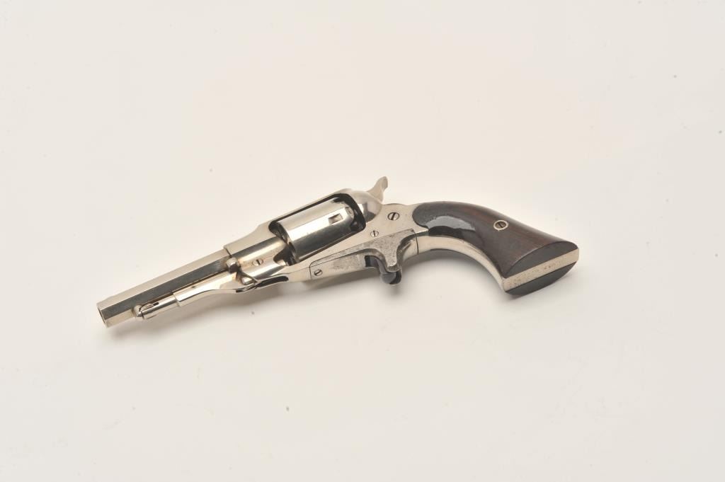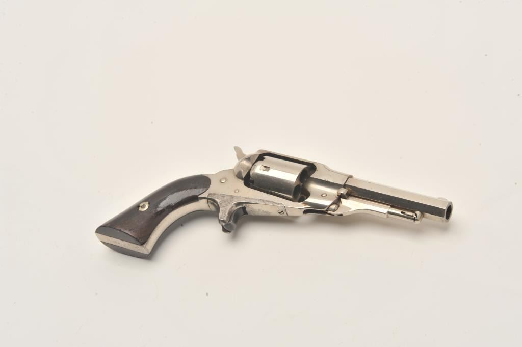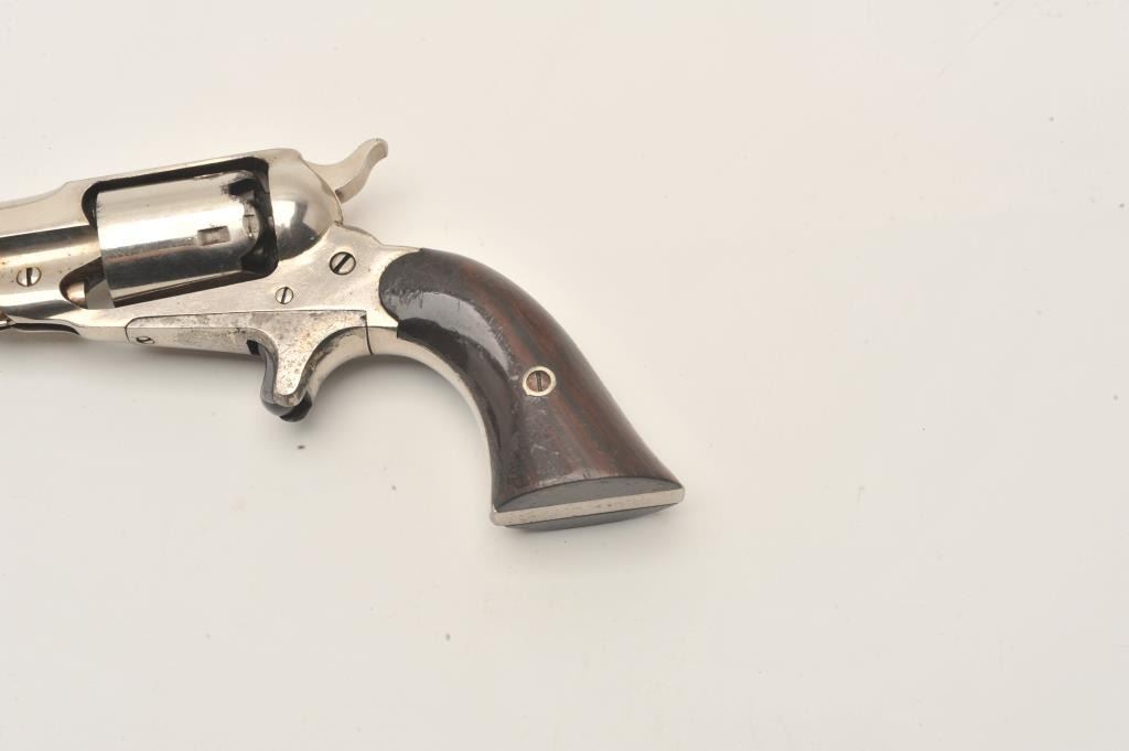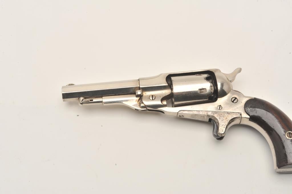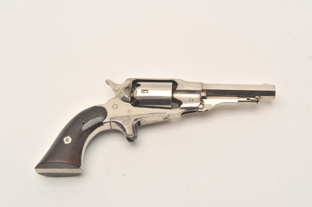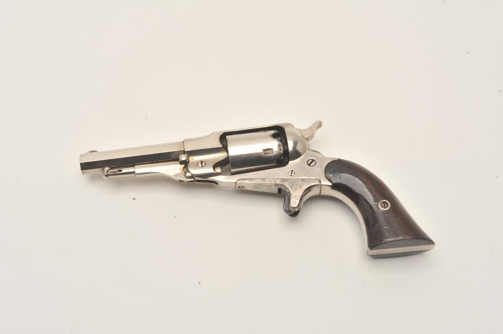 Remington New Model Pocket revolver in .31 caliber percussion with spur trigger, S/N 20588. Original nickel plate in near fine condition with 80%-90% remaining. Sharp address and crisp overall. The grips show Lot Title 80%-90% varnish with minor wear and scratches. The collection of Doug Drummond. (Antique) Est.: $1000-$2000