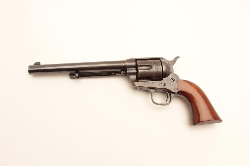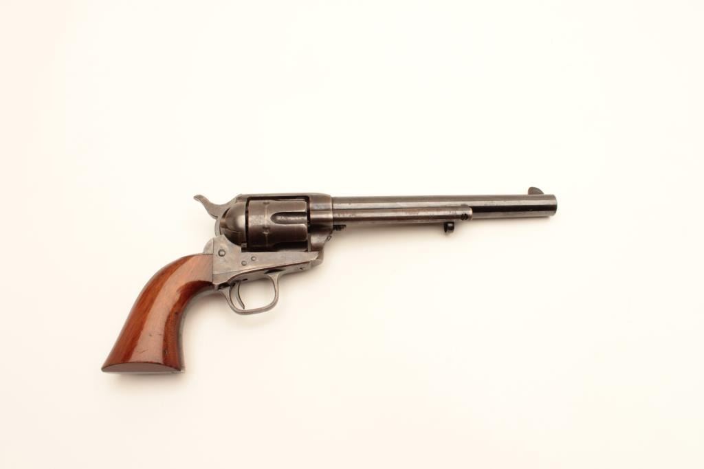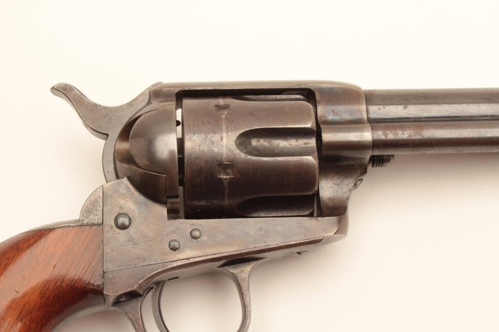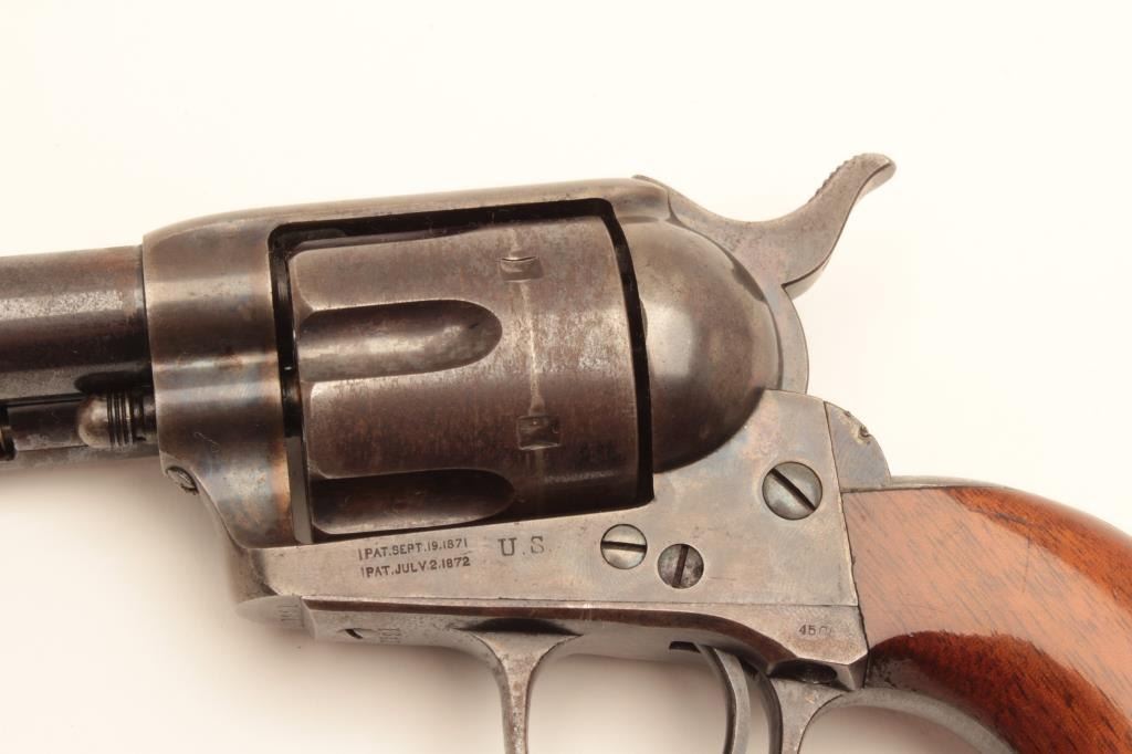 Stunning and early Colt Single Action Army Revolver in .45 Colt caliber with a 7 ½” barrel, U.S. marked and condemned, sold on civilian market after shipment to J.P. Moore’s & Sons, New York, New York on March Lot Title 3, 1874. In first 100 sold after Military contracts (5 guns in shipment), S/N 1221. This fine single action retains 75%-85% original bright blue on the barrel with full height front sight and early italic barrel Lot Title address showing no break to the “A”. 50%-70% original blue on the cylinder with index line and bright blue in flutes. Correct early ejector rod housing, spring, and donut head with matching barrel number. U.S. marked Lot Title early frame showing 60%-80% rainbow case hardening that’s vivid where protected and colorful all over. The backstrap and trigger guard show 60%-80% bright original blue. The grips are excellent with 95% plus original Lot Title varnish. The hammer shows early knurling and 85% case colors. Tight action and bright bore. Shows large and correct early style numerals and is all matching. A very early and sophisticated single action collector’s