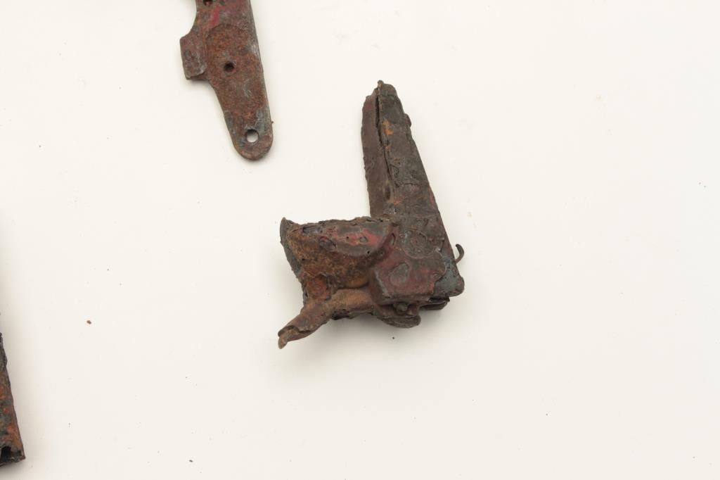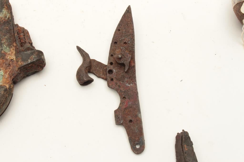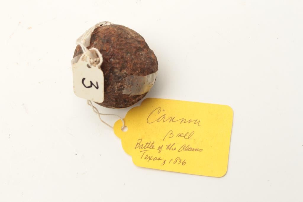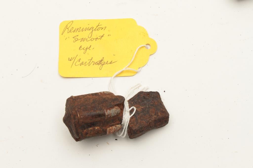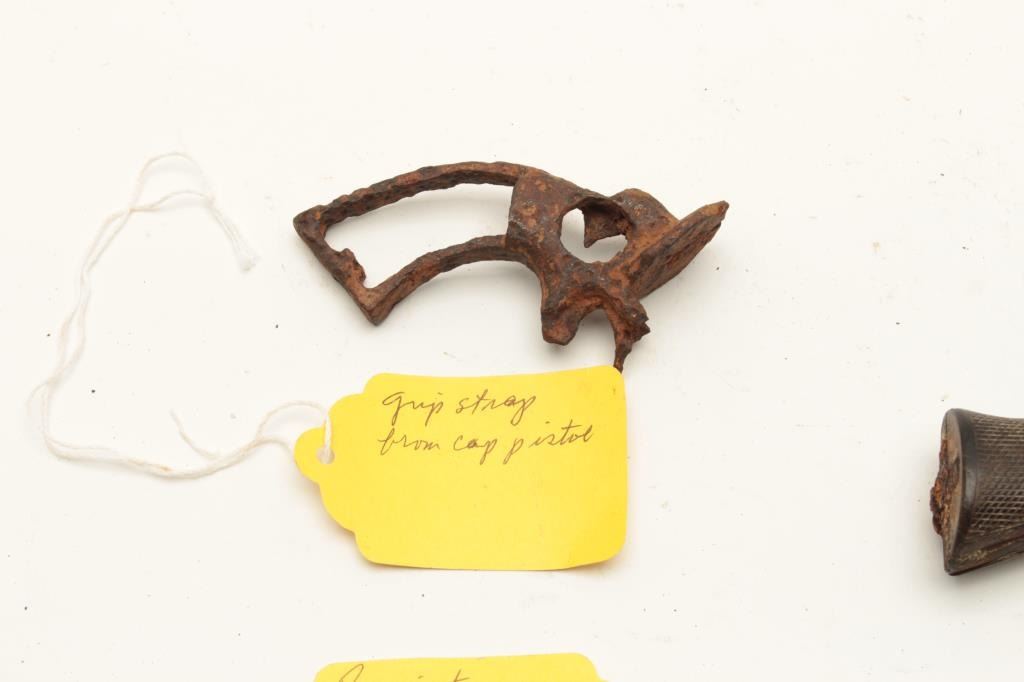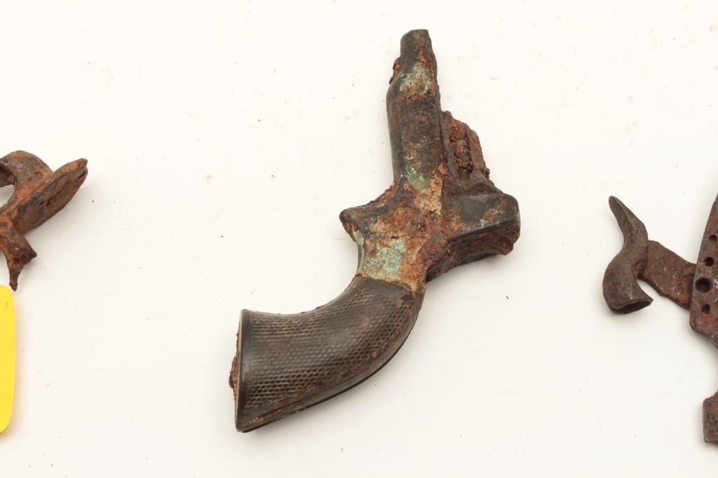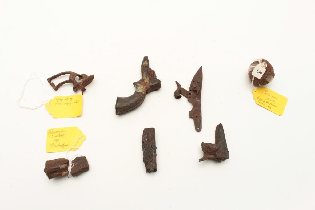 Lot of 7 interesting misc. rusty relics including a 2” diameter iron cannon ball with tag “Cannon Ball/ Battle of the Alamo, Texas/1836”; a Remington Smoot cylinder and part of barrel with all 5 chamber of cylinder Lot Title still loaded! Also a grip strap from a cap pistol; a Sharps derringer frame and checkered hard rubber grips with tag “Found in old PRIVY in downtown Tucson, AZ, 1988”; a frame and hammer from what appears to be a Lot Title Colt Model 1862 Police conversion; a Sharps 4-barrel derringer barrel only and a lockplate and percussion hammer for a percussion lock. From the collection of John O. Beckwith. Est.: $150-$300.