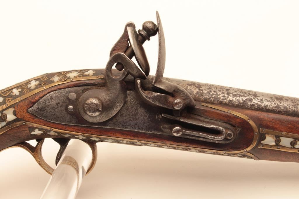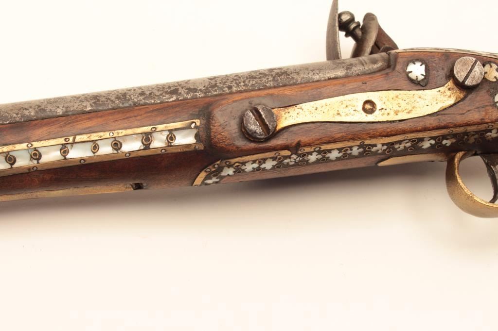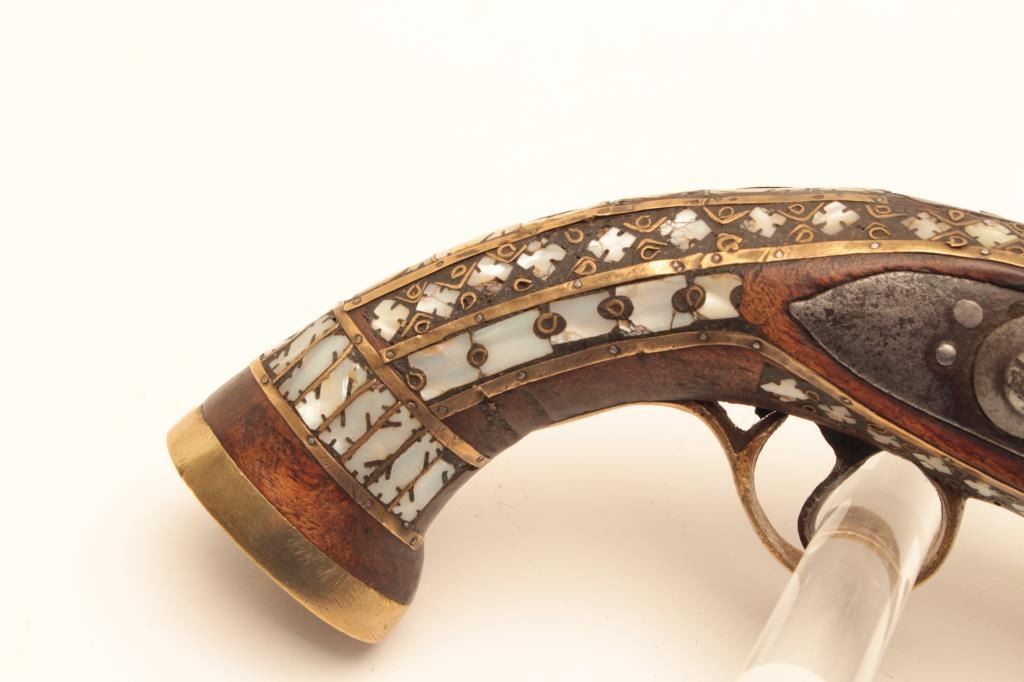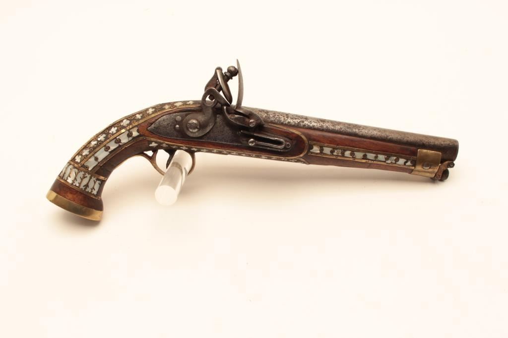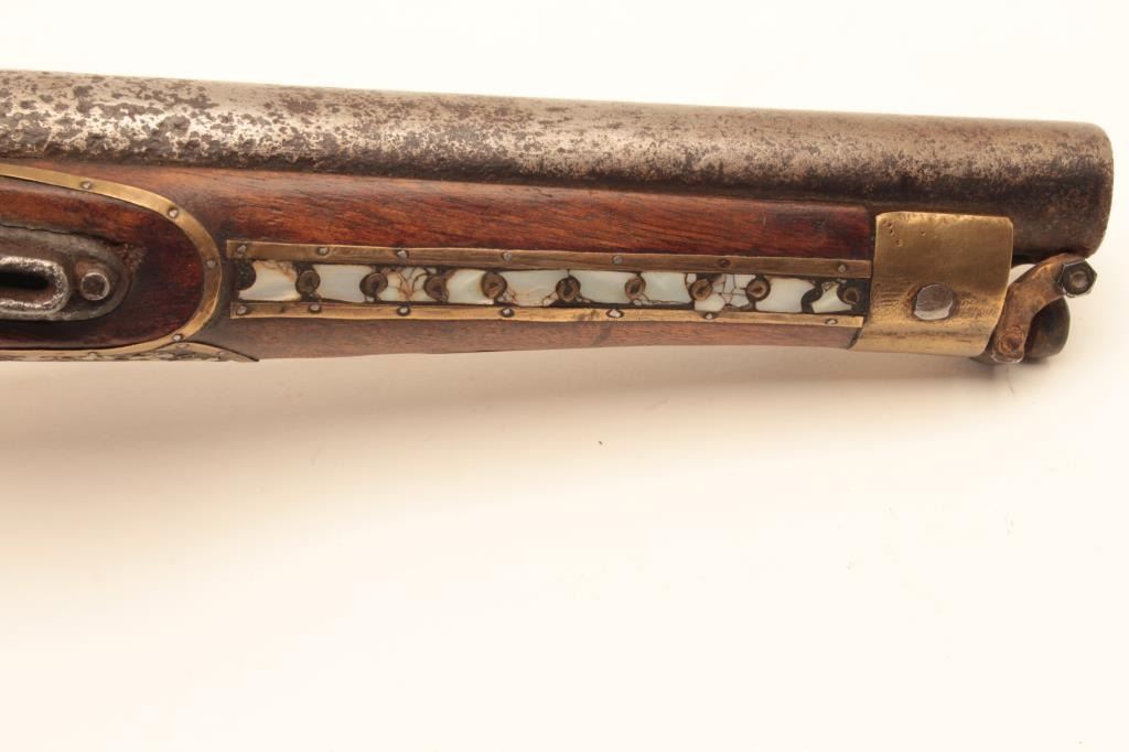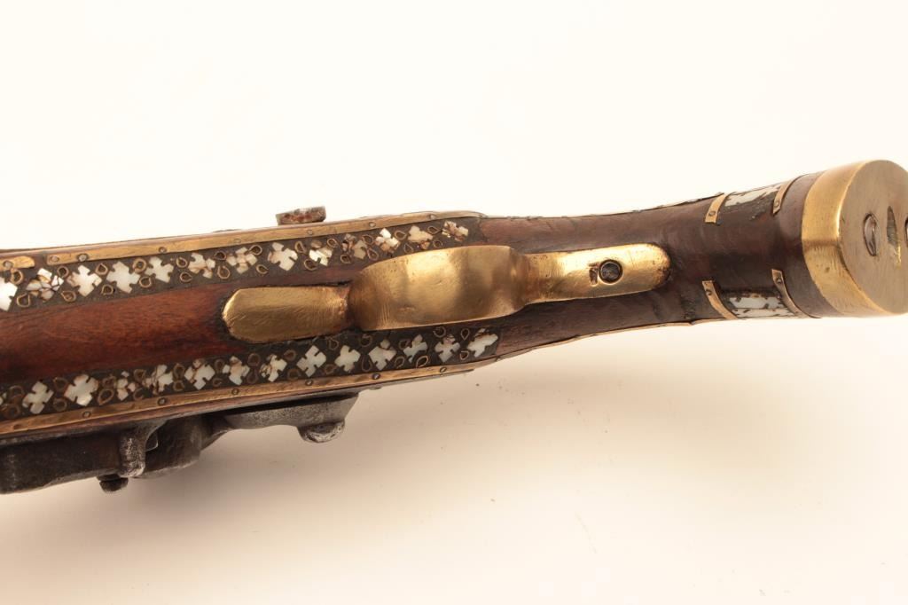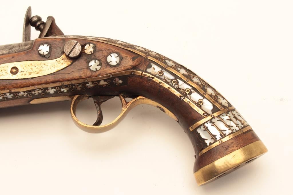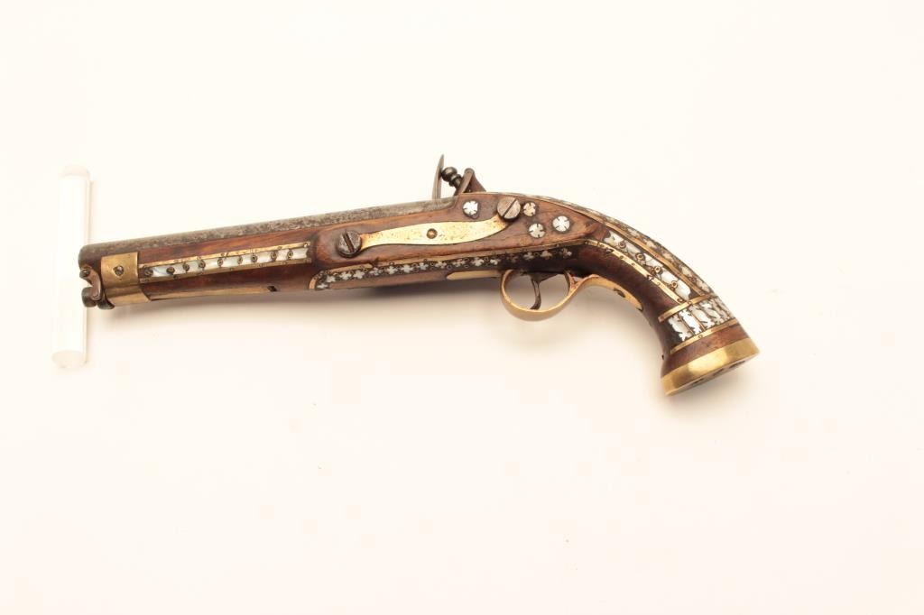 Flintlock trade pistol, brass mounted, highly decorated wood stock with brass piercings and pearl inlays. (Antique). Est.: $175-$350.