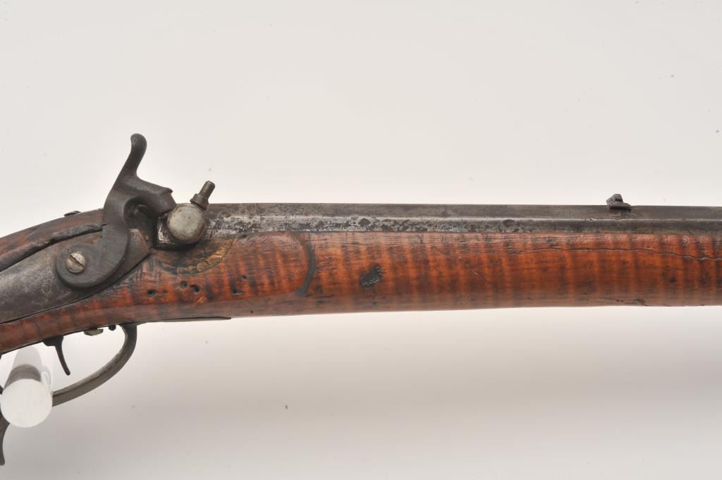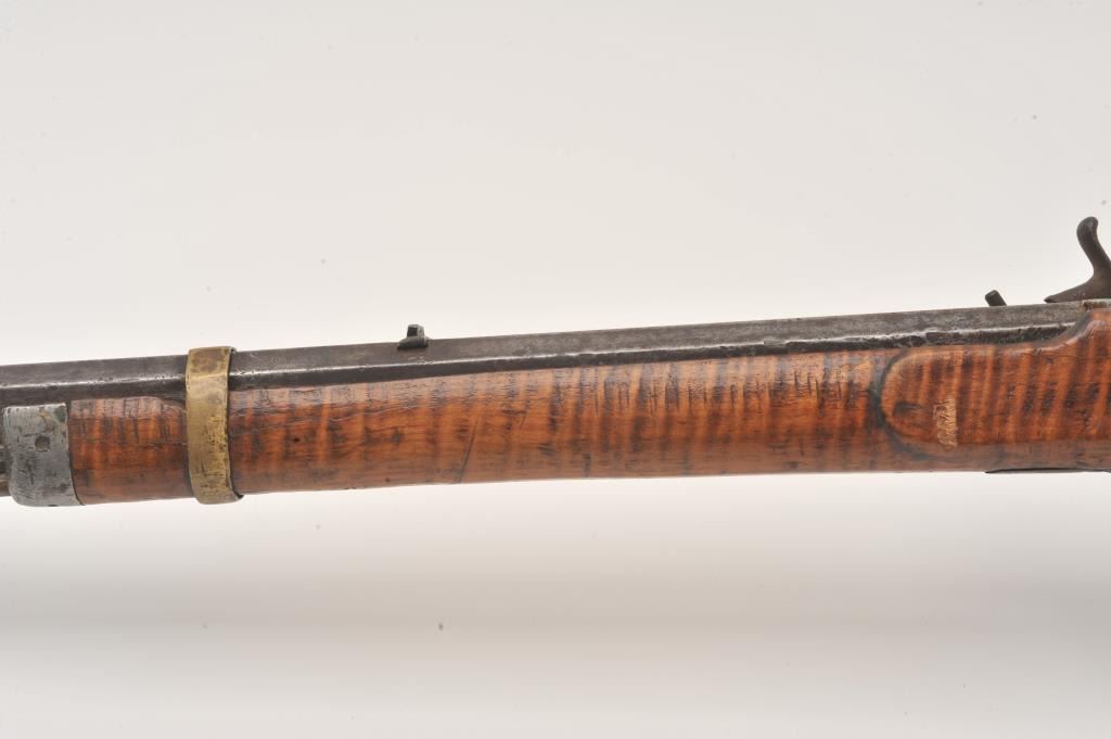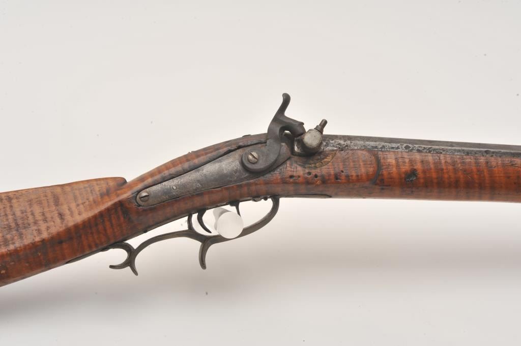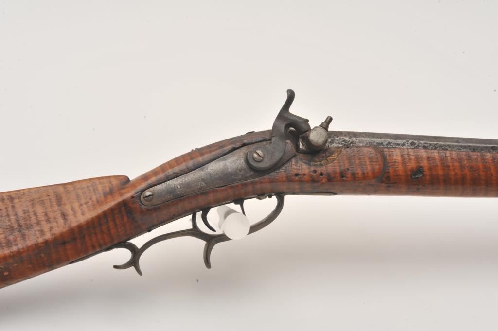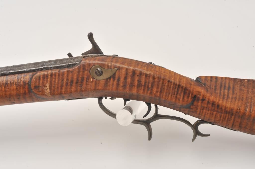 Half stocked American plains rifle, earlier barrel; nicely signed in script “Jacob Fisher”; shows dark patina to metal surfaces and heavy use. (Antique). Est.: $300-$600.