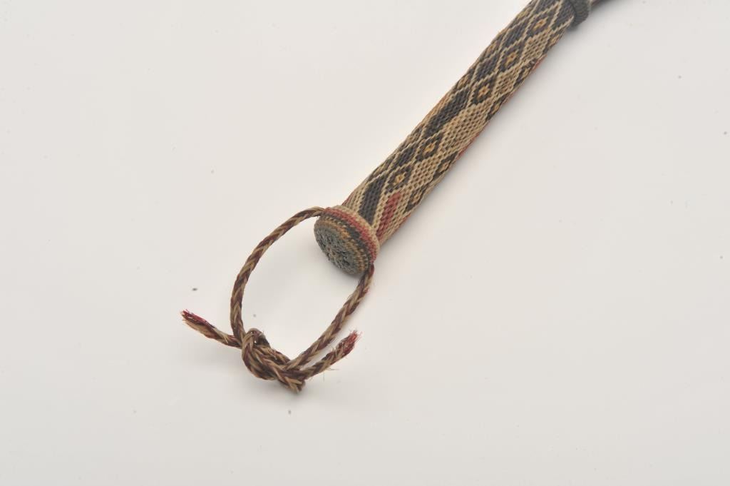 Vintage multi-colored woven horsehair quirt; approximately 20” overall with leather end thong; overall good to very good condition. Est.: $150-$300.