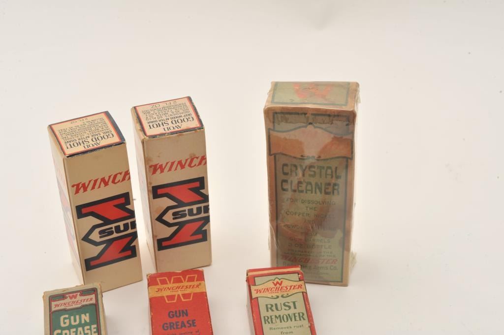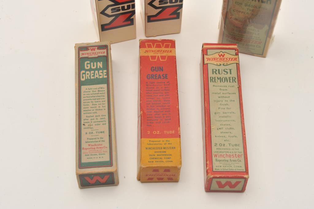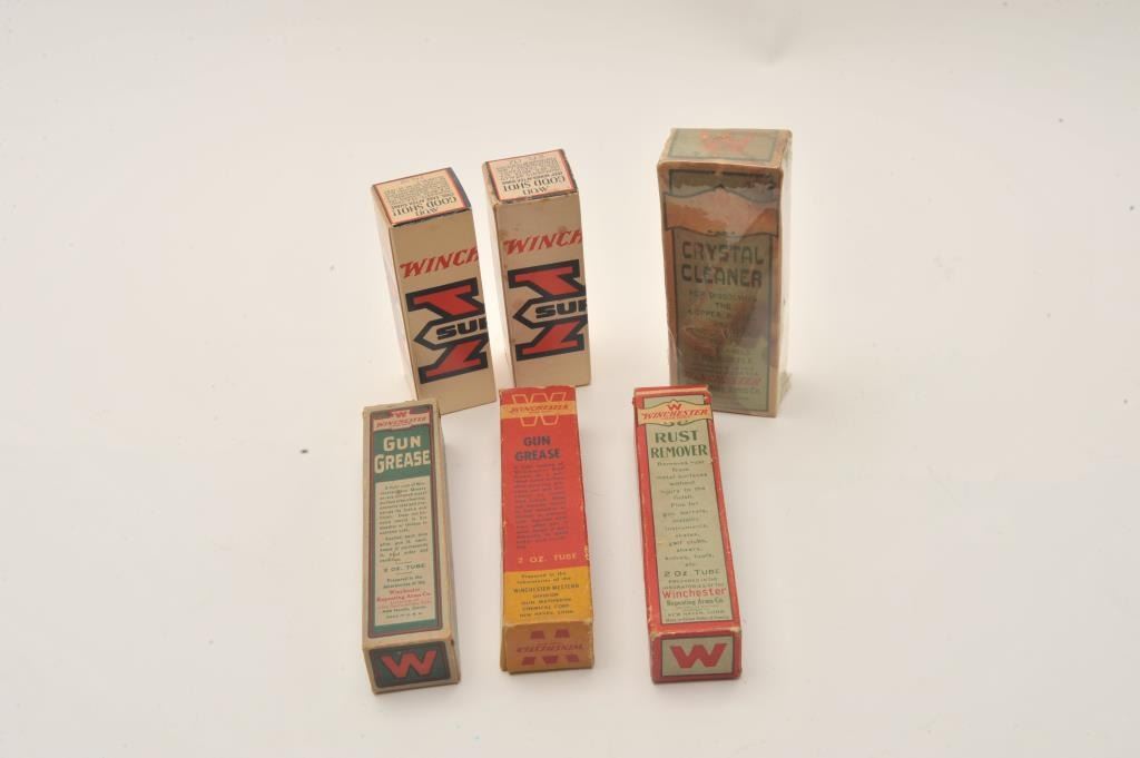 Lot of Winchester-related small products including a box of crystal cleaner, two after shave products in factory cardboard boxes, a tube of rust remover in factory box and two tubes of gun grease with factory cardboard Lot Title boxes. Est.: $100-$200.