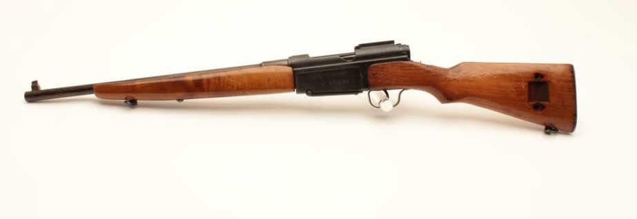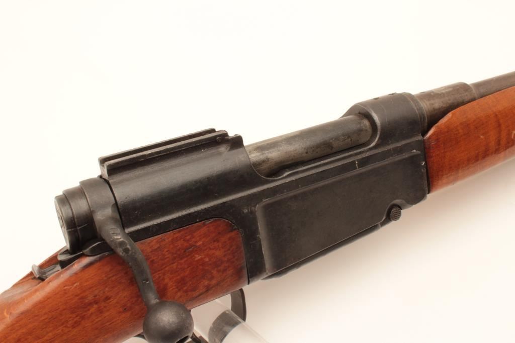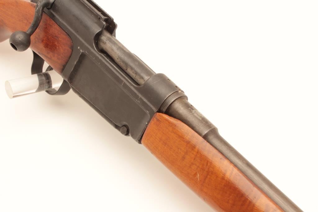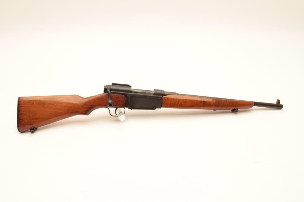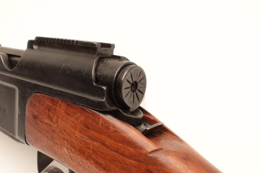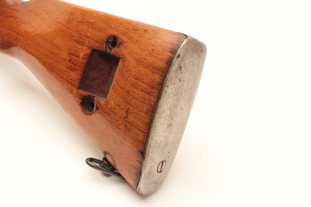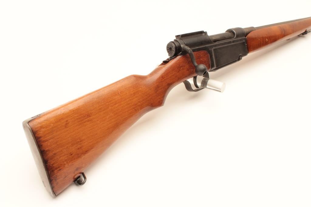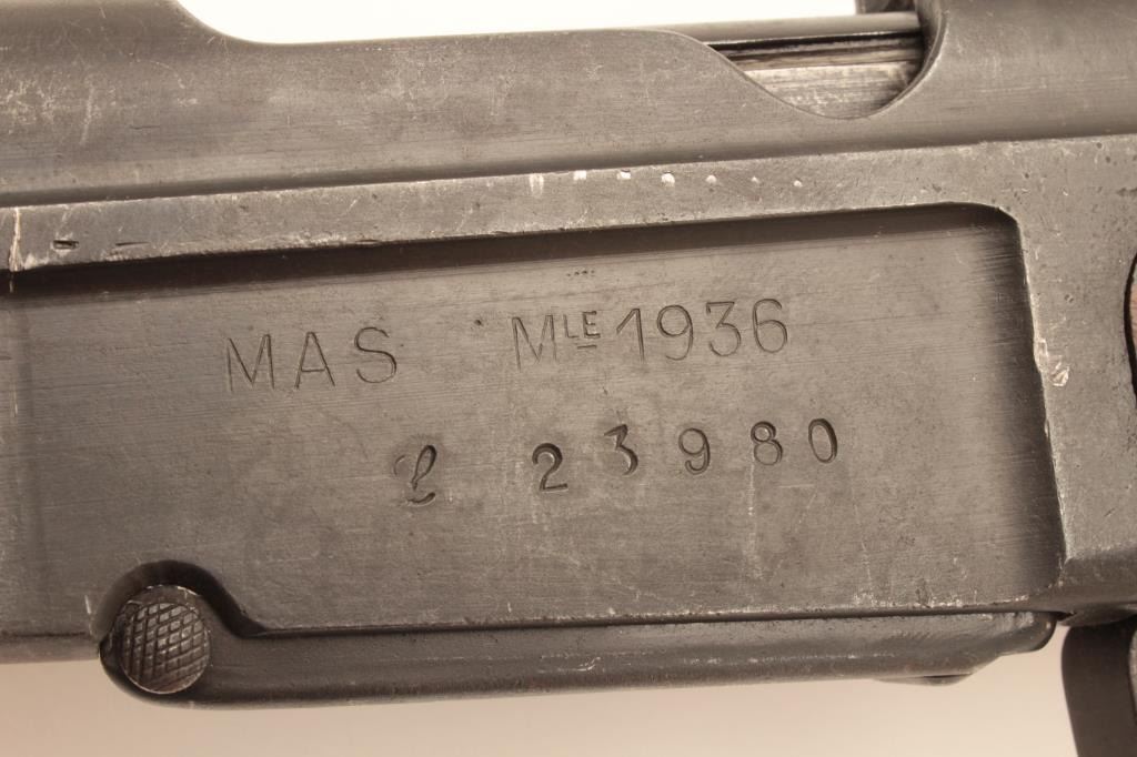 Sporterized French MAS Model 1936 bolt action rifle, 7.5mm caliber, 18.5” barrel, military finish, wood stocks with sling swivels added, S/N 23980, in overall fair to good condition with a crisp action, fair to good Lot Title bore, top of receiver and barrel at breech tapped for sight or scope mounts, good butt stock and replaced forend stock. (C&R). Est.: $50-$100.