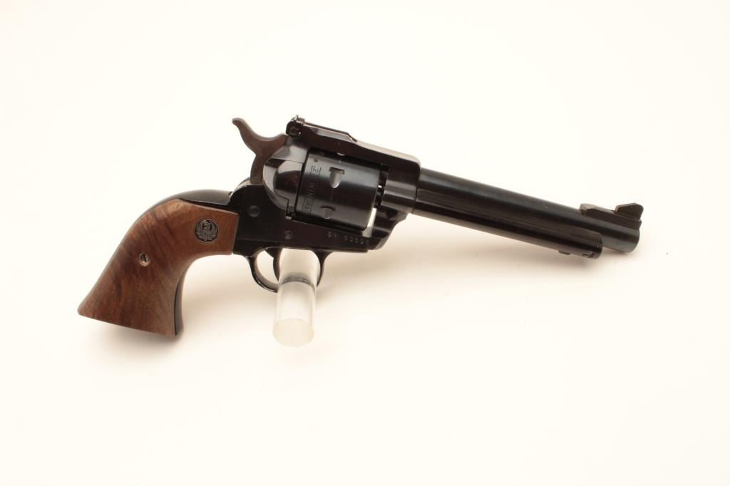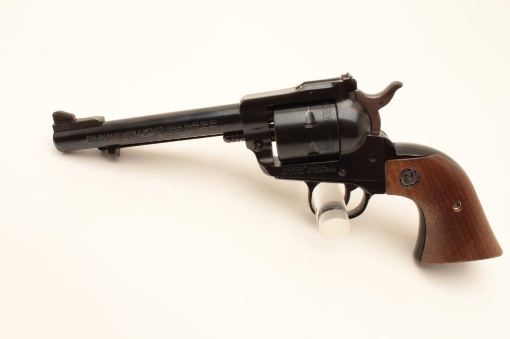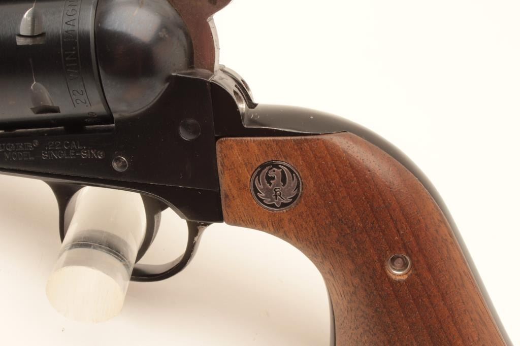 Ruger New Model Single Six single action revolver, .22 caliber Magnum, Serial #69-83898. The pistol is in very good overall condition with a 5 ½” barrel with a ramp front and adjustable rear sights. The Lot Title metal surfaces show the majority of their blue finish with wear at the muzzle and a faint drag line on the cylinder. The smooth wood medallion grips are in very good condition with only storage and handling Lot Title marks. The bore is good, the action crisp and markings are sharp. Est.: $200-$400. (Modern).