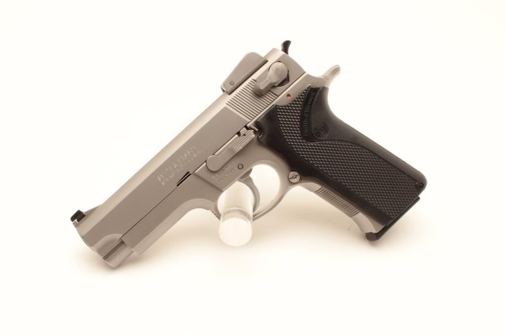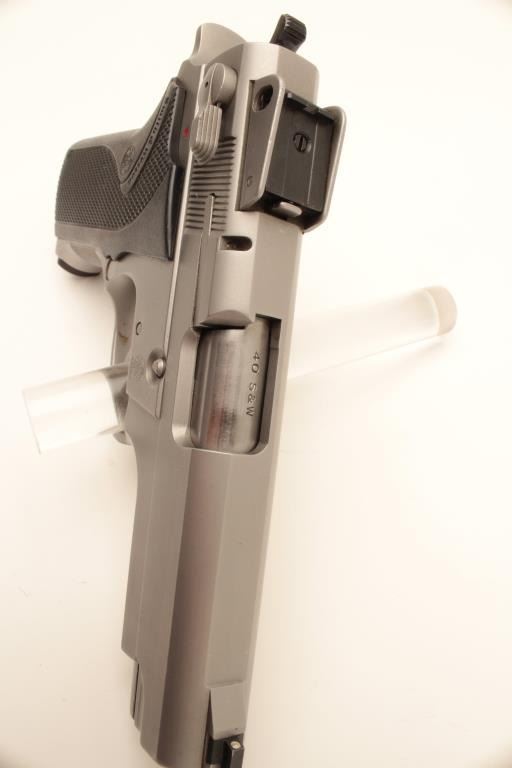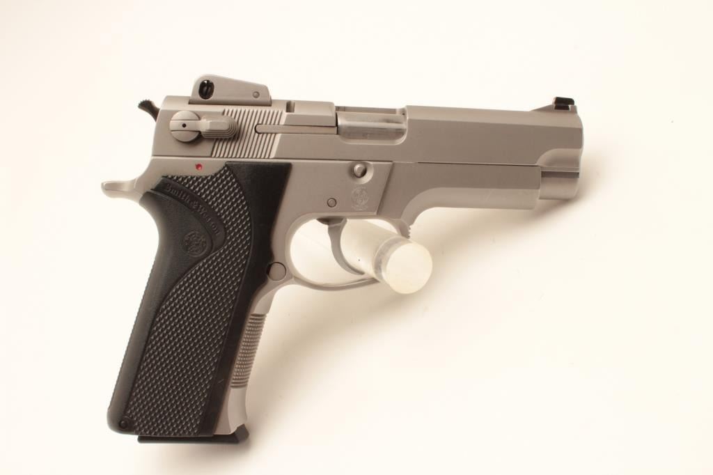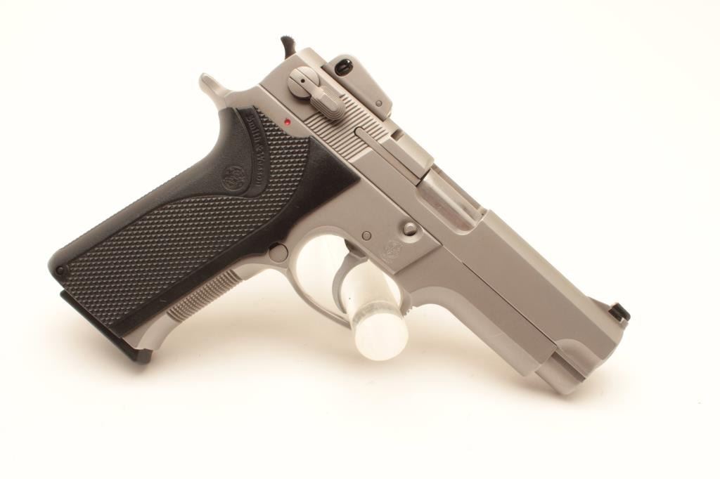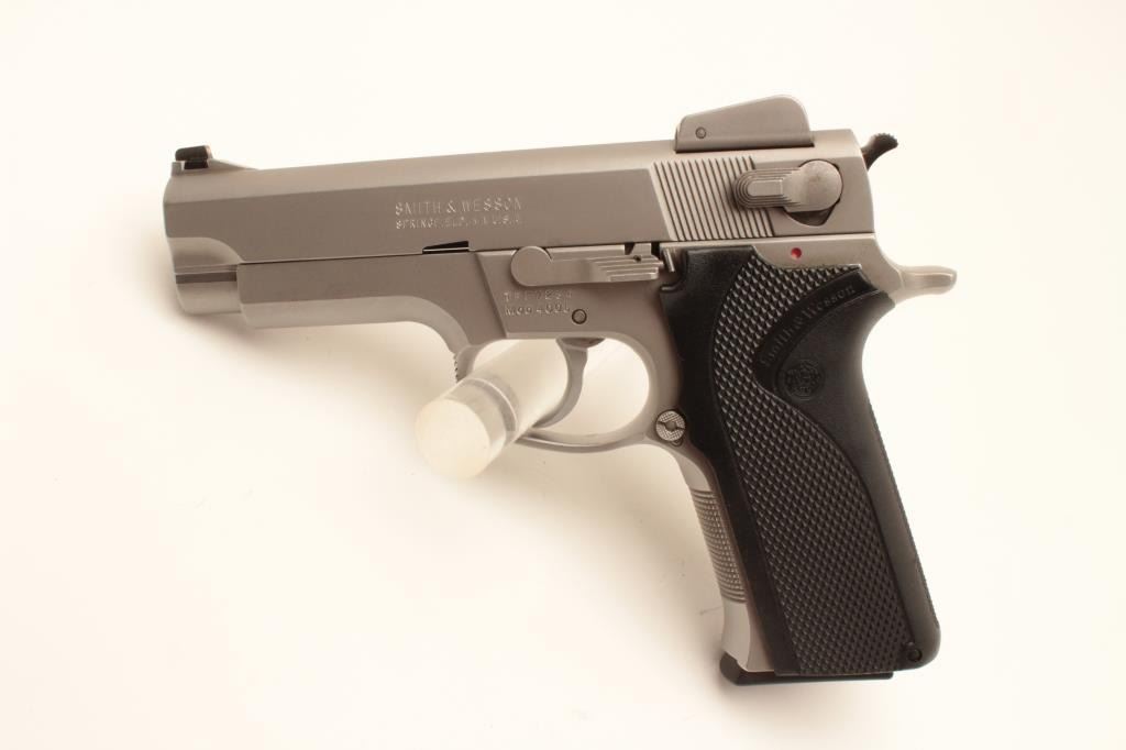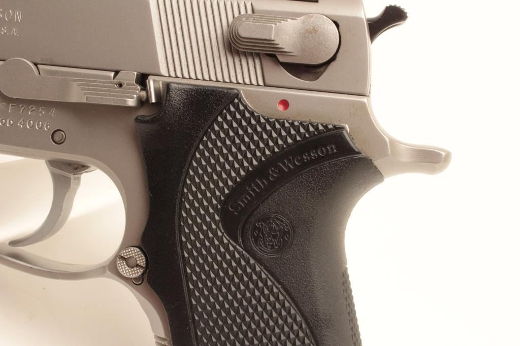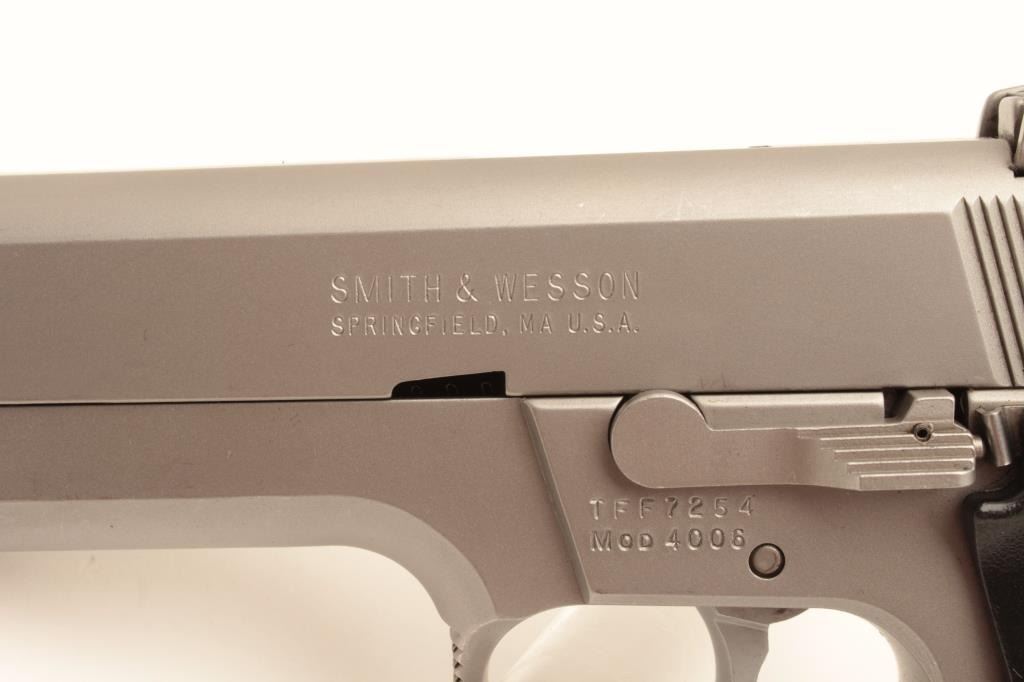 Smith & Wesson Model 4006 semi-automatic pistol, .40 caliber, Serial #TFF7254. The pistol is in very good overall condition with a 4” barrel with a ramp front and adjustable rear sights. The pistol retains the Lot Title majority of its matte stainless finish with small mars and scratches consistent with carry and use. The checkered plastic grips are in very good condition with only handling marks. The bore is good, the action crisp Lot Title and markings are sharp. The pistol comes with four correct S&W marked magazines. Est.: $275-$550. (Modern).