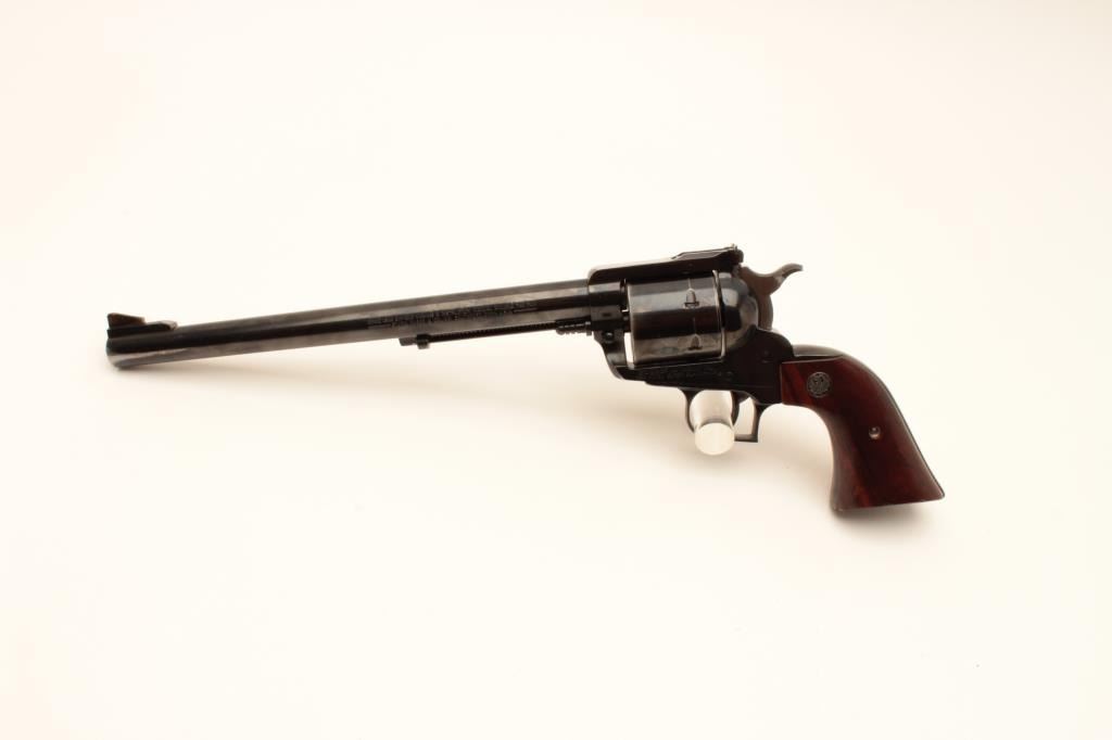 Ruger New Model Super Black Hawk revolver, .44 Magnum caliber, Serial #83-35210. The pistol is in very good overall condition with a 10 ½” barrel with ramp front and adjustable rear sights. The metal surfaces Lot Title retain the majority of their blue finish with holster wear at the muzzle and drag line on the cylinder. The smooth wood medallion grips are in good condition with mars, compressions and a ¼” chip in the right Lot Title panel. The bore is good, the action crisp and markings are sharp. Est.: $300-$600. (Modern).