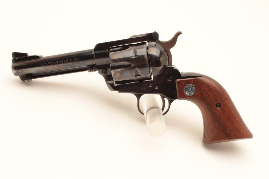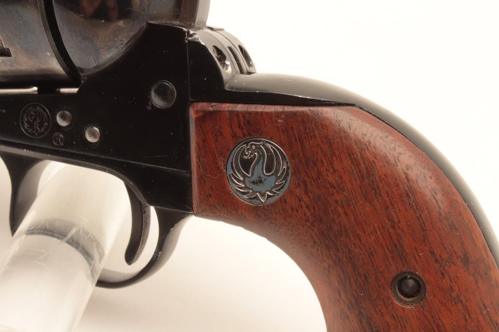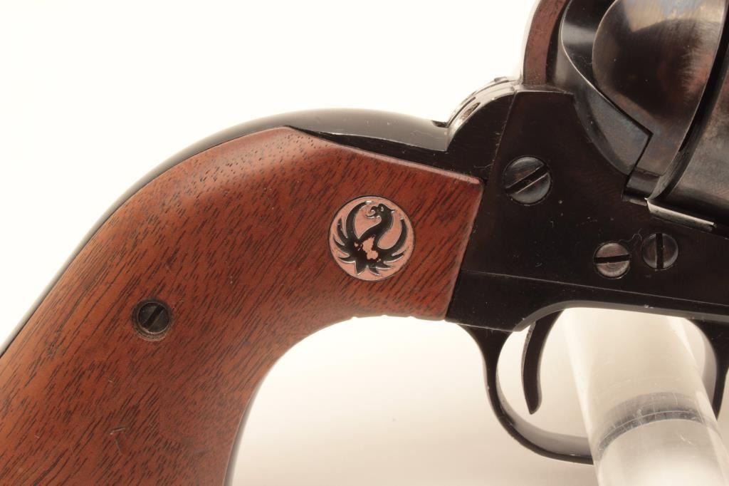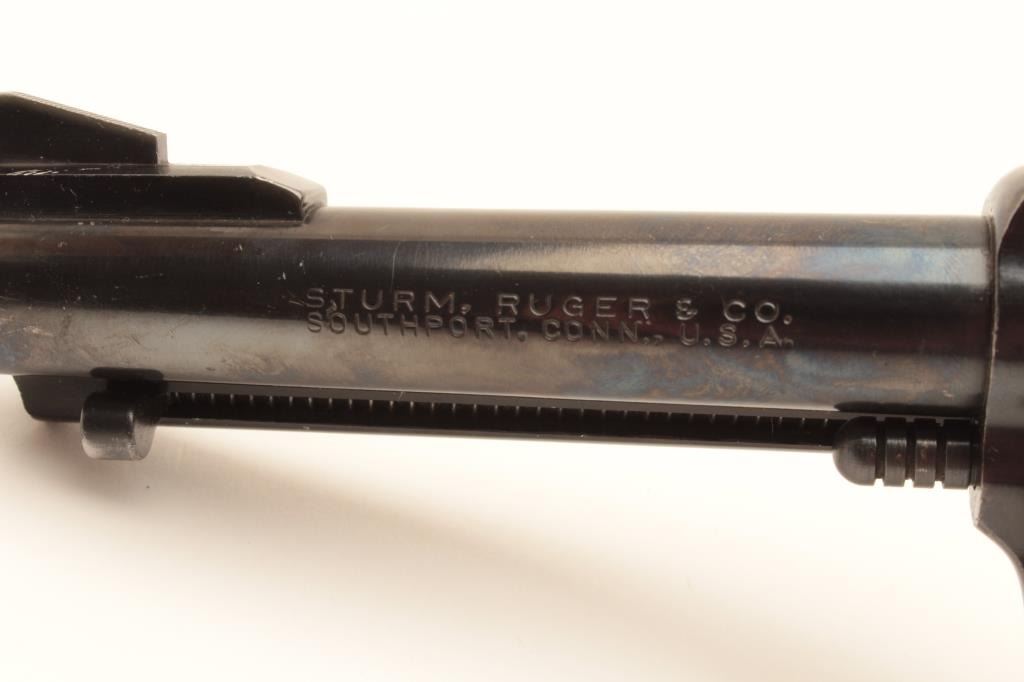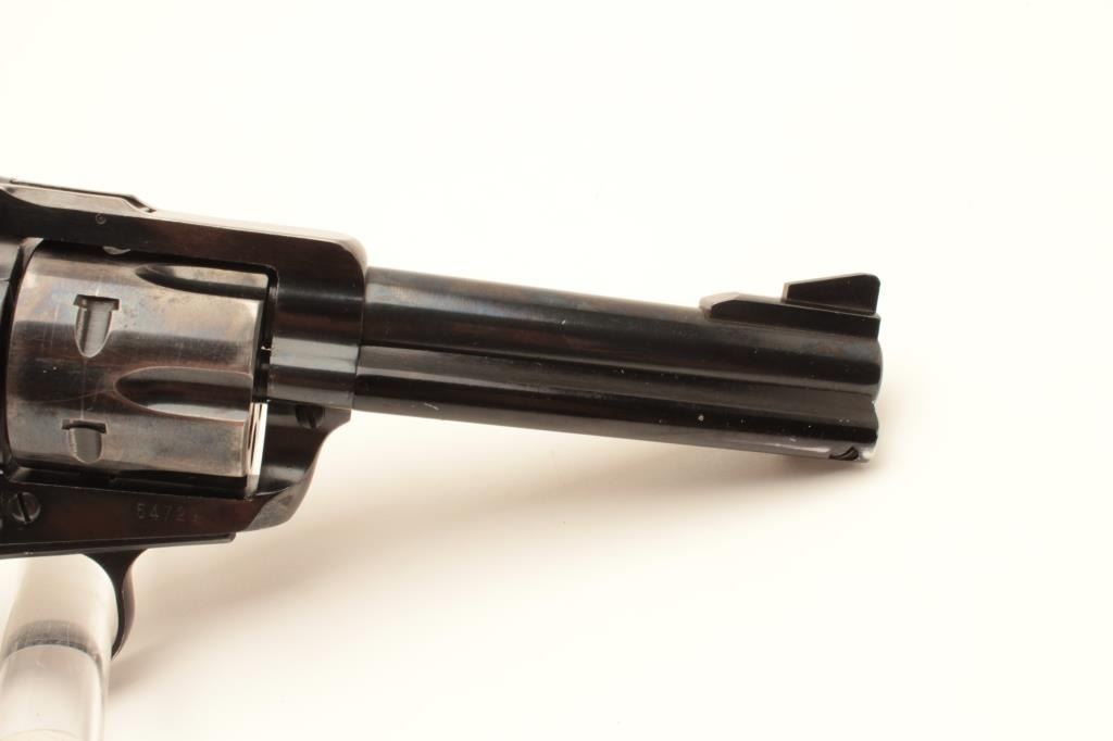 Ruger Black Hawk revolver, .357 Magnum caliber, Serial #54729. The pistol is in good overall condition with a 4 ½” barrel with ramp front and adjustable rear sights. The metal surfaces retain the majority of Lot Title their blue finish with holster wear at the muzzle and a drag line with thinning blue on the cylinder. The smooth wood medallion grips are in good condition with small mars and compressions. The bore is good, the Lot Title action crisp and markings are sharp on this early Black Hawk without the transfer bar. Est.: $300-$600. (Modern).