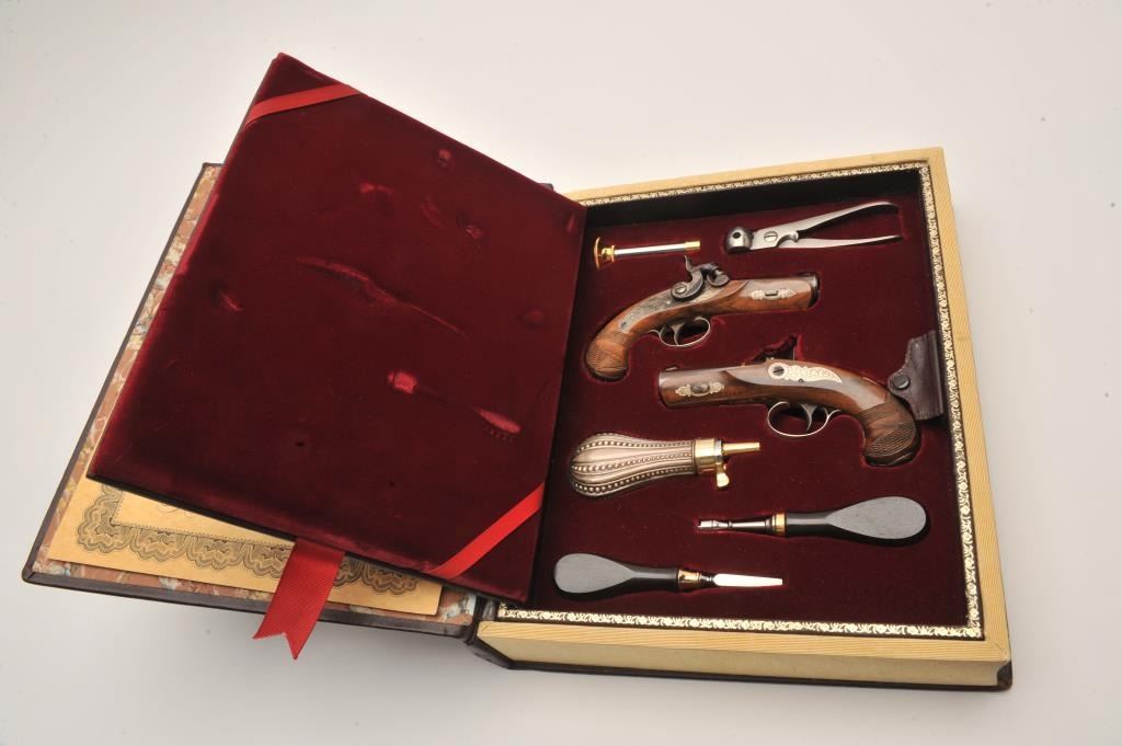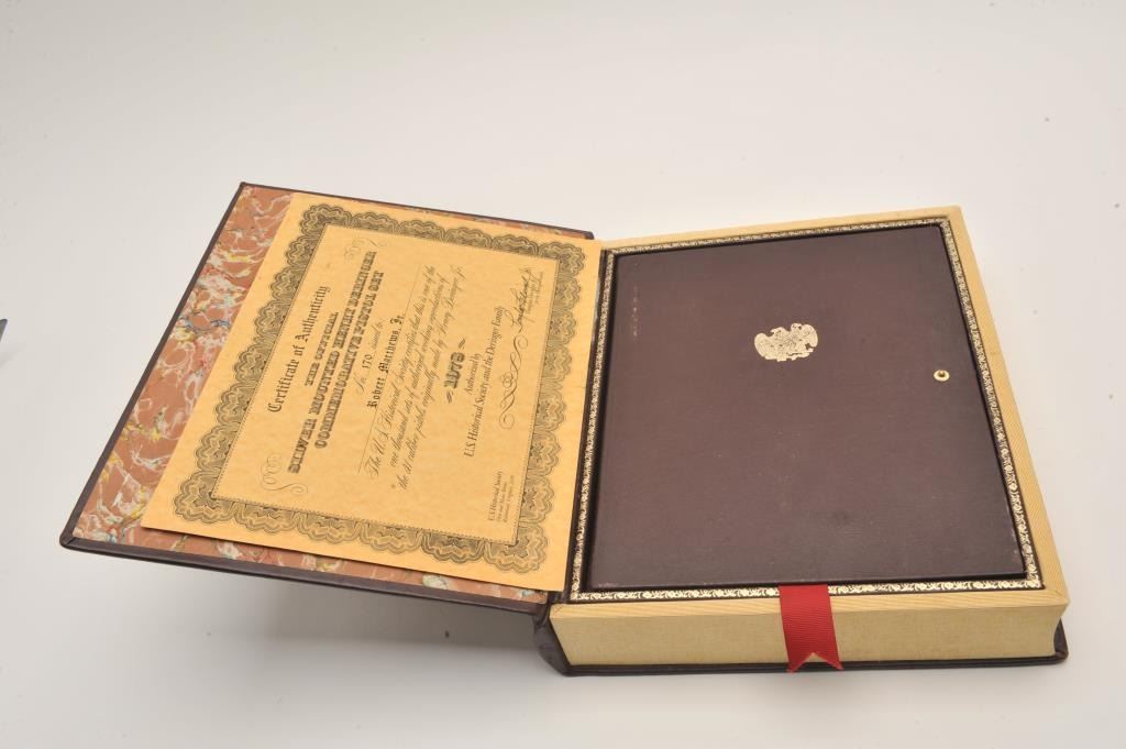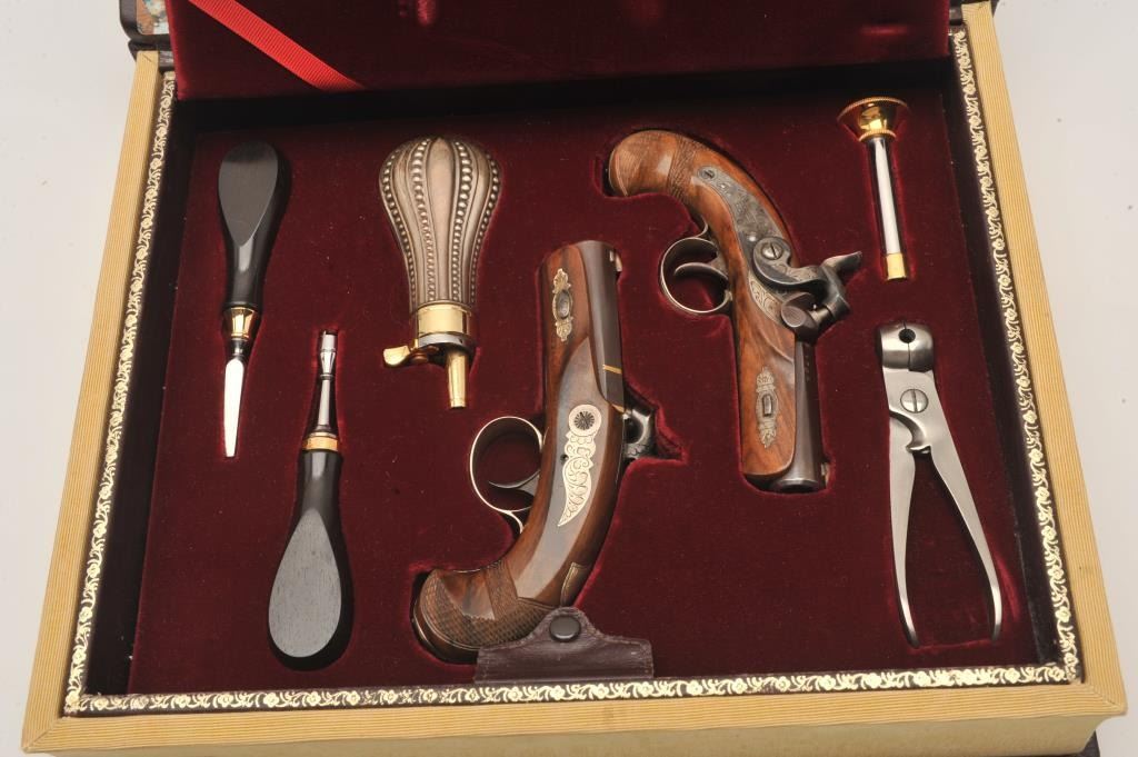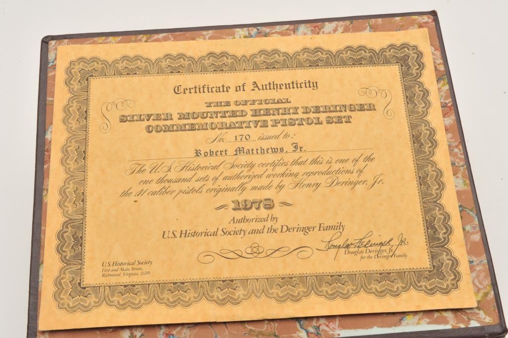 U.S. Historical Society silver mounted Henry Commemorative deringer pistol set. The derringers are beautifully cased with red velvet interior. Serialized 170A and 170B, the pistols are nicely done with 2 and 2 ½” Lot Title barrels. The metalwork is well done in silver with blank escutcheon plates behind the tangs of both pistols. The finely checkered wood grips are in excellent condition with only the lightest handling Lot Title marks. The casing includes mold, rammer, screwdrivers and other accoutrements. This is a nice set that includes the certificate of authenticity the US Historical Society. Est.: $600-$1,200.