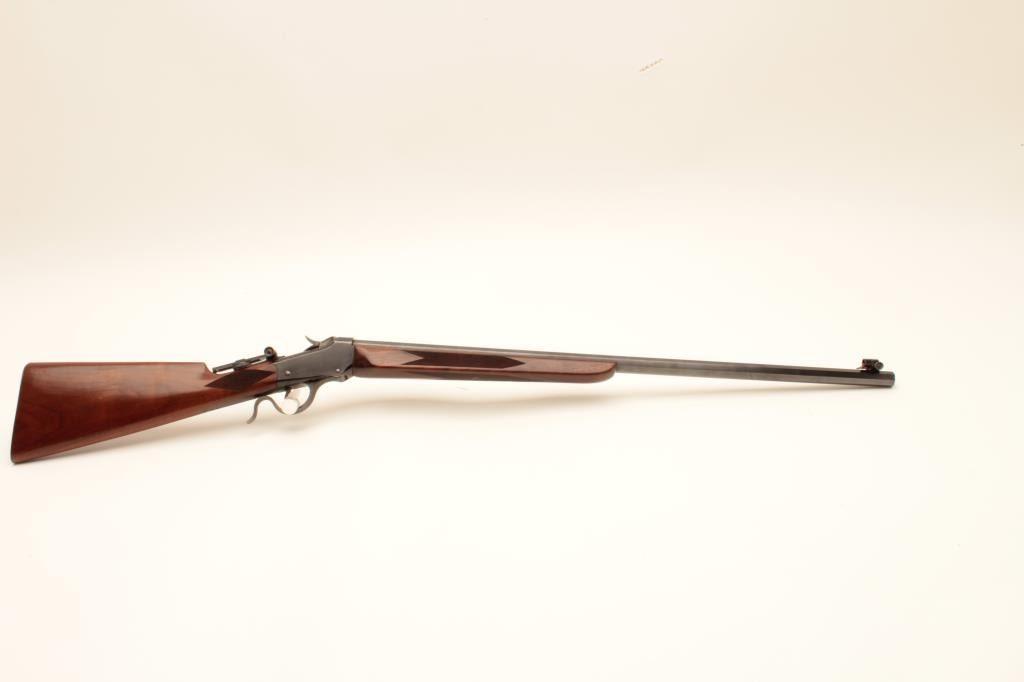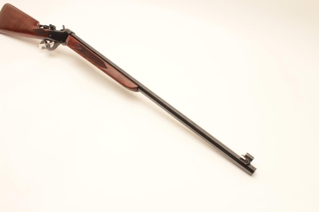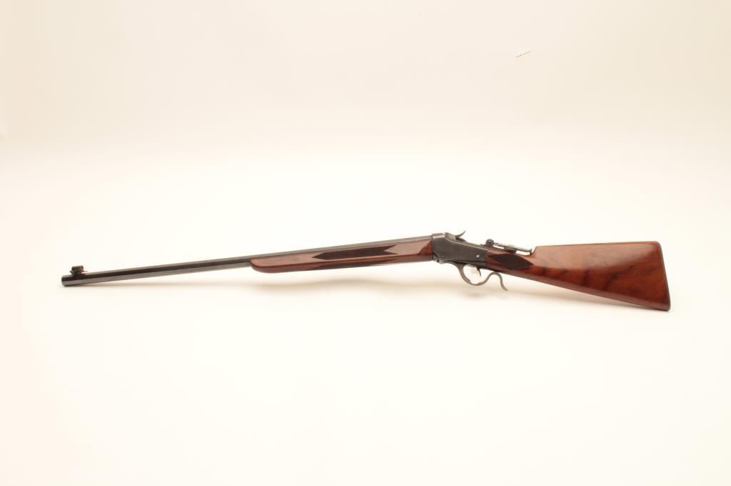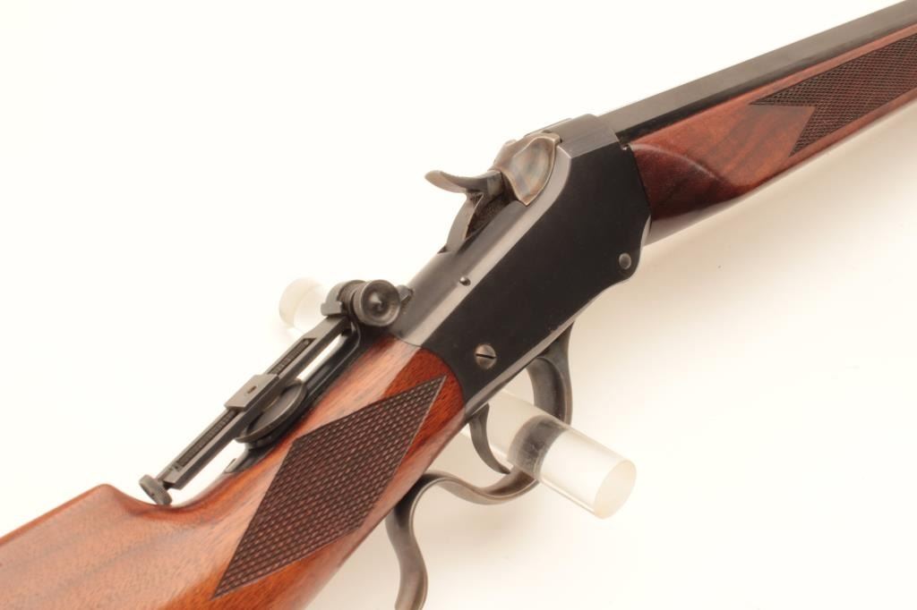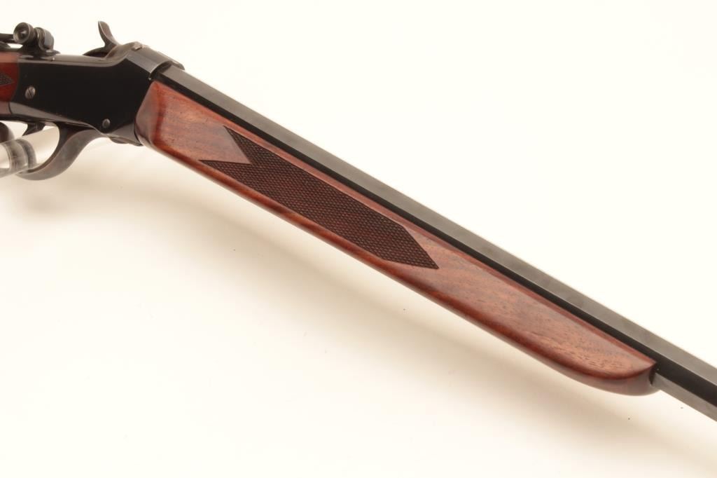 Winchester Low-Wall single shot rifle, .22 Long Rifle caliber, Serial #104873. The rifle is in fine overall condition as re-finished. The 28” octagon barrel has had a globe style front sight added and retains nearly Lot Title all of an old, quality re-blue. The receiver also retains nearly all its blue finish with beautiful case hardening on the breech block, hammer and trigger guard. A Vernier style tangent sight has been added at the Lot Title tang. The custom checkered wood stocks are in very good condition with sharp checkering and small mars. The fore end is a custom beavertail style and the butt ends with a checkered steel butt plate. The bore is Lot Title good, the action is crisp and markings are sharp. Est.: $800-$1,600. (C+R).