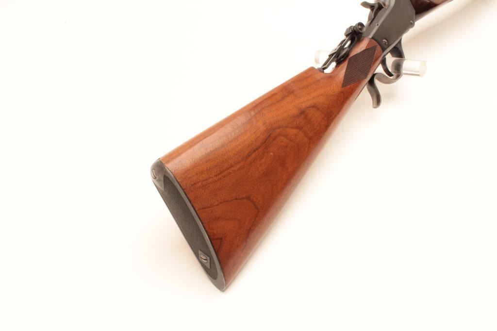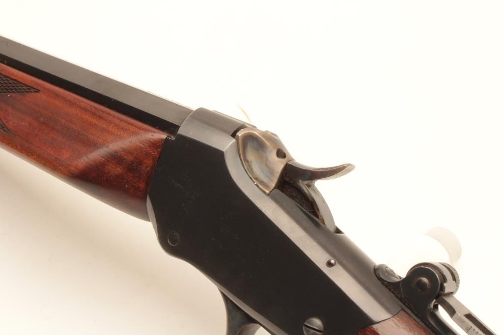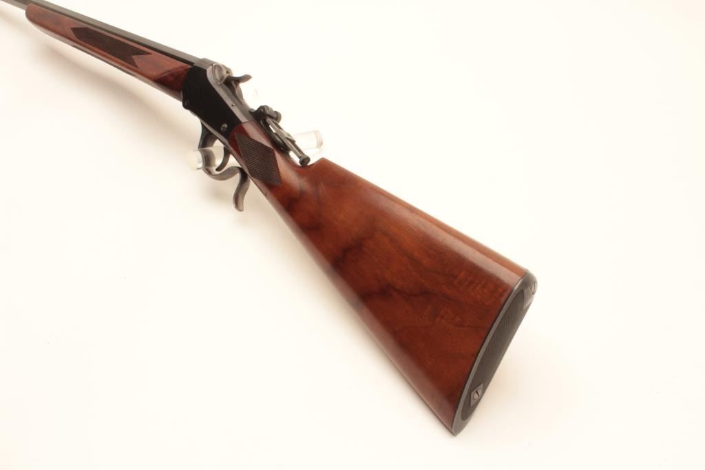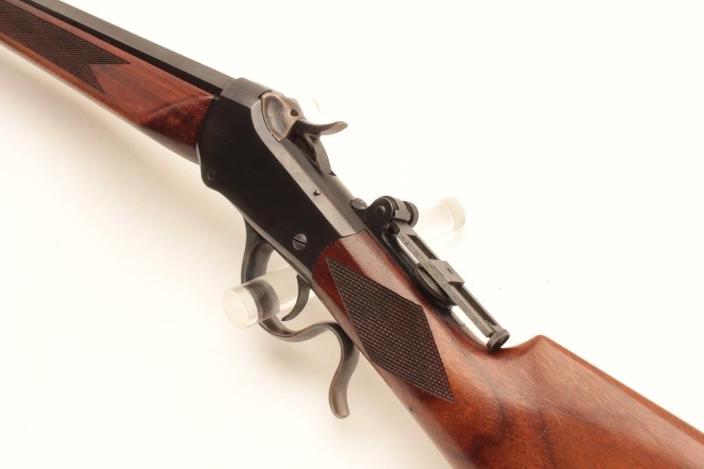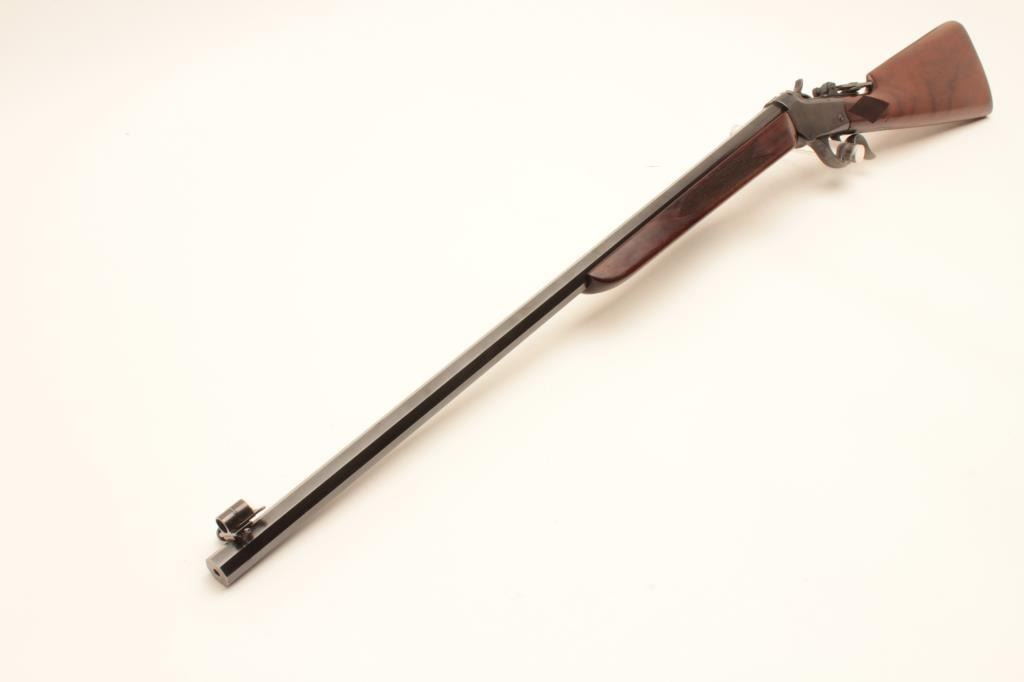 Winchester Low-Wall single shot rifle, .22 Long Rifle caliber, Serial #104873. The rifle is in fine overall condition as re-finished. The 28” octagon barrel has had a globe style front sight added and retains nearly Lot Title all of an old, quality re-blue. The receiver also retains nearly all its blue finish with beautiful case hardening on the breech block, hammer and trigger guard. A Vernier style tangent sight has been added at the Lot Title tang. The custom checkered wood stocks are in very good condition with sharp checkering and small mars. The fore end is a custom beavertail style and the butt ends with a checkered steel butt plate. The bore is Lot Title good, the action is crisp and markings are sharp. Est.: $800-$1,600. (C+R).
