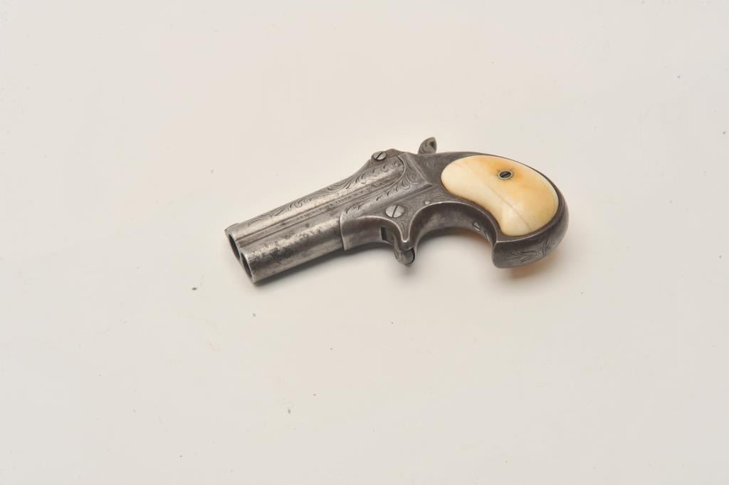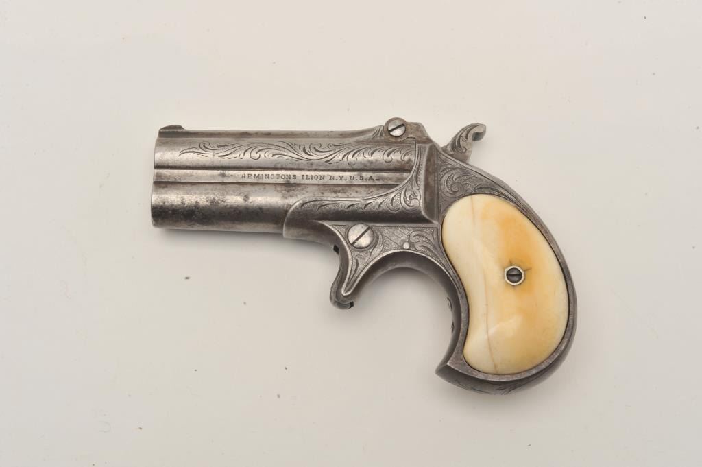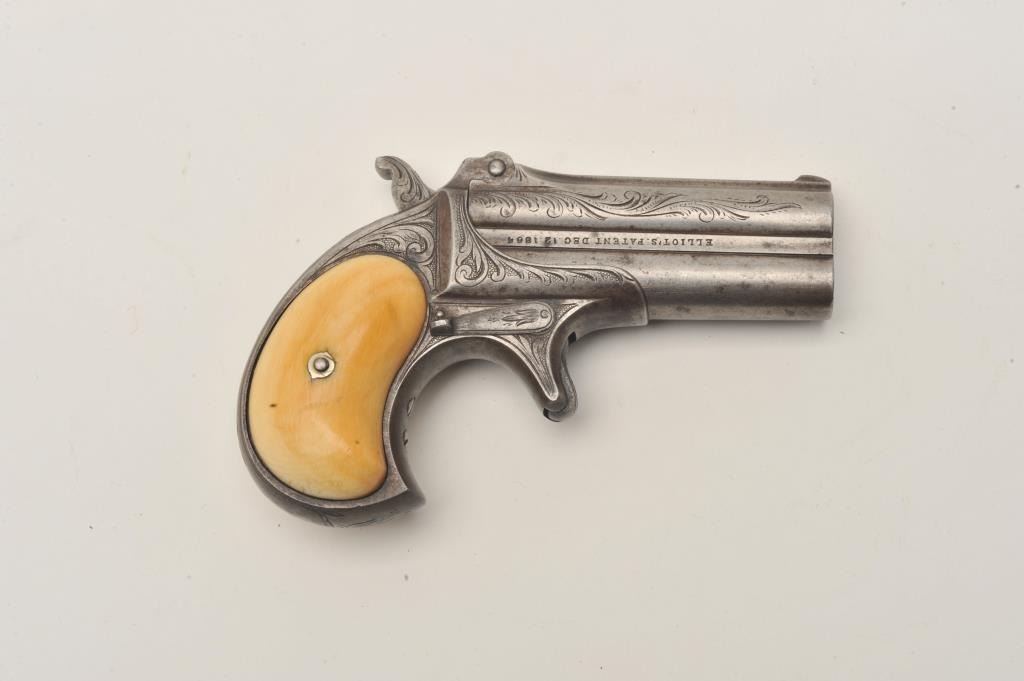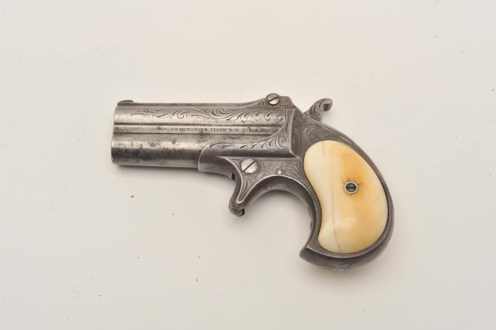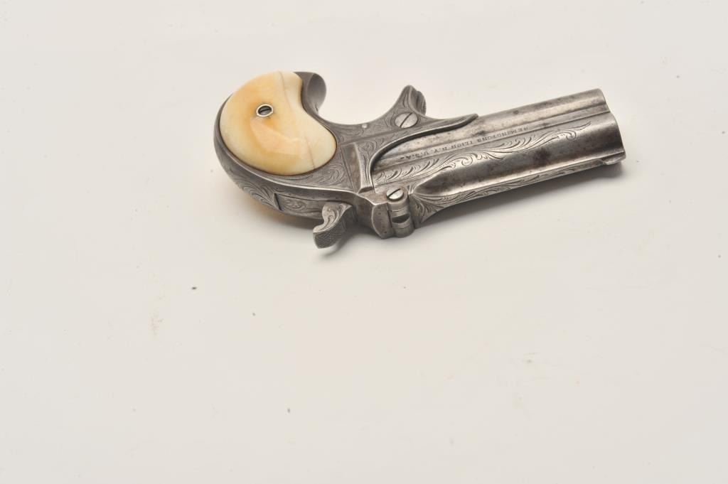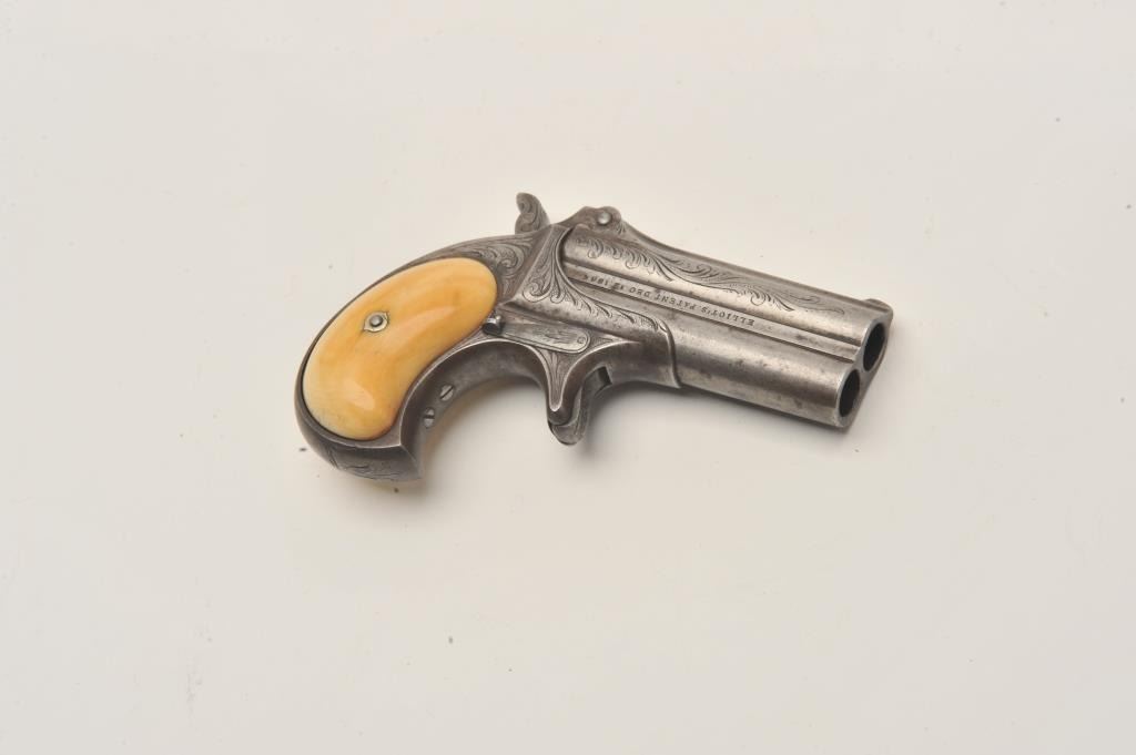 Remington Double Derringer in .41 rim fire with early production side address and no extractor, S/N 2016. The left side reads “Remin tons Ilion, N.Y. U.S.A.”. The right side reads “Elliot’s patent Dec 12, 18654”. Lot Title Very few known with this rare address (Est. less than 20). Other example is S/N 2003. Factory style light scroll engraved with original ivory grips. 40%-60% darkened silver finish going to patina ad uncleaned natural Lot Title state. Deep yellow patina on the grips with age crack and good to very good condition. Good markings and no cracks. Good overall. The rarest barrel address variation! The collection of Doug Drummond with a copy of Lot Title his book. (Antique) Est.: $3000-$5000