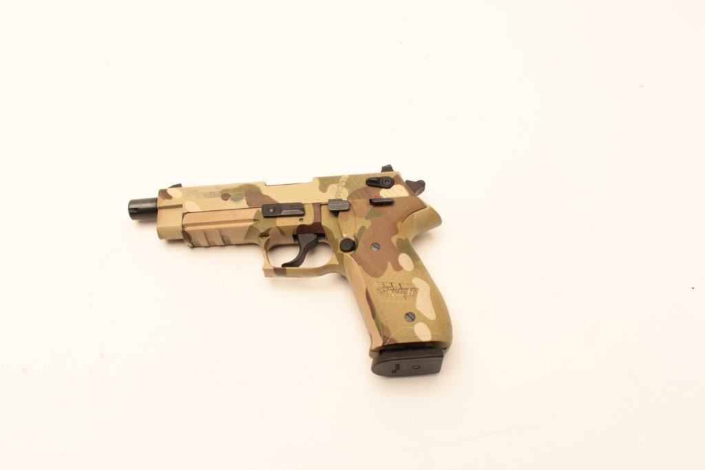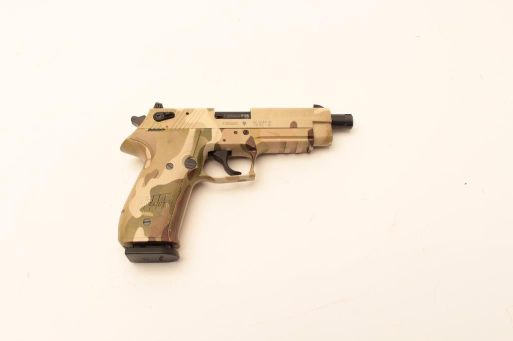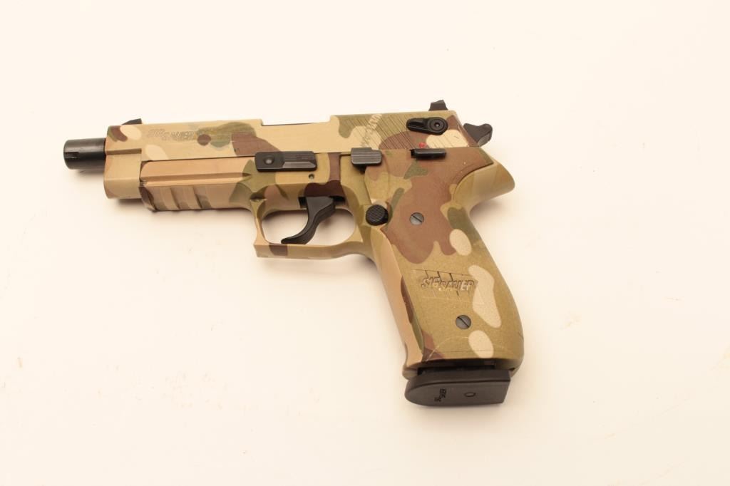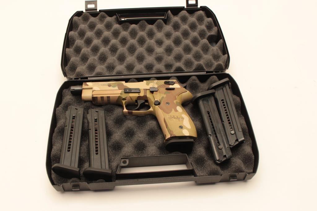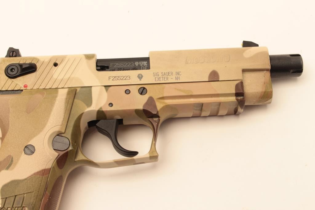 Sig Sauer Mosquito, #F255223, .22 LR, camouflage finish, accessory rail, 4 3/4" barrel, 3 dot drift adjustable sights. Pistol remains in fine condition overall, showing little signs of use. Includes Lot Title factory hard case, 5 magazines, manual and accessories. (Modern / PPT) Est $300-600