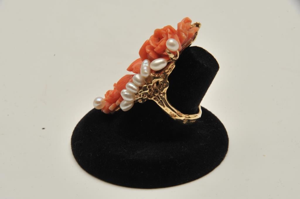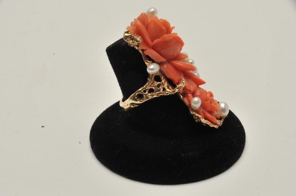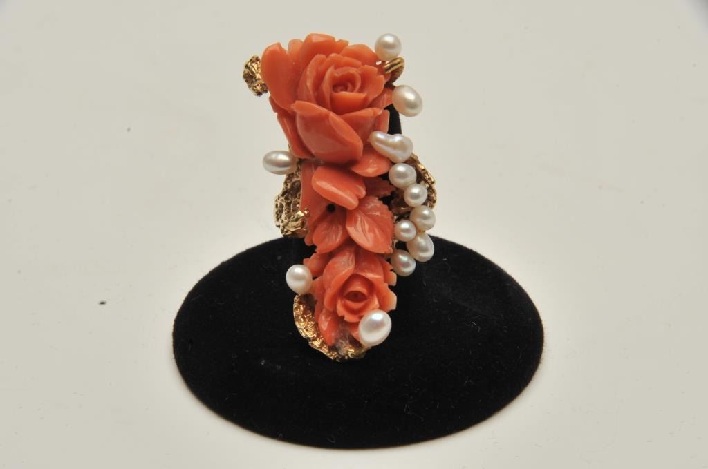One custom designed ring set with a unique carved corral adorned by fine biwa pearls Est:$3,000-3,500
