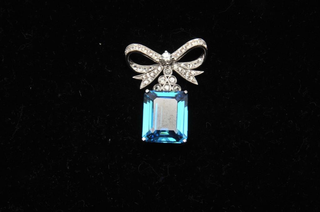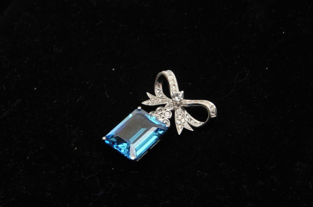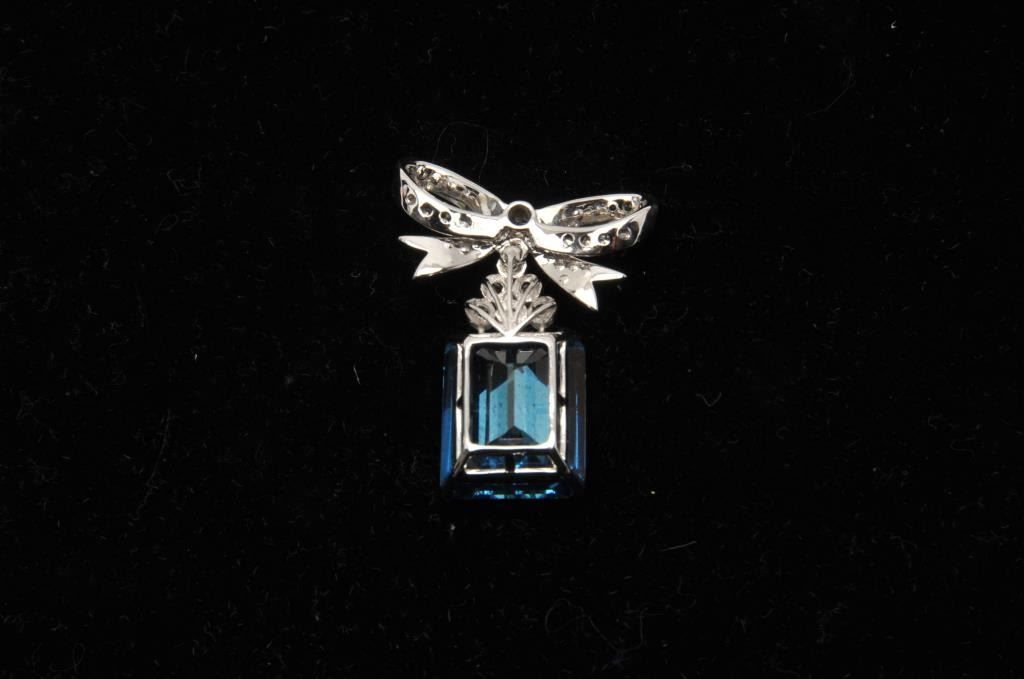 One blue topaz pendant in 18k white gold with a attractive bow-tie clasp set with white sapphire Est:$750-850
