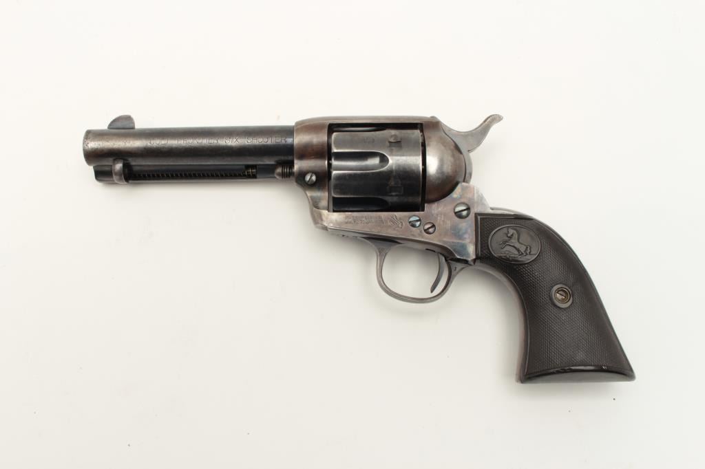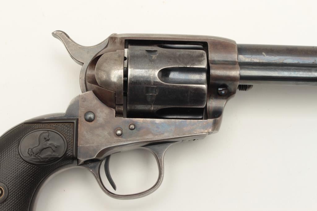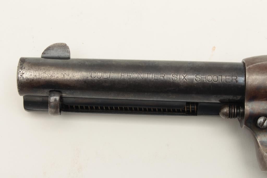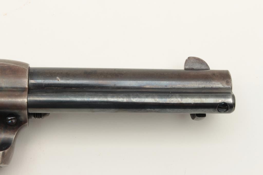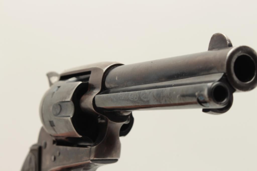 Colt Single Action Army 1st generation in .44-40 caliber with a 4 ¾” barrel, S/N 328963. Very good plus original condition with 50% blue and case colors. Good grips with some wear and minor imperfections. Sharp Lot Title markings. Front sight is its full height with some nicks and small marks at the muzzle. Crisp action and bright bore. All matching desirable roll die marked “Colt Frontier Six Shooter”. Some very bright areas Lot Title of finish where protected. Collector’s quality. Factory letter confirms features and shipped to Chas. Ilfeld & Co., Albuquerque, N.M., Aug. 12, 1914 with 4 guns in shipment. (C&R/PPT) Est.: $3000-$6000