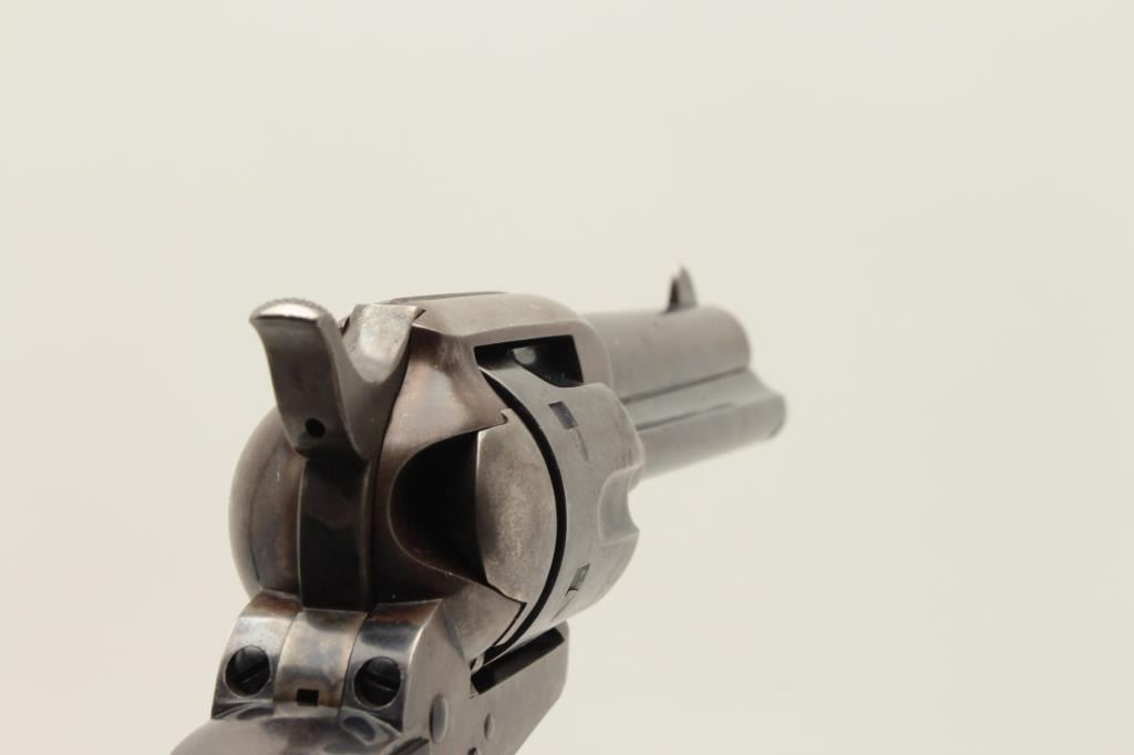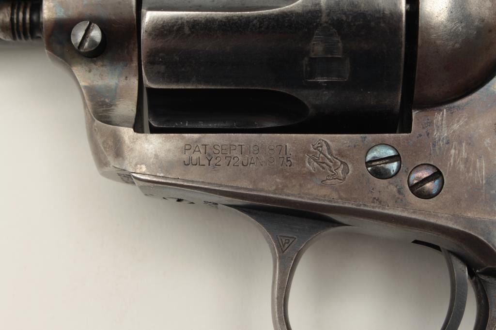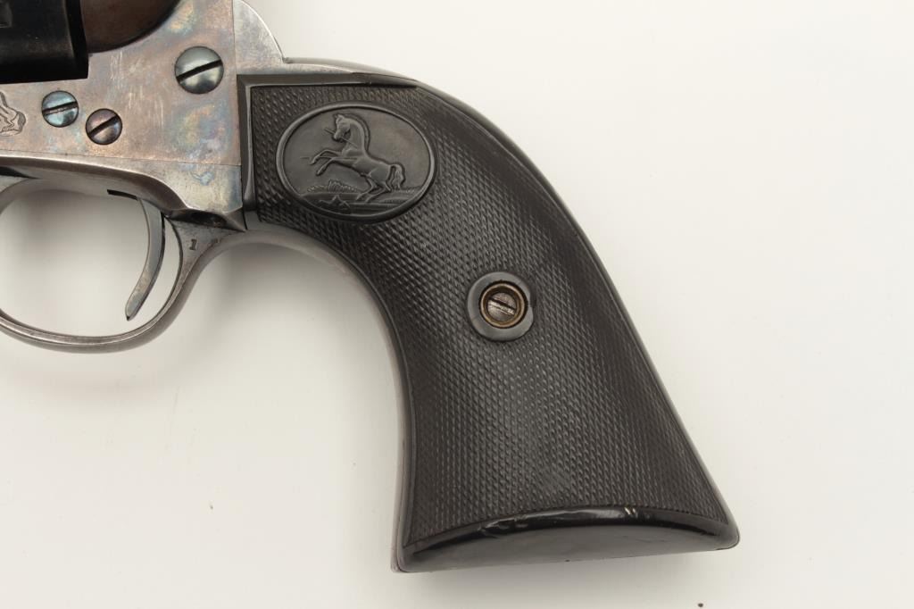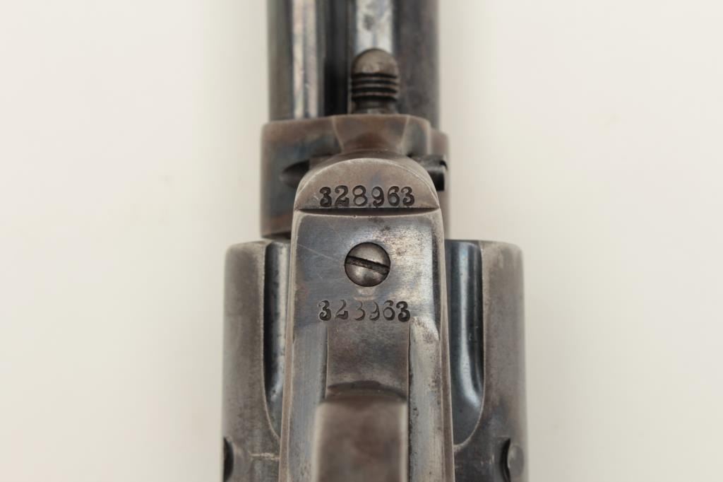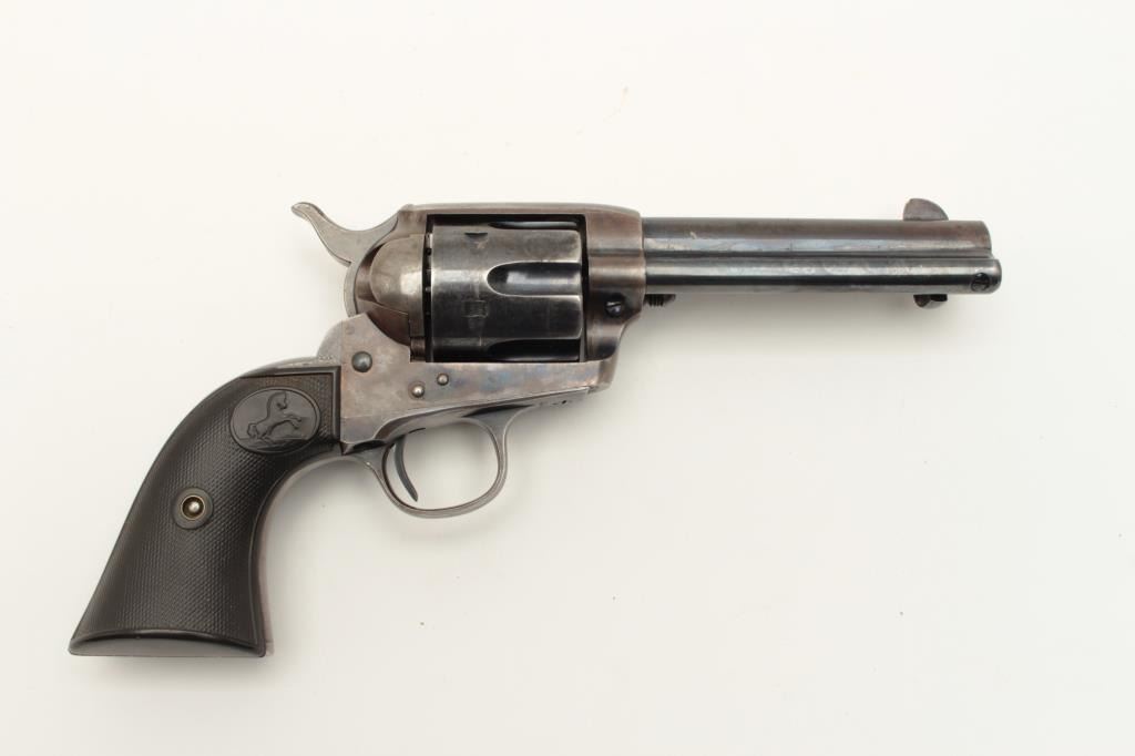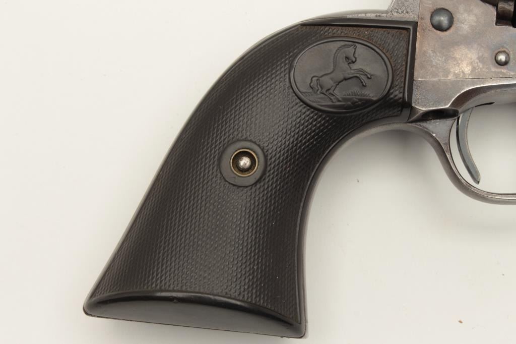 Colt Single Action Army 1st generation in .44-40 caliber with a 4 ¾” barrel, S/N 328963. Very good plus original condition with 50% blue and case colors. Good grips with some wear and minor imperfections. Sharp Lot Title markings. Front sight is its full height with some nicks and small marks at the muzzle. Crisp action and bright bore. All matching desirable roll die marked “Colt Frontier Six Shooter”. Some very bright areas Lot Title of finish where protected. Collector’s quality. Factory letter confirms features and shipped to Chas. Ilfeld & Co., Albuquerque, N.M., Aug. 12, 1914 with 4 guns in shipment. (C&R/PPT) Est.: $3000-$6000