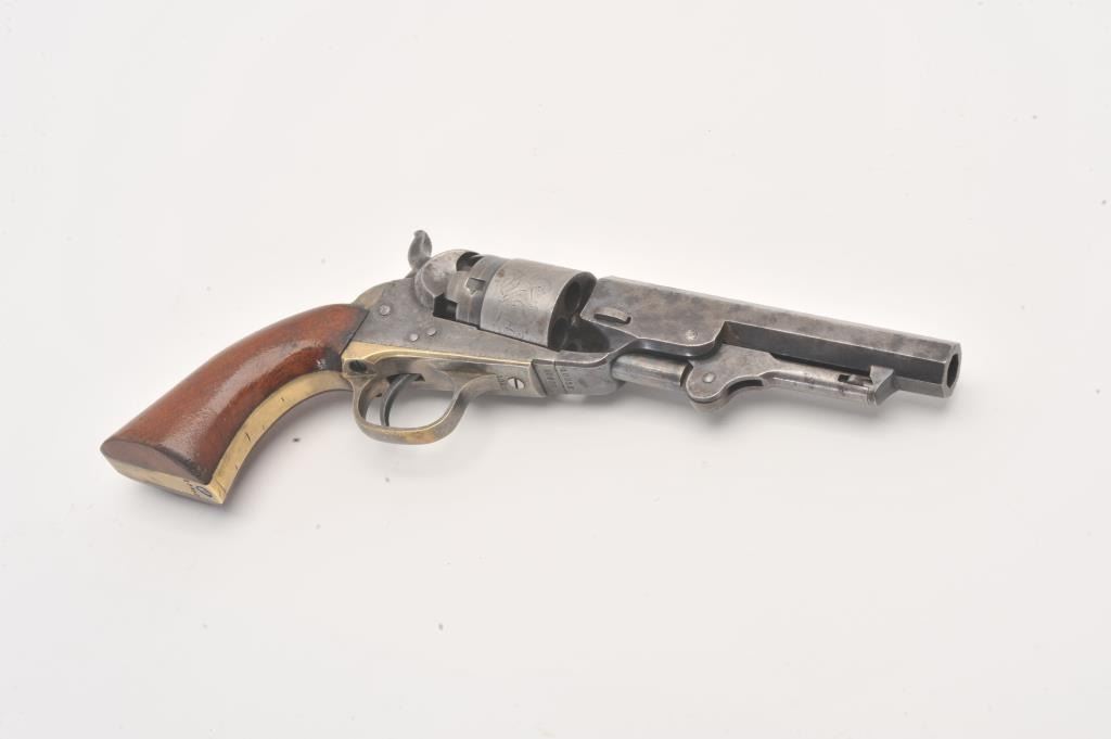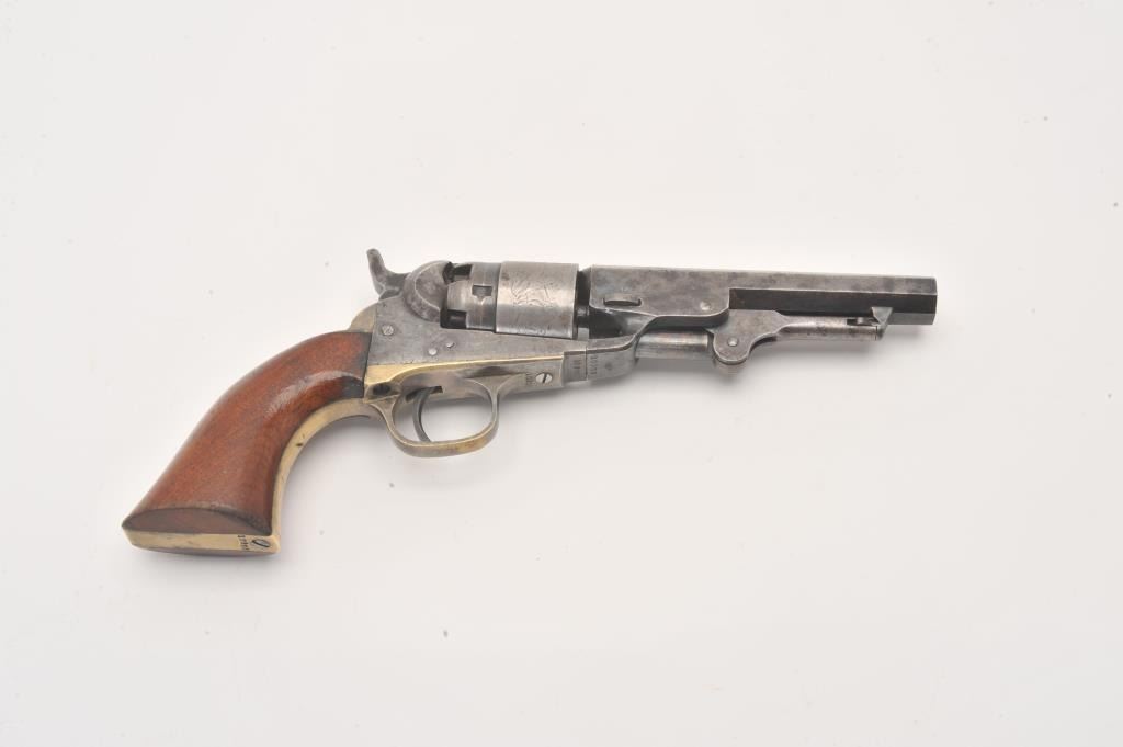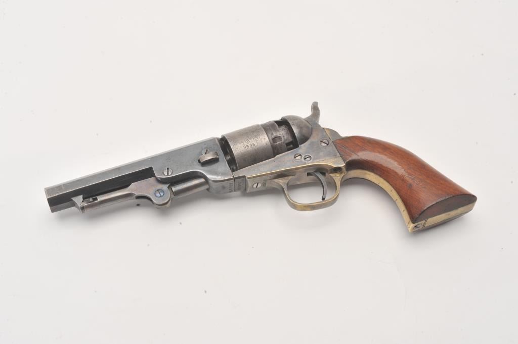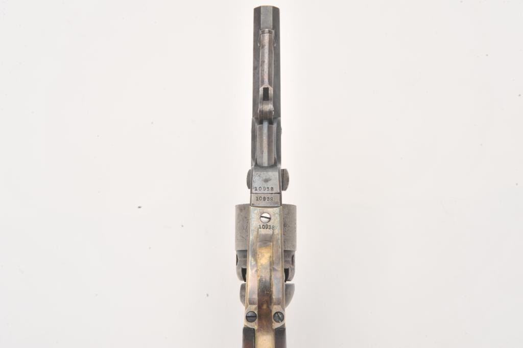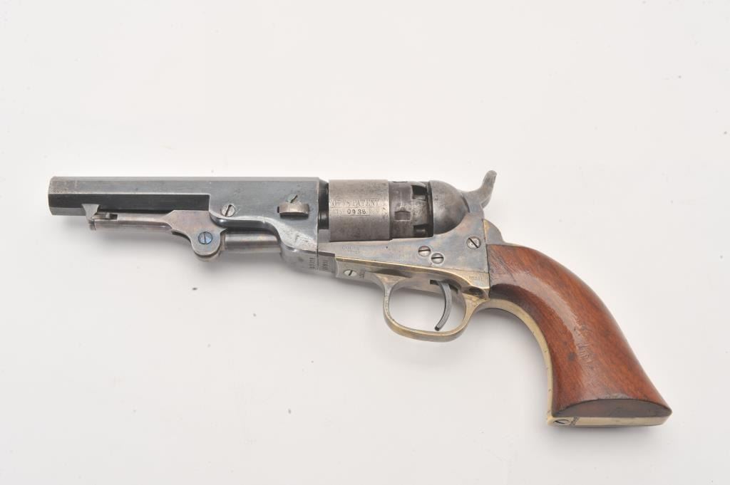 Colt Pocket Navy in .36 caliber percussion with a 4 ½” barrel in near fine condition, S/N 10938. Inventory sheet from Charles DuPont collection indicates purchase from Kimball Arms catalog 12-8-41. 75%-85% bright Lot Title inky blue finish on the barrel erosion and pitting just starting mostly on the right side. The cylinder shows 10%-20% blue mostly on the back and balance drifted with 75% light scene. The frame shows 50%-70% case Lot Title colors that are fairly vivid on the left and drifting to patina on the right. Traces of silver on the straps. The grips show 75%-85% varnish and are near fine. The hammer and rammer show 75% plus on the left. 30%-40% on Lot Title the right. Sharp markings and tight. All matching. An 8 on a 1-10 scale. (Antique) Est.: $3000-$6000