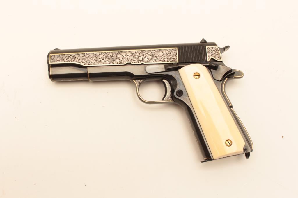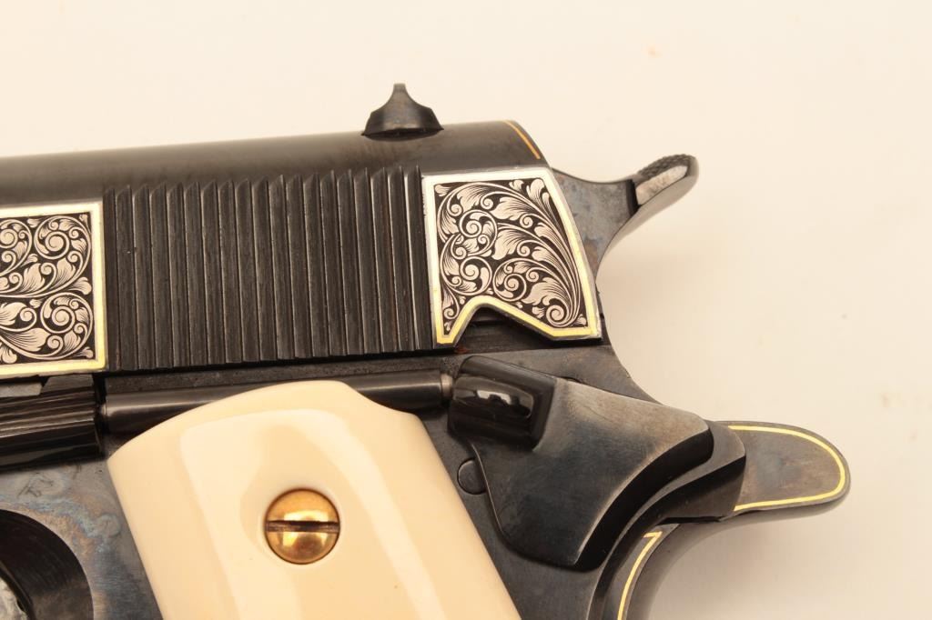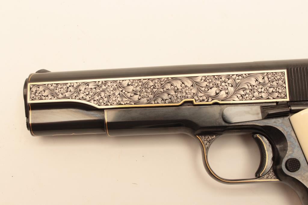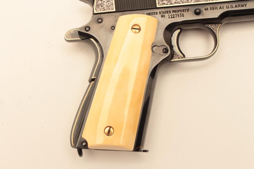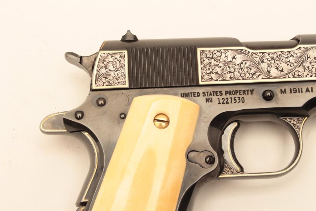 Colt Model 1911A1 U.S. Property marked, S/N 1227530. Finely custom engraved with fold border and line work by Sam Welch. High polish royal blue with satin gray panels on each side of the slide. Ivory grips. Lot Title Excellent as refurbished condition. Exceptional quality work. From Riverside Collector’s estate. (C&R/PPT) Est.: $2000-$4000