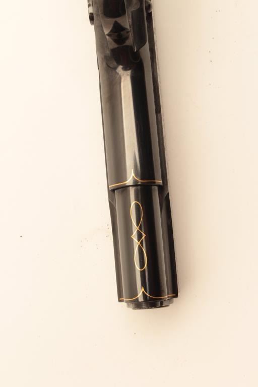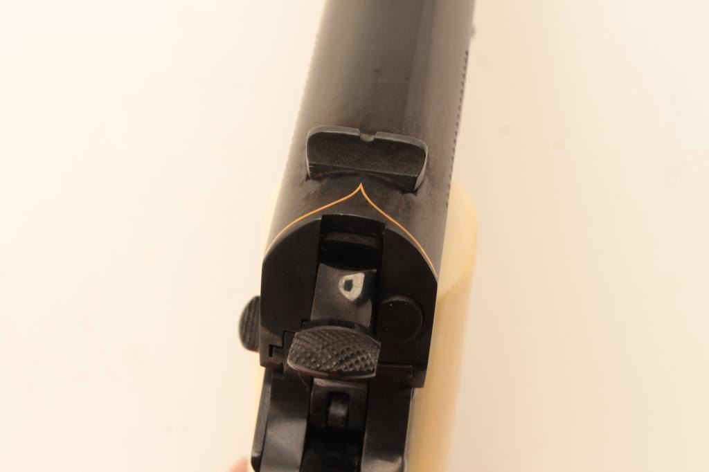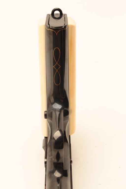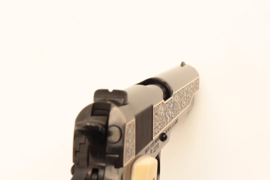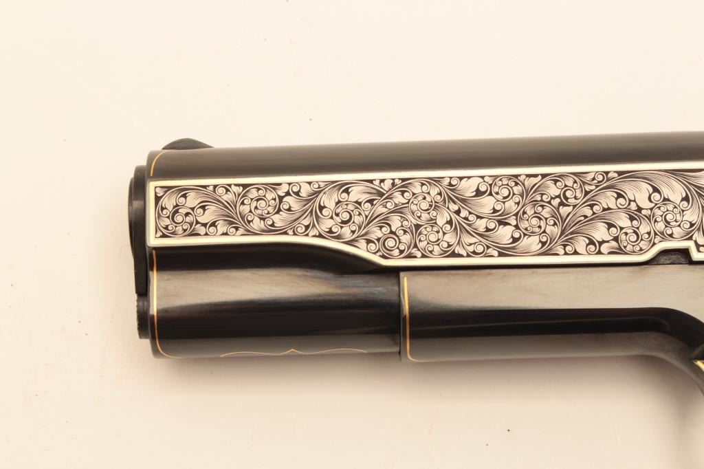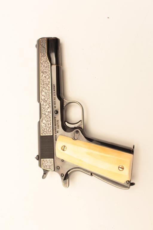 Colt Model 1911A1 U.S. Property marked, S/N 1227530. Finely custom engraved with fold border and line work by Sam Welch. High polish royal blue with satin gray panels on each side of the slide. Ivory grips. Lot Title Excellent as refurbished condition. Exceptional quality work. From Riverside Collector’s estate. (C&R/PPT) Est.: $2000-$4000