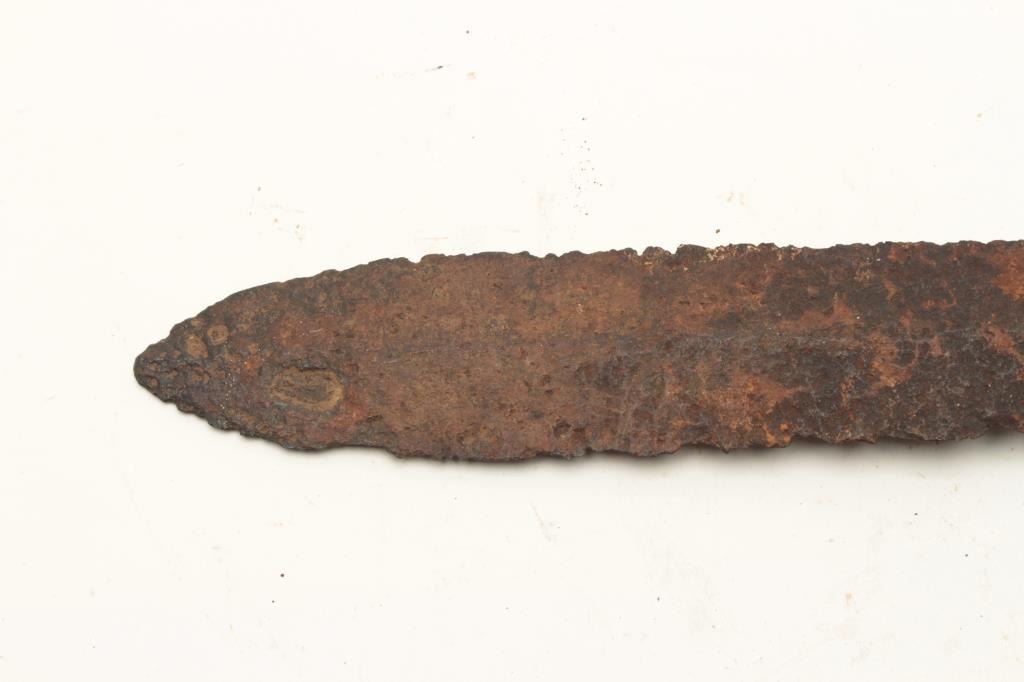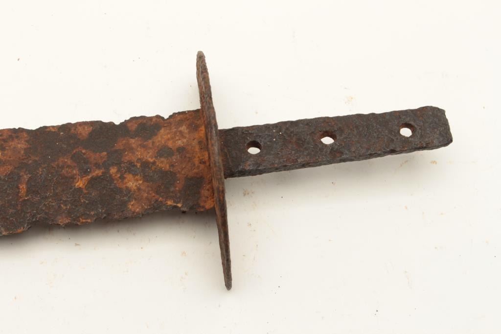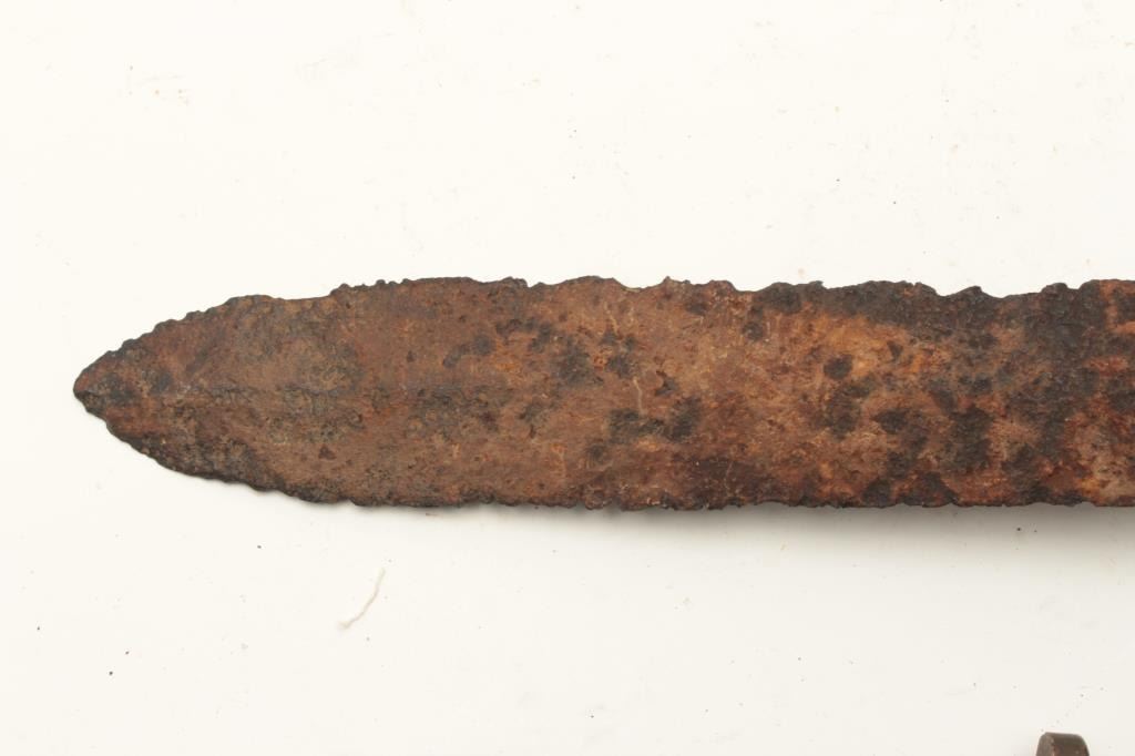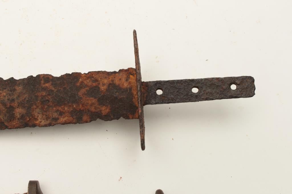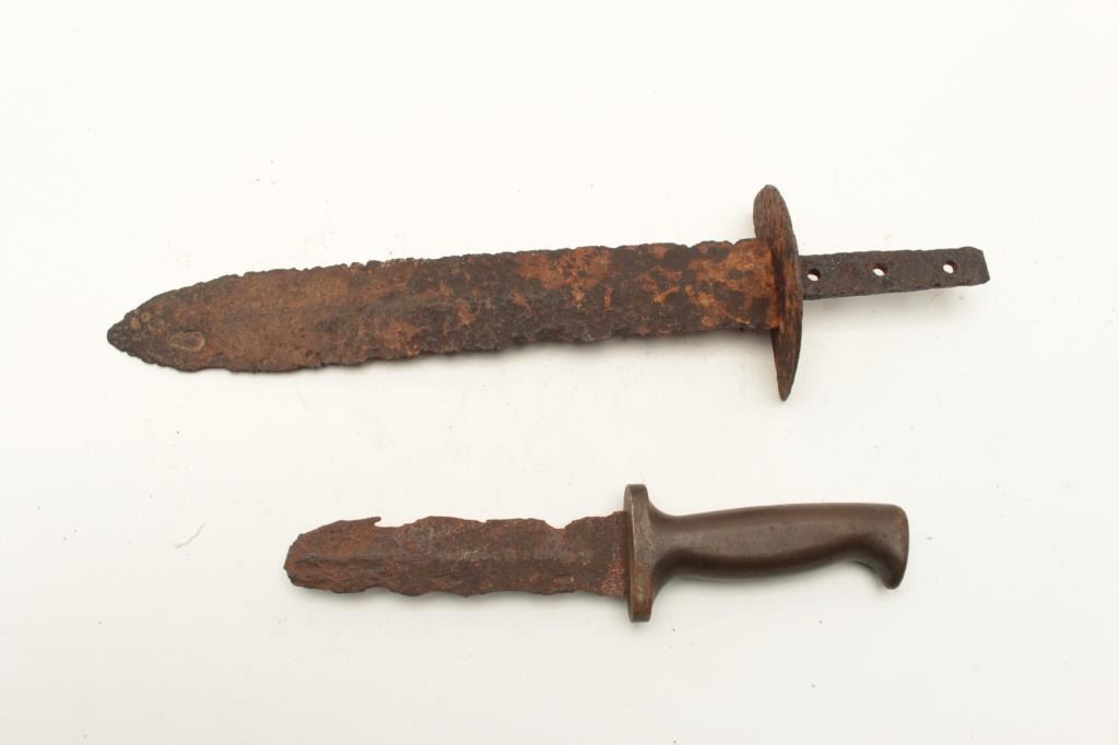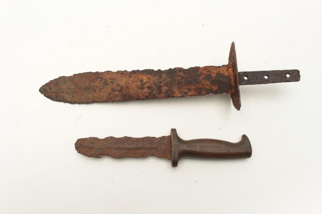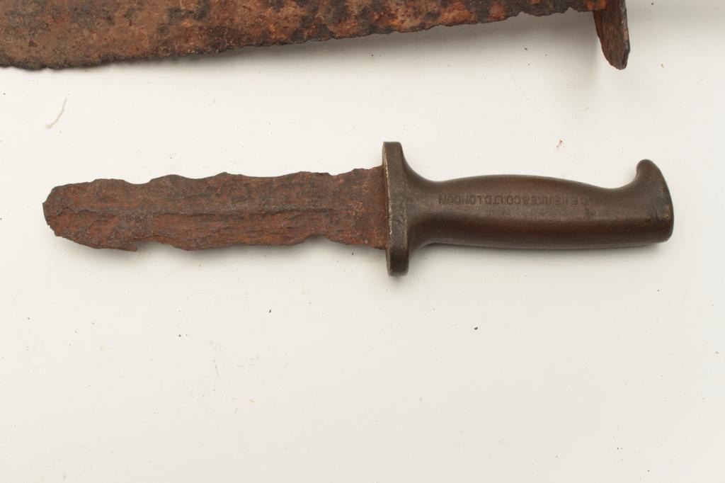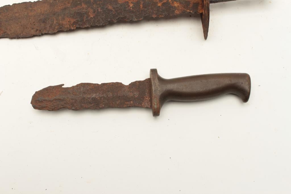 Lot of 2 rusty relic blades including a Civil War era battlefield relic short sword, heavily rusted and a brass gripped Diver’s knife marked “C. E. Heinke & Co./London”. From the collection of John O. Beckwith. Lot Title Est.: $250-$500.