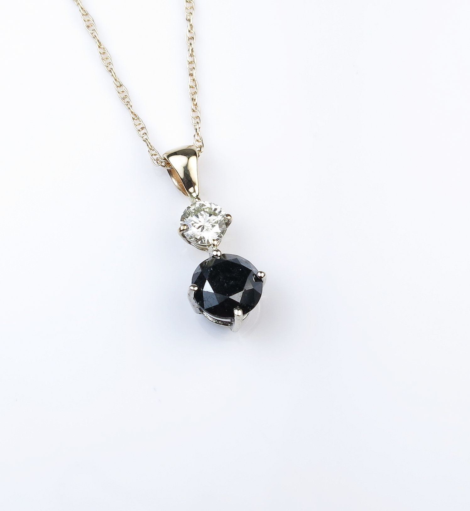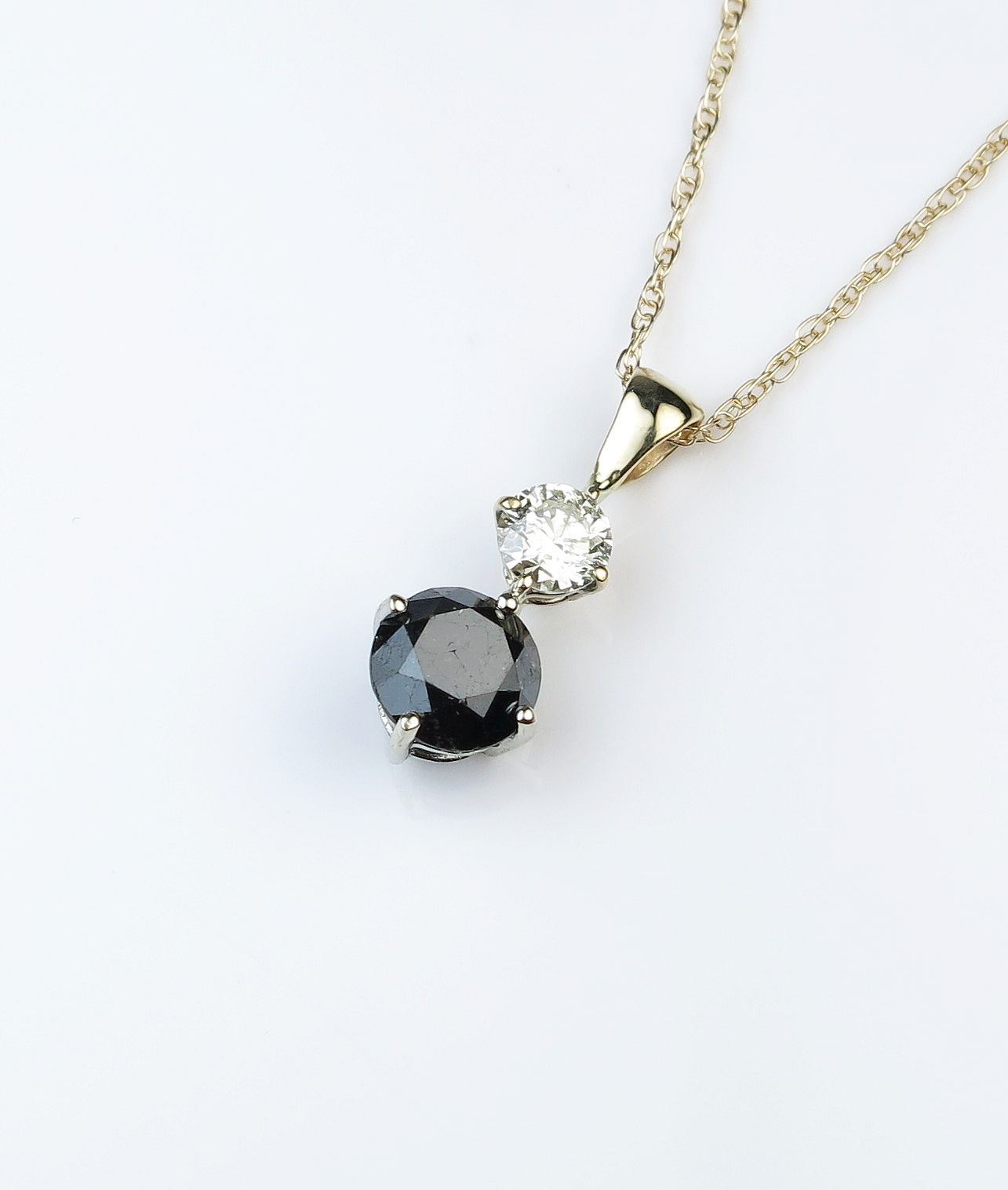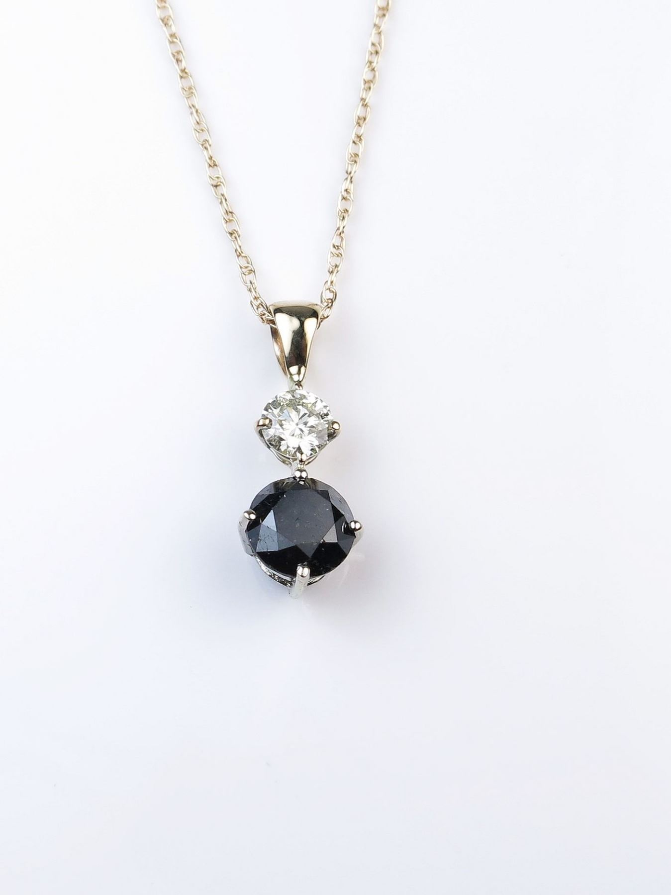 Elegant Black and White Diamond pendant featuring a 2.00 carat round Black Diamond accented with approx. 0.50 carat White Diamond with H-I color set in 14/10 karat combination white gold. Retail $4,000- Lot Title $5,000 Estimate $2,000-$3,000