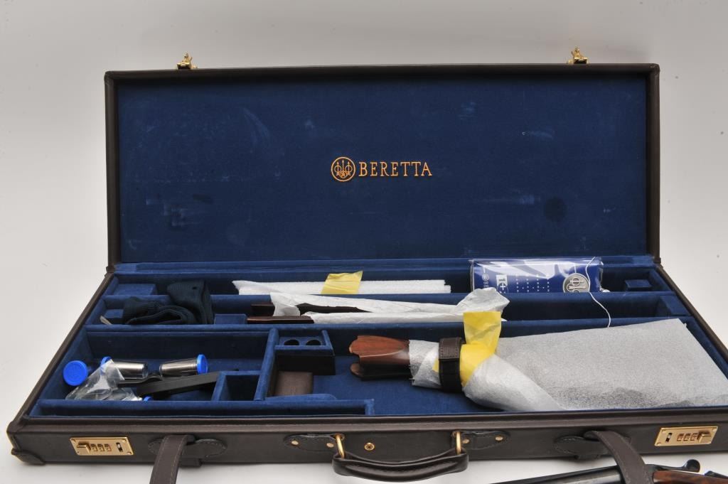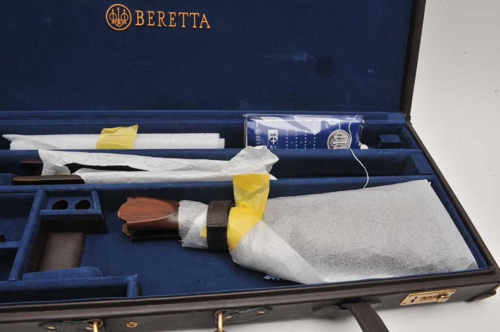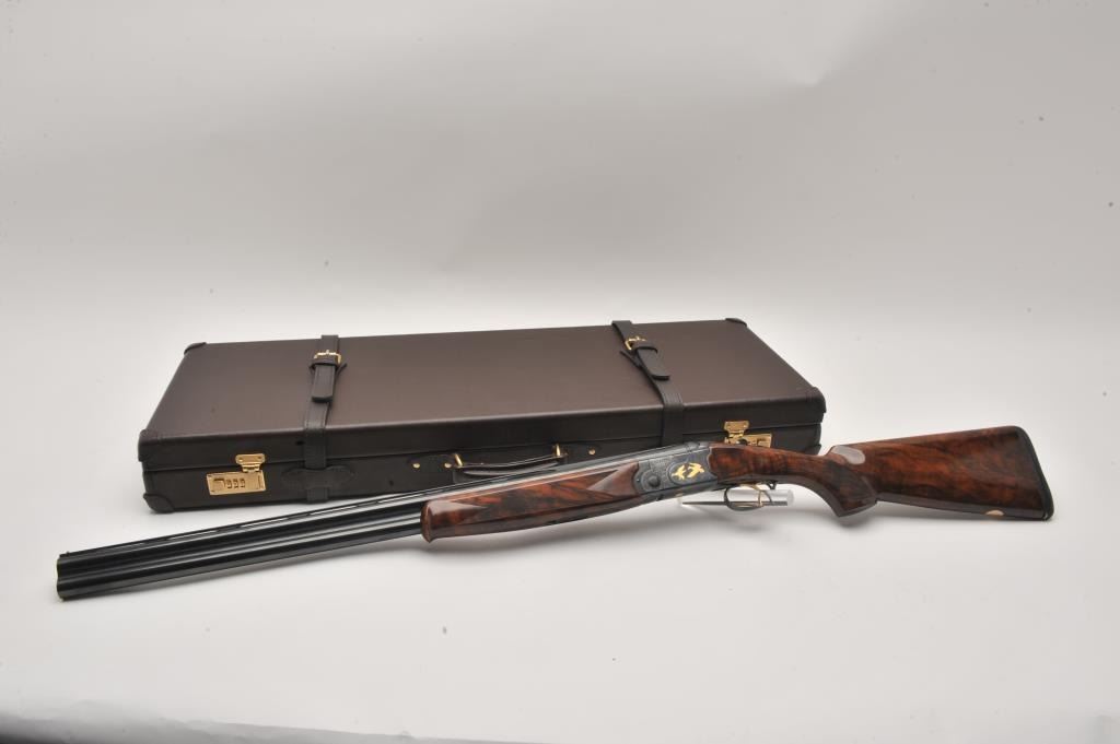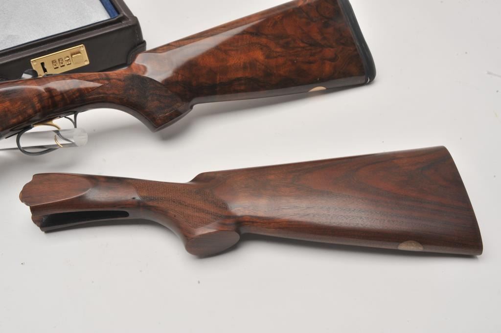 Beretta 687 Silver Pidgeon IV 12GA O/U shotgun with a 28” low rise vent rib barrel, single trigger, auto ejectors, gold birds and engraved backgrounds, select burl wood checkered custom stock, S/N RO4935S. Also Lot Title Beretta luggage case with factory stock and extra chokes (6 total). Measures 14 ¼” to the end of the wood and 14 ¾” to the end of the pad. Fine to excellent used condition. 97%-99% overall. (Modern) Est.: $3000-$6000