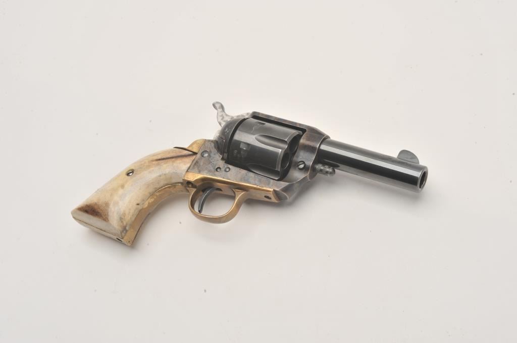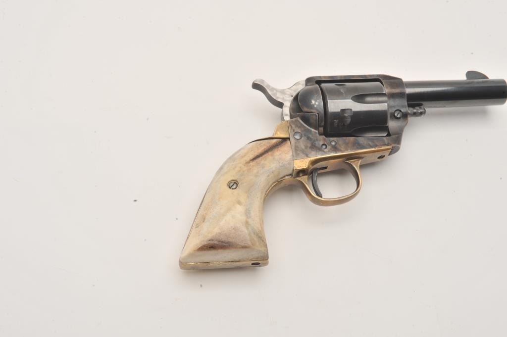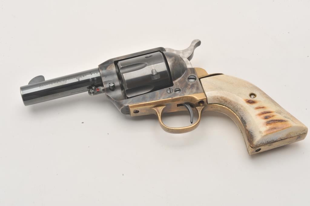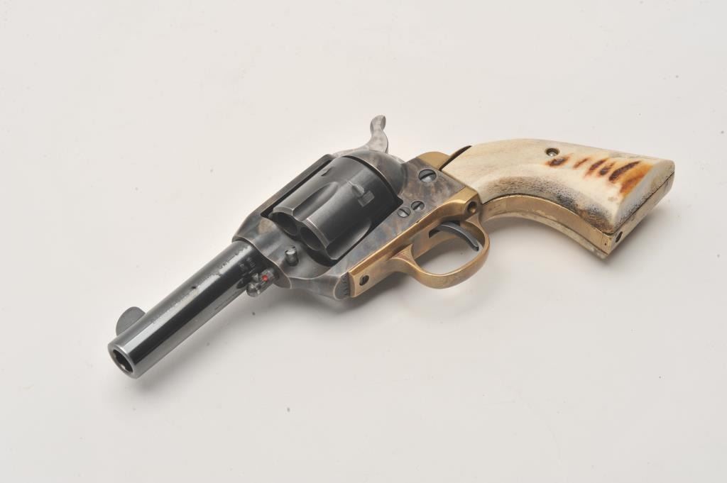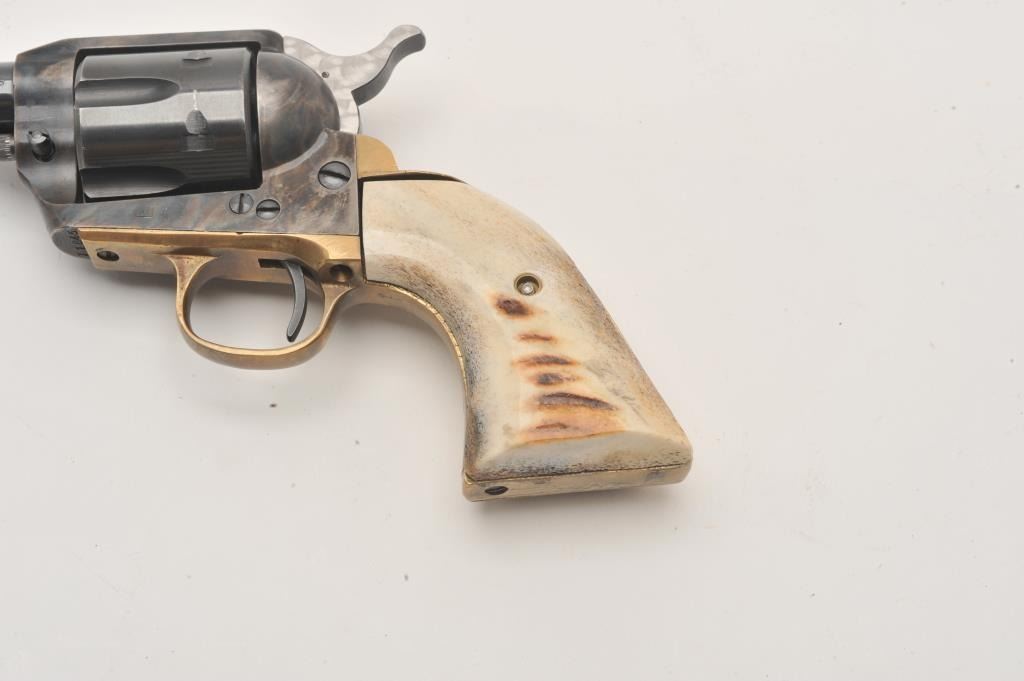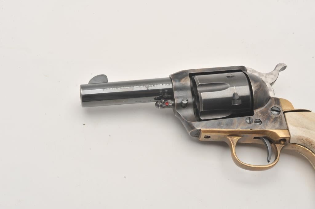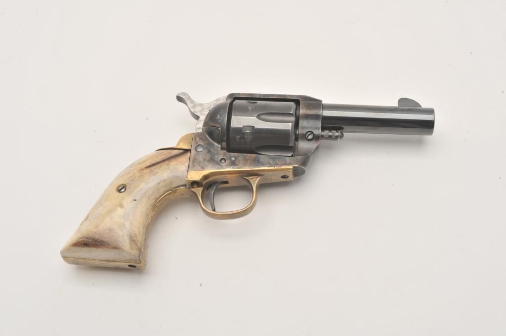 Dakota Arms 1873 Sheriffs model SA, #71845, .45 Colt cal., 3 1/2" barrel, blue and color case hardened finish, jeweled hammer, with brass backstrap and stag grips. Revolver is in excellent condition. (Modern / PPT) Est. Lot Title $350-700
