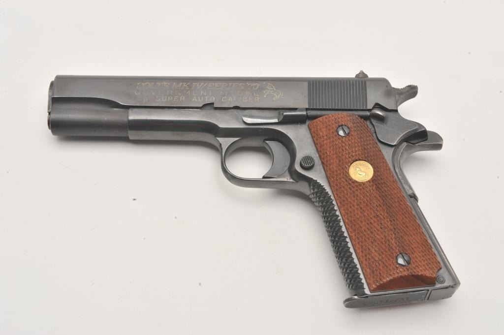 Colt Government Model 38 Super on renumbered Colt frame, #S165533, checkered front strap and front of trigger guard. Very good as reblued and rebuilt. One mag. (Modern / PPT) Est. $750-1500