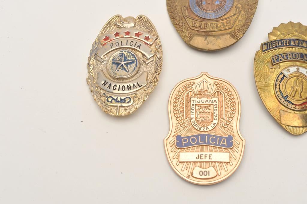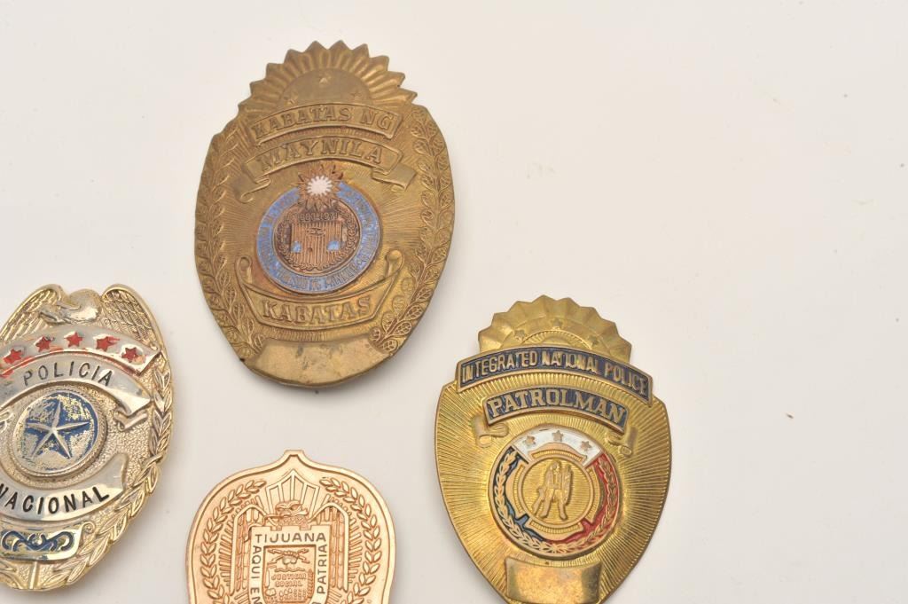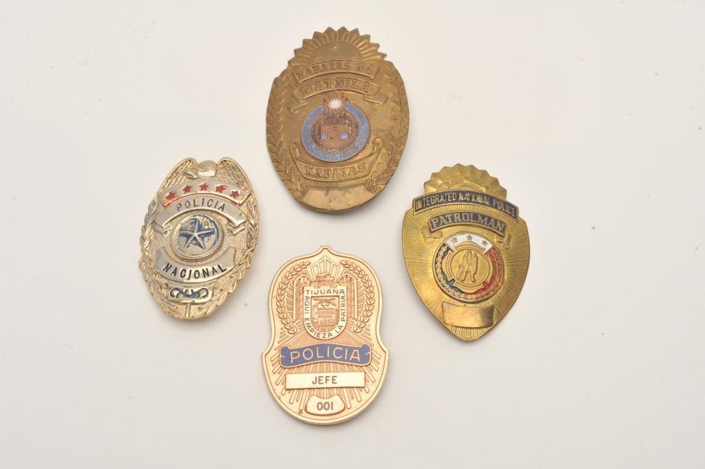Lot of 4 badges including A Policia Nacional badge (no hallmark), a “Jefe” marked Tijuana Policia badge (001/paper tag notes 10K Chief’s badge), an Integrated national Police Patrolman badge (no hallmark) and a shield Lot Title badge marked KABATAS NG/MAYNILLA/KABATAS with enameled center piece dated 1963-1971). Est.: $200-$400.