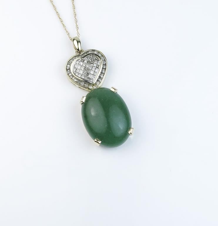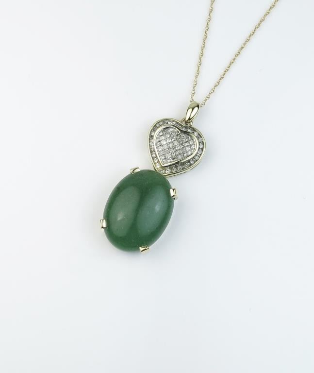Elegant Jadeite and Diamond pendant with Jade weighing approx. 14.30 carats accented with approx. 1.00 carat in Diamonds of H-I colors and VS/SI clarity set in a 14/10 karat yellow gold combination. Retail $1,200-$1,800 Lot Title Estimates $800-$1,200