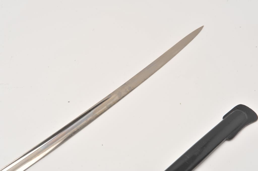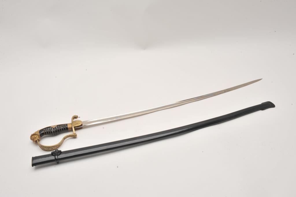 German Weimar Republic Pre-Nazi era cavalry officer’s sword in almost fine condition with scabbard. Minor dents in the scabbard. Excellent blade. Est.: $200-$400