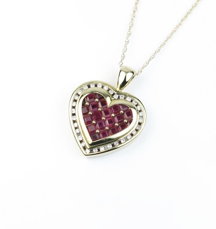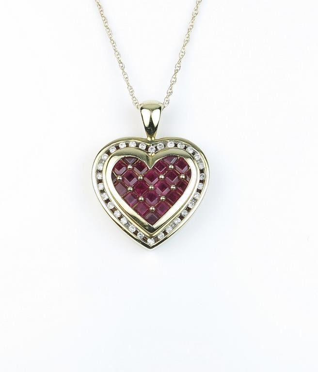 Gorgeous “KEEPSAKE” heart shaped Ruby and Diamond pendant beautifully made piece featuring 21 invisible set Rubies and 30 channel set Diamonds with approx. 3.00 combined gem weight set in 14 karat yellow Lot Title gold. Retail $2,000-$2,800 Estimates $800-$1,200