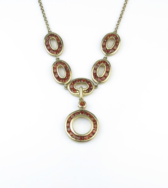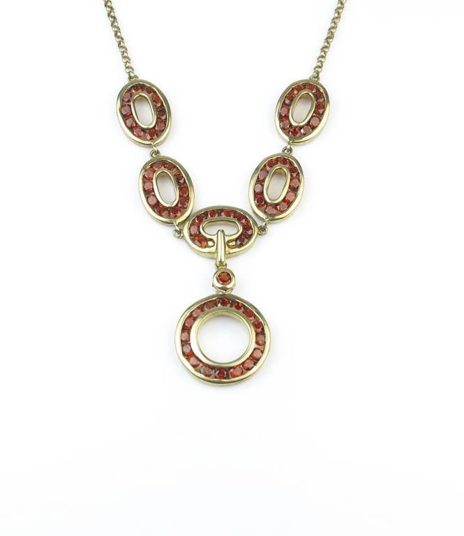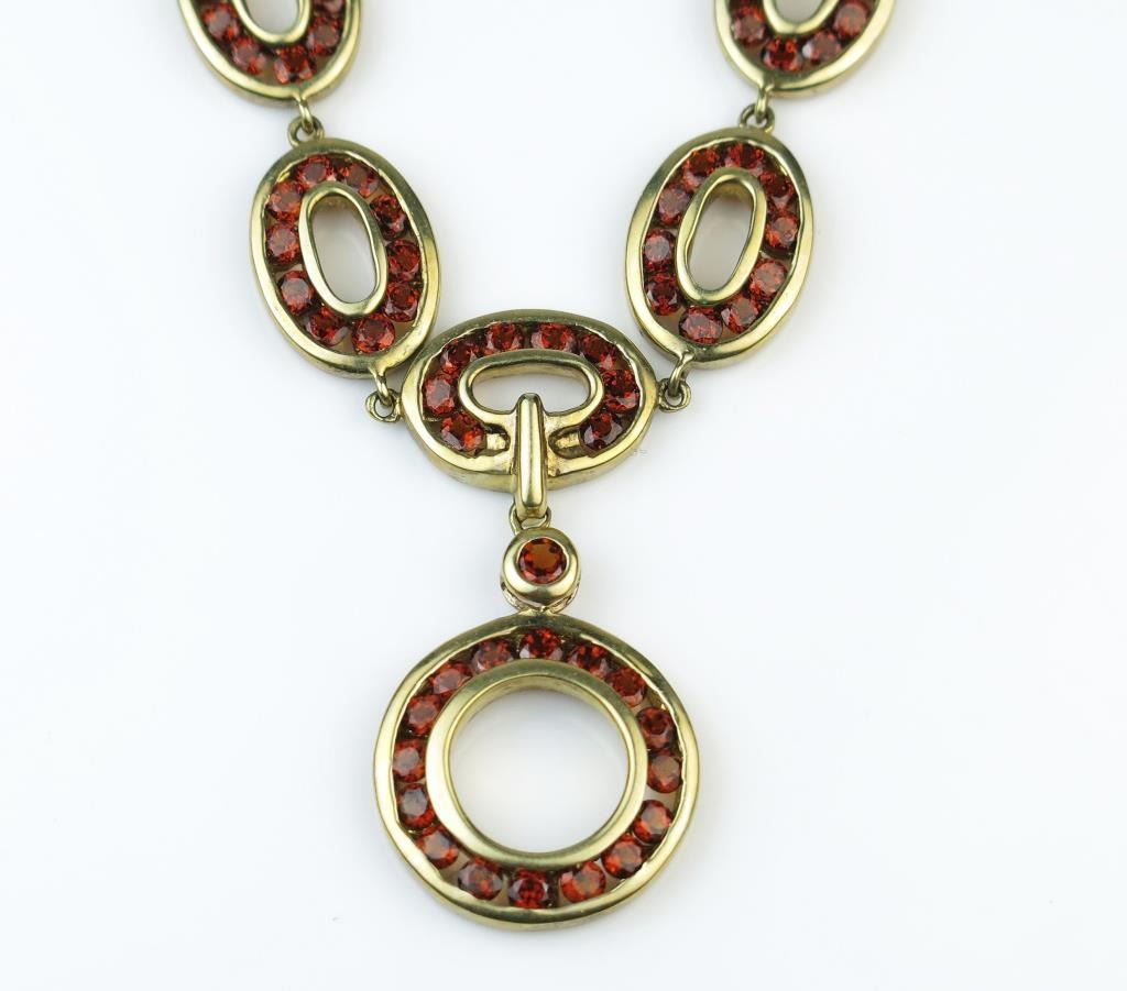Stylish red Garnet fashion necklace with linked design set with 67 red Garnets weighing approx. 3.00-4.00 carats total set in 10 karat yellow gold. Estimate $1,000-$1,500